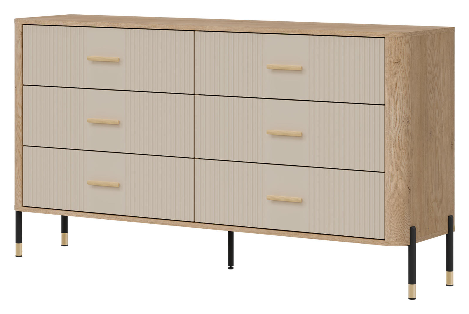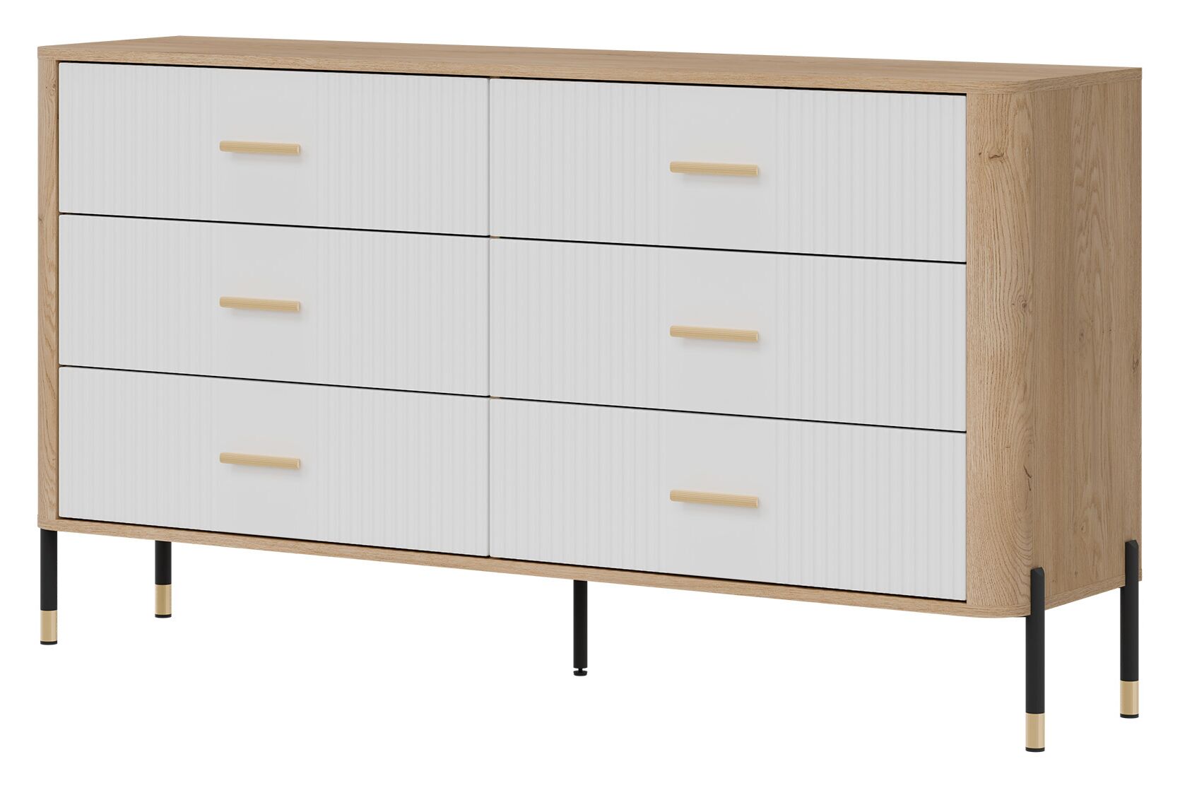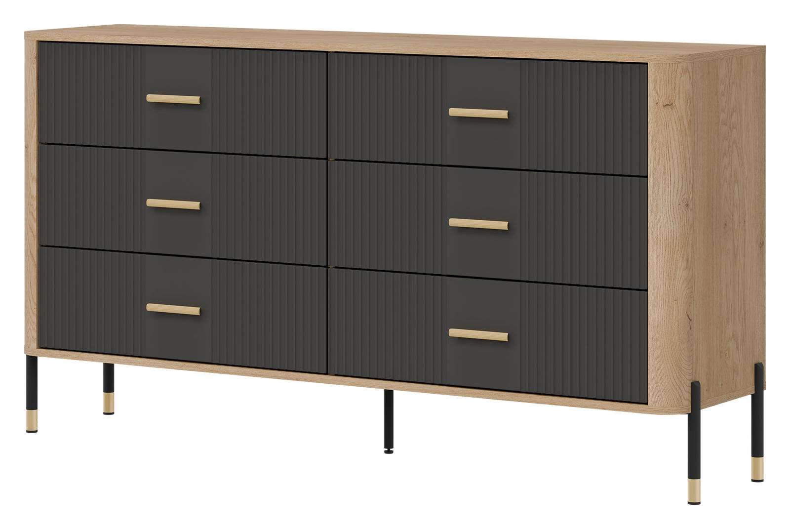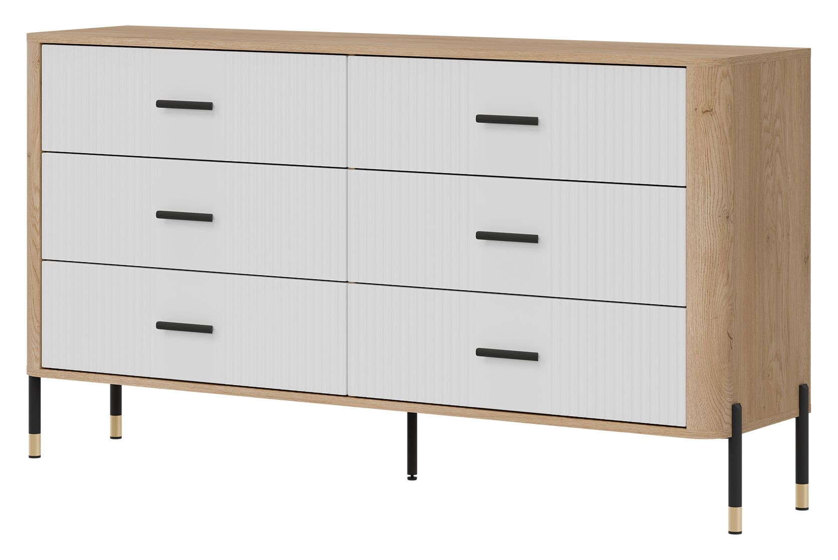 Korpusas pagamintas iš 16 mm storio LMDP plokštės, padengtos šilta ąžuolo Cremona Torro spalva. Šoninės detalės – iš tvirtos 32 mm MDF plokštės, o 18 mm MDF fasadai – pasirinktinai matinės spalvos su vertikaliais grioveliais. Komoda turi 6 erdvius stalčius, išdėstytus dviem eilėmis, su švelnaus uždarymo mechanizmais, užtikrinančiais tylų ir saugų naudojimą.
