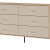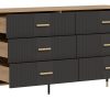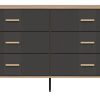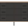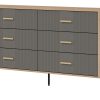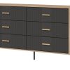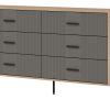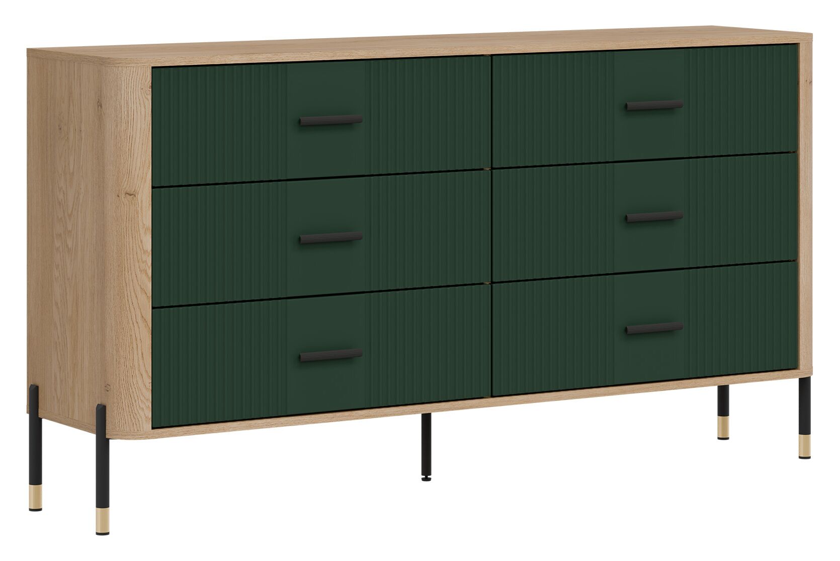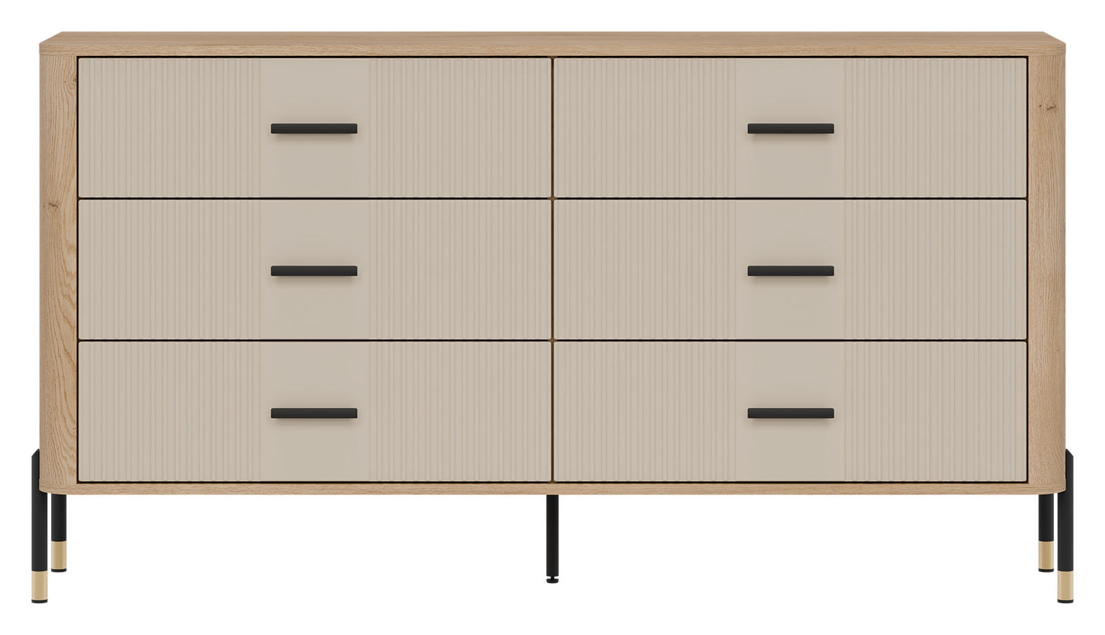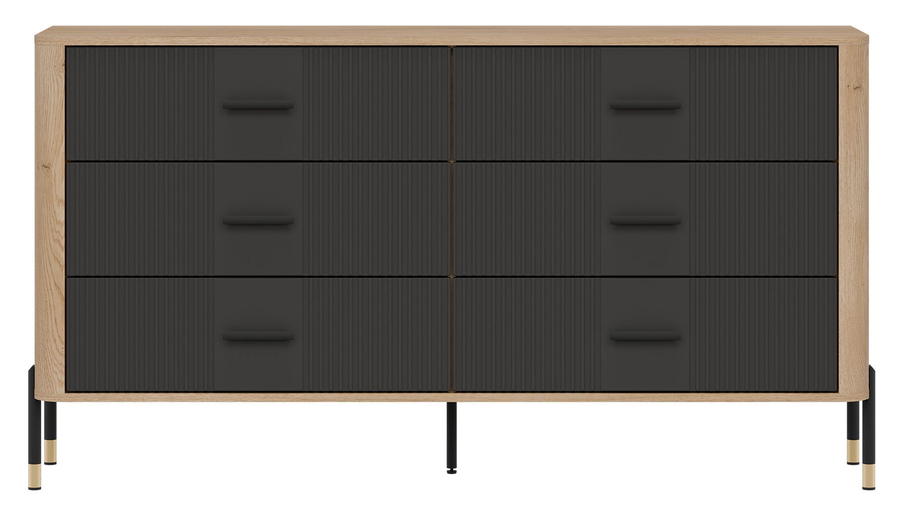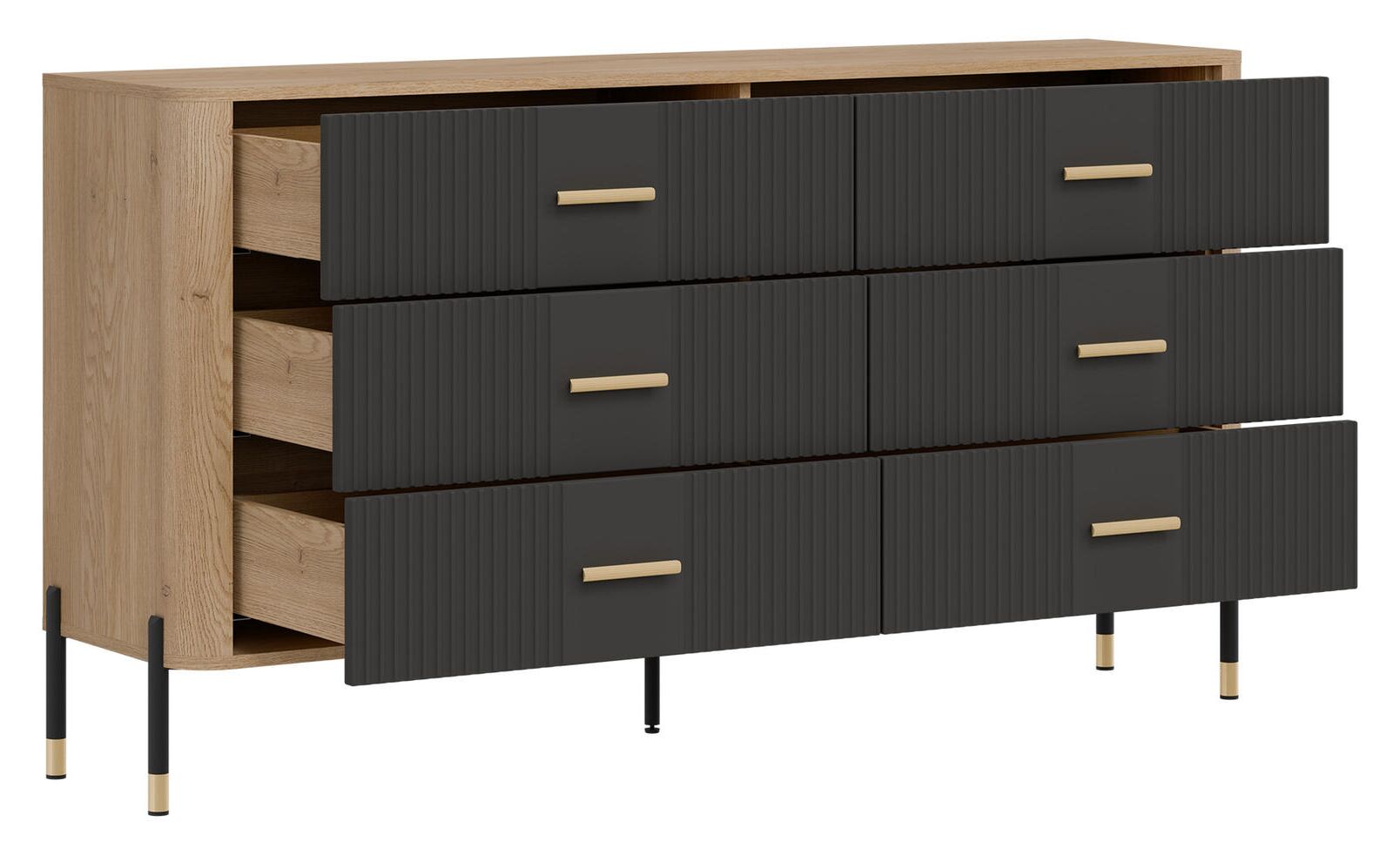 Korpusas pagamintas iš 16 mm storio LMDP plokštės, padengtos šilta ąžuolo Cremona Torro spalva. Šoninės detalės – iš tvirtos 32 mm MDF plokštės, o 18 mm MDF fasadai – pasirinktinai matinės spalvos su vertikaliais grioveliais. Komoda turi 6 erdvius stalčius, išdėstytus dviem eilėmis, su švelnaus uždarymo mechanizmais, užtikrinančiais tylų ir saugų naudojimą.
