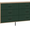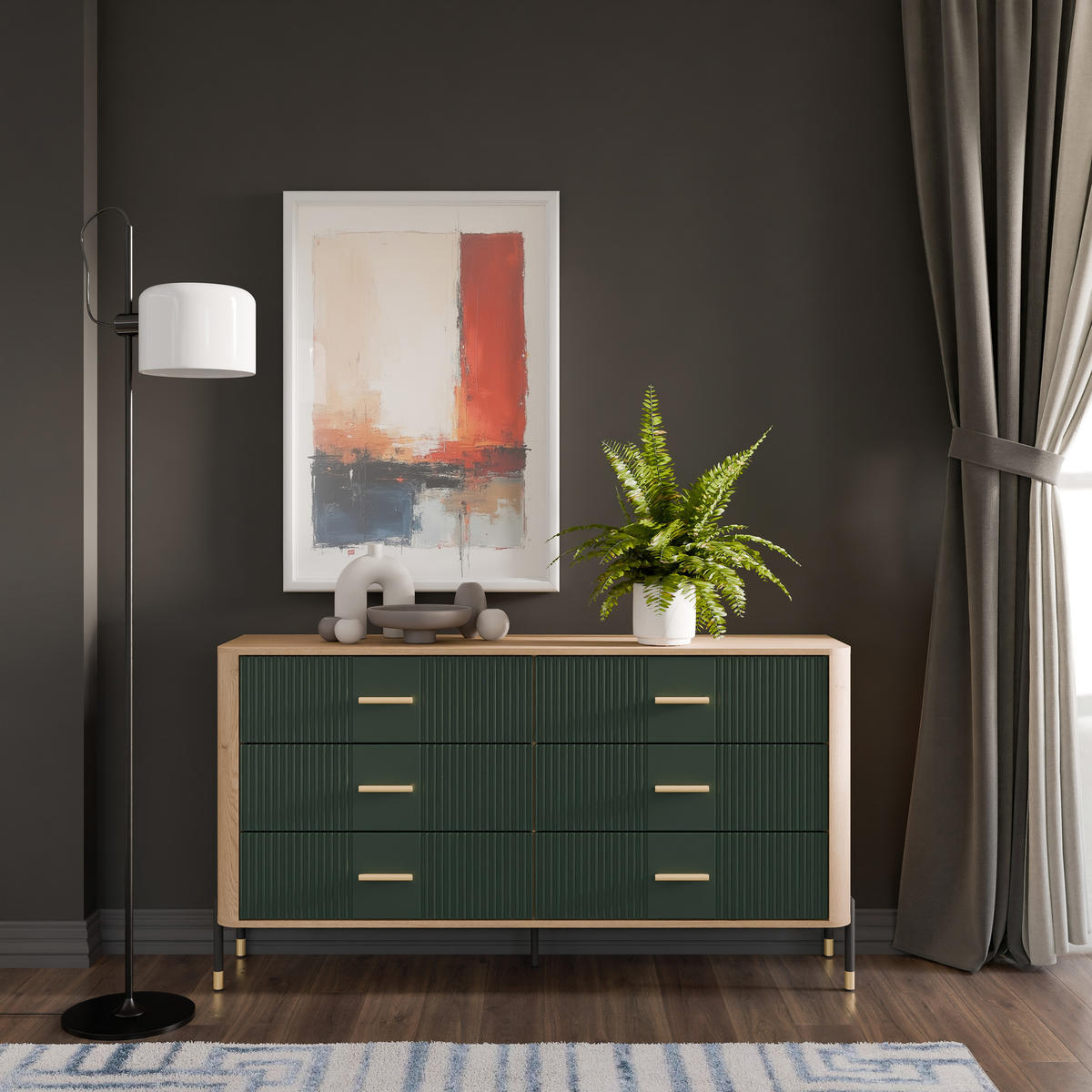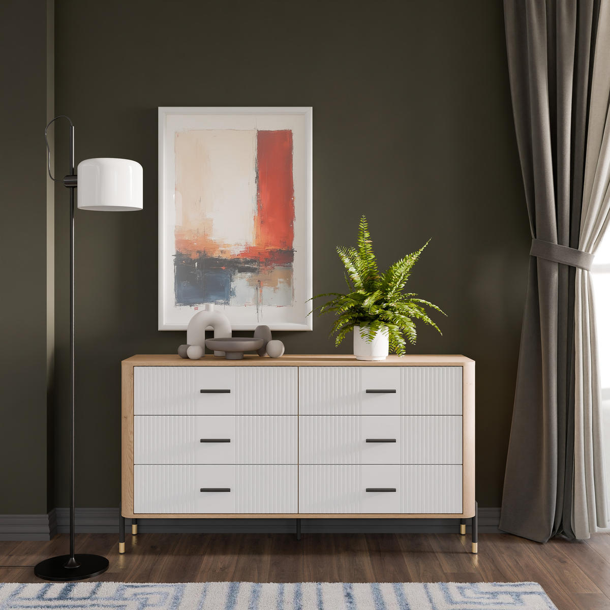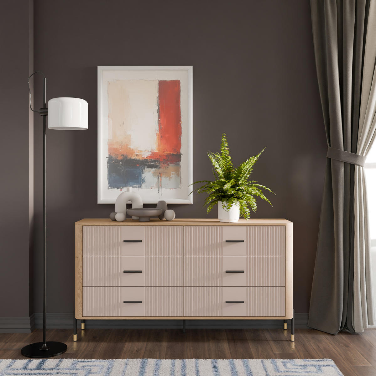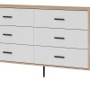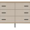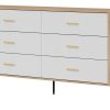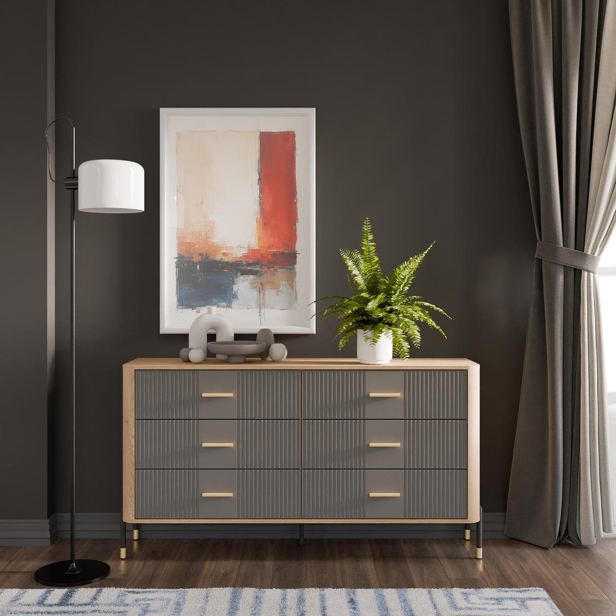 Korpusas pagamintas iš 16 mm storio LMDP plokštės, padengtos šilta ąžuolo Cremona Torro spalva. Šoninės detalės – iš tvirtos 32 mm MDF plokštės, o 18 mm MDF fasadai – pasirinktinai matinės spalvos su vertikaliais grioveliais. Komoda turi 6 erdvius stalčius, išdėstytus dviem eilėmis, su švelnaus uždarymo mechanizmais, užtikrinančiais tylų ir saugų naudojimą.