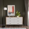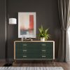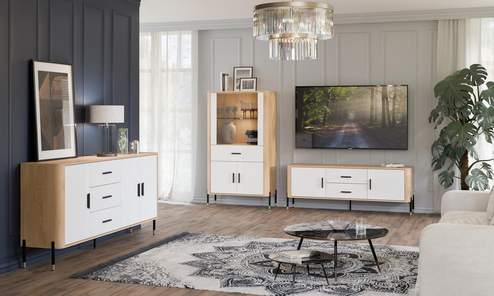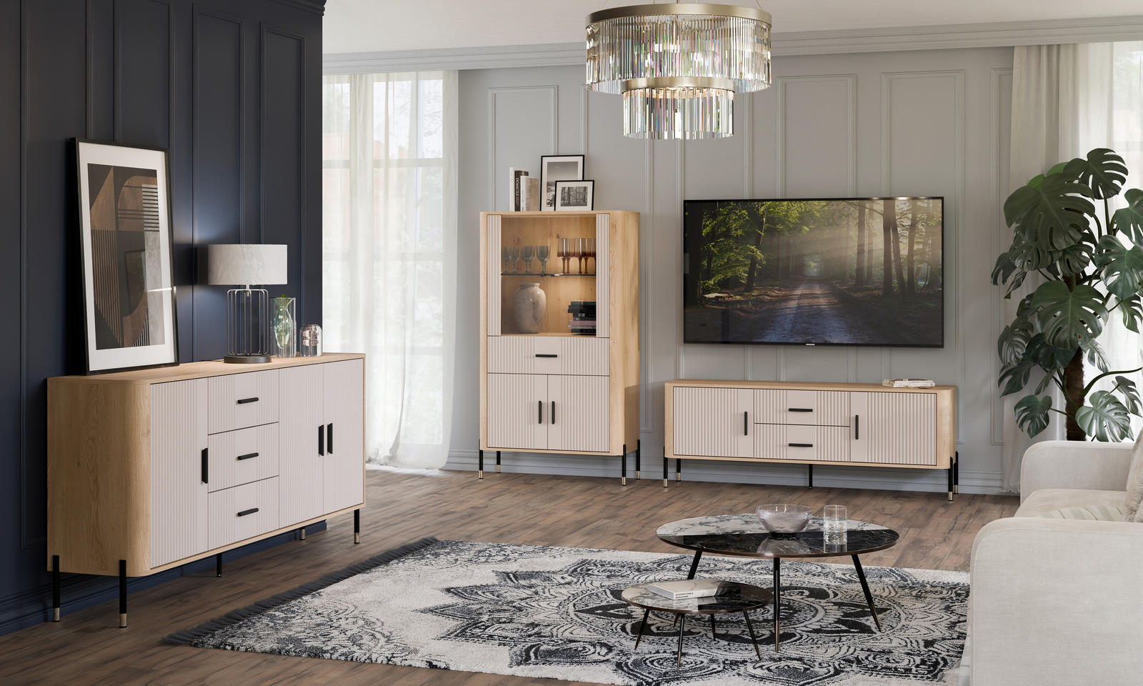 Elegantiškas vaizdas išbaigtas aukštomis juodomis metalinėmis kojelėmis su auksiniais akcentais, kurios suteikia baldui stabilumo ir vizualinio lengvumo. Klientai gali pasirinkti metalines rankenėles – juodas arba auksines, pagal savo interjero stilių.