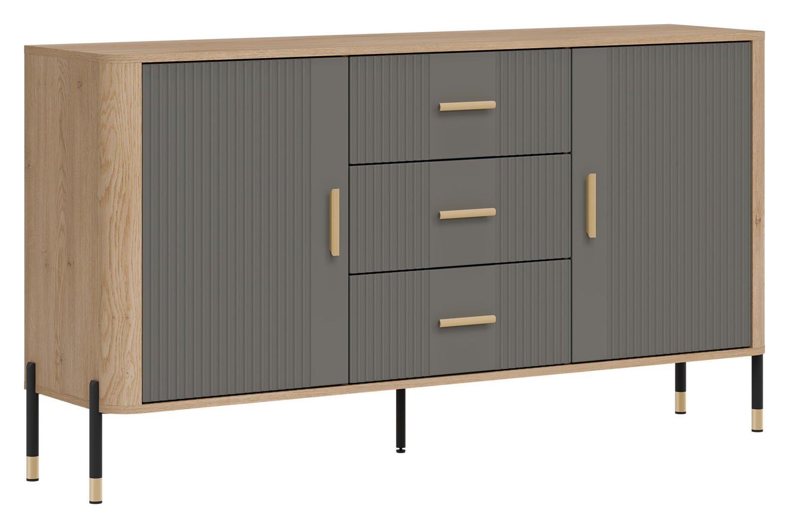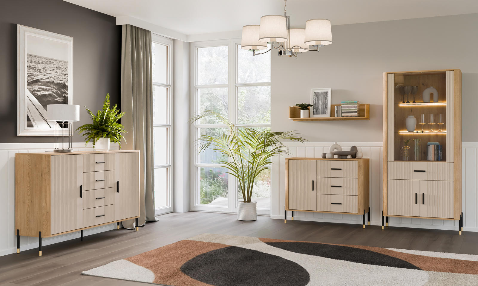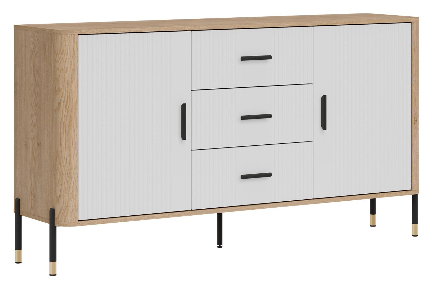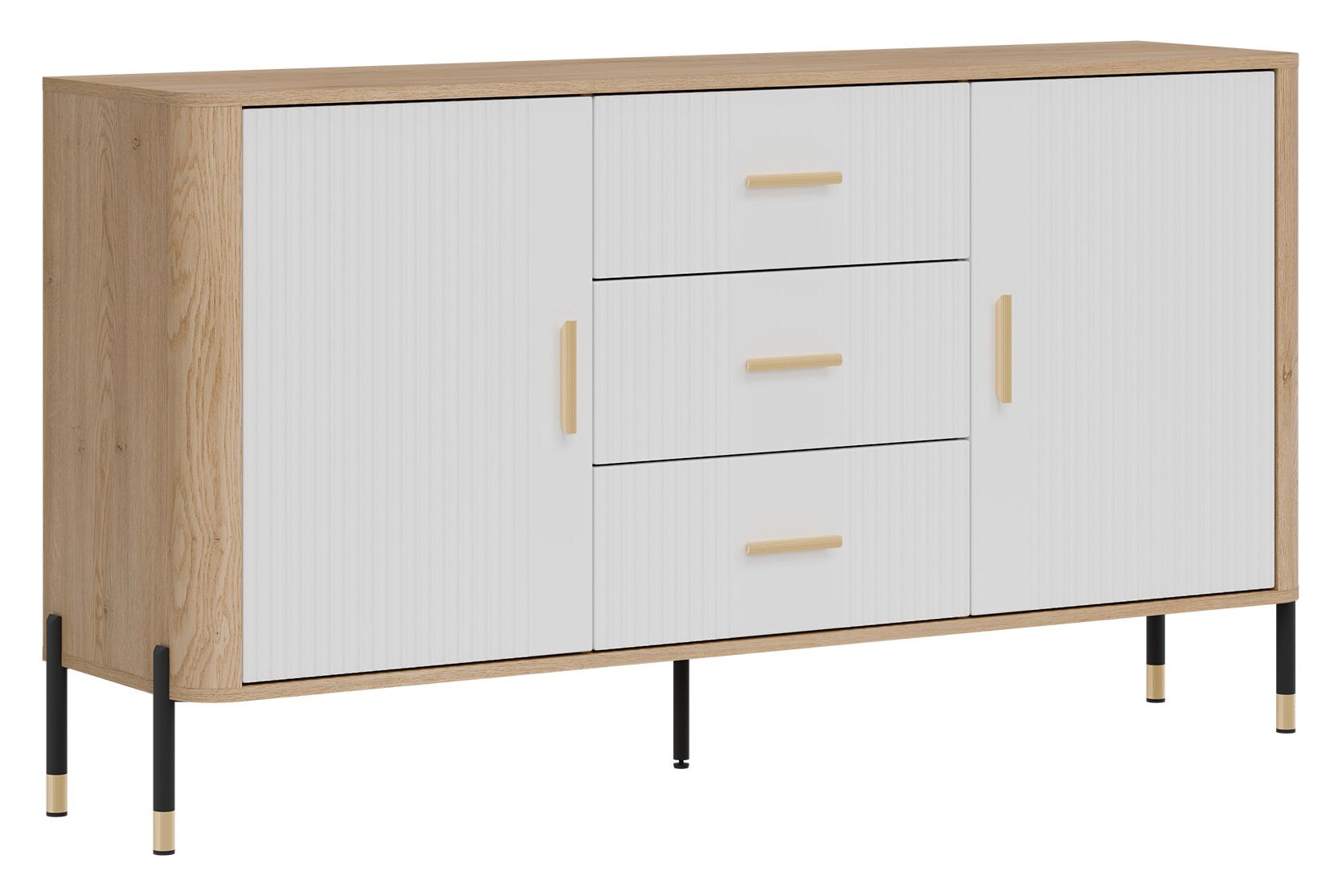 Komodos korpusas pagamintas iš 16 mm storio LMDP plokštės, su elegantiška ąžuolo Cremona Torro tekstūra. Šoninės plokštės – 32 mm MDF, suteikiančios stabilumo ir vizualinio masyvumo. Fasadai – 18 mm MDF, dekoruoti subtiliais vertikaliais grioveliais, ir gali būti dažyti vienu iš šių matinės spalvos variantų: balta, kašmyro, žalia, pilka arba antracito.