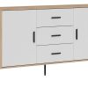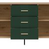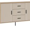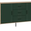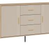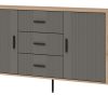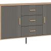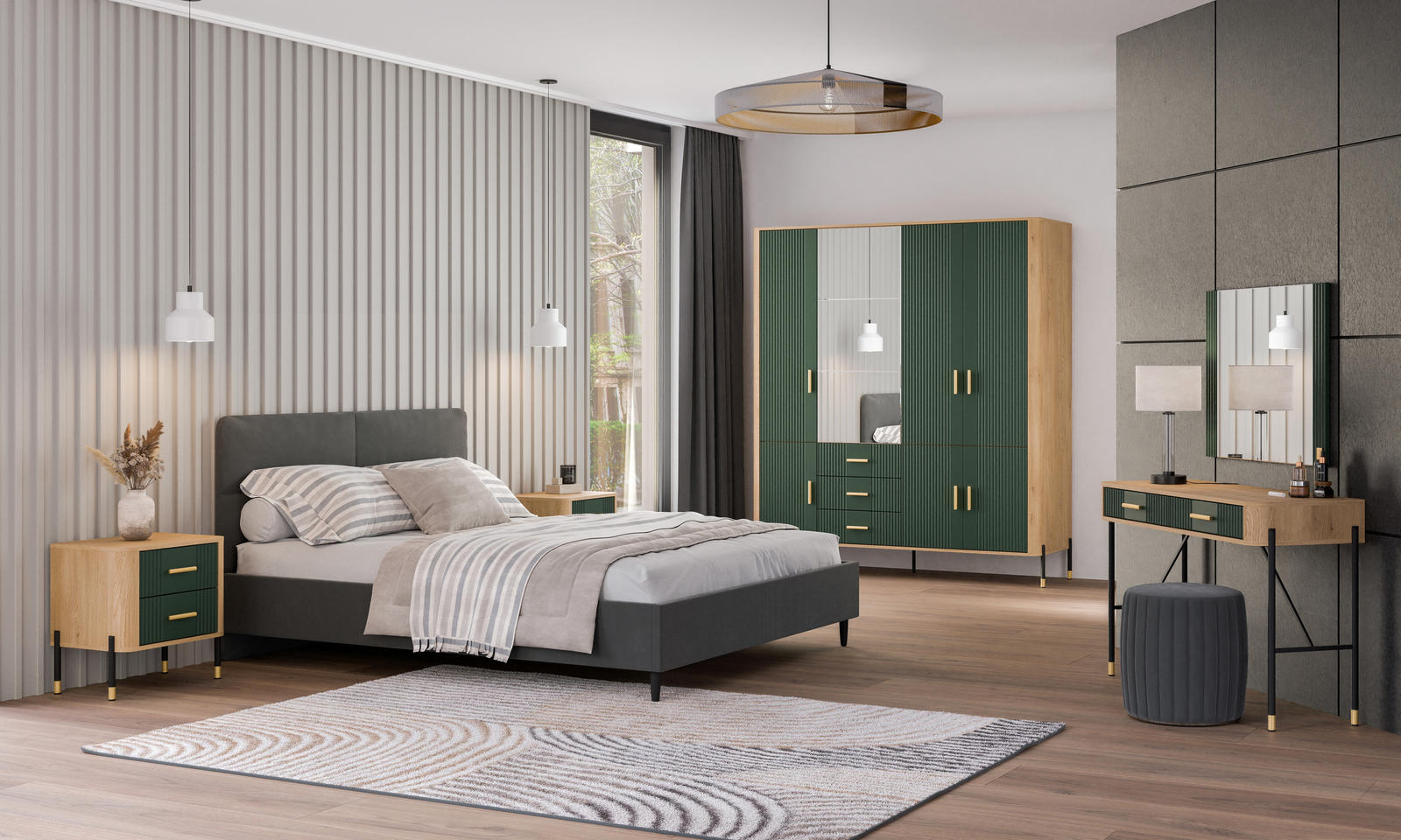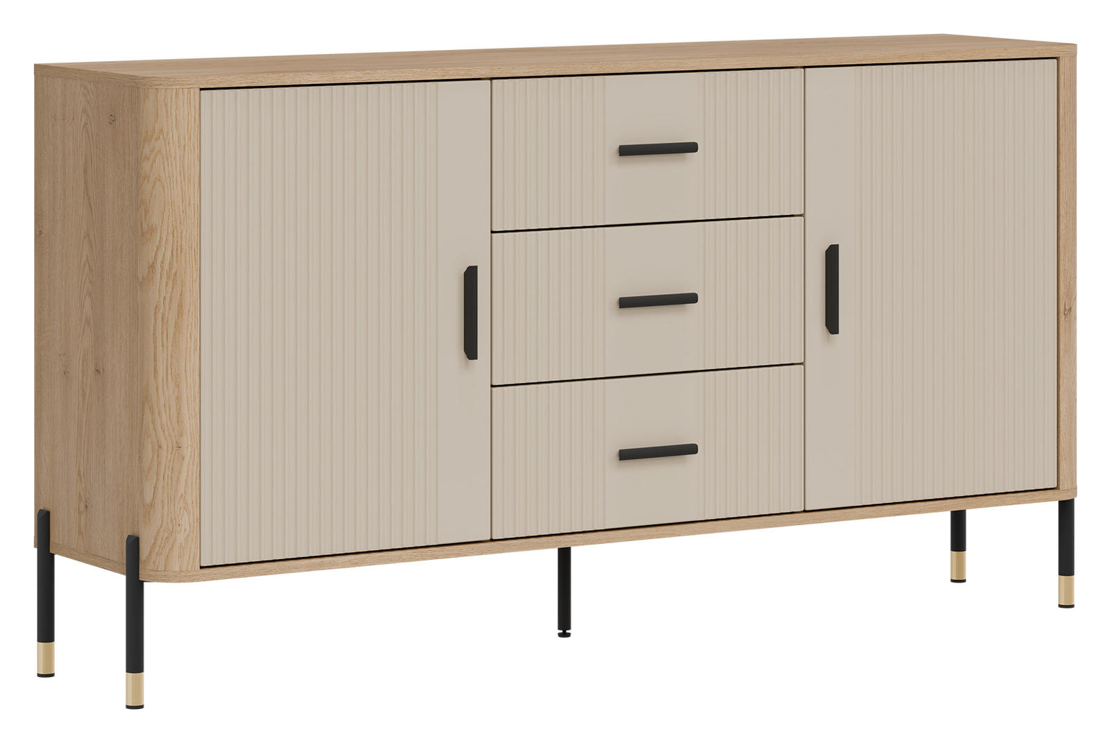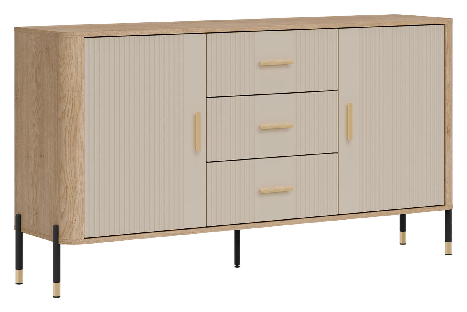Komodos korpusas pagamintas iš 16 mm storio LMDP plokštės, su elegantiška ąžuolo Cremona Torro tekstūra. Šoninės plokštės – 32 mm MDF, suteikiančios stabilumo ir vizualinio masyvumo. Fasadai – 18 mm MDF, dekoruoti subtiliais vertikaliais grioveliais, ir gali būti dažyti vienu iš šių matinės spalvos variantų: balta, kašmyro, žalia, pilka arba antracito.