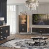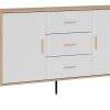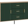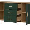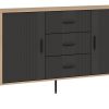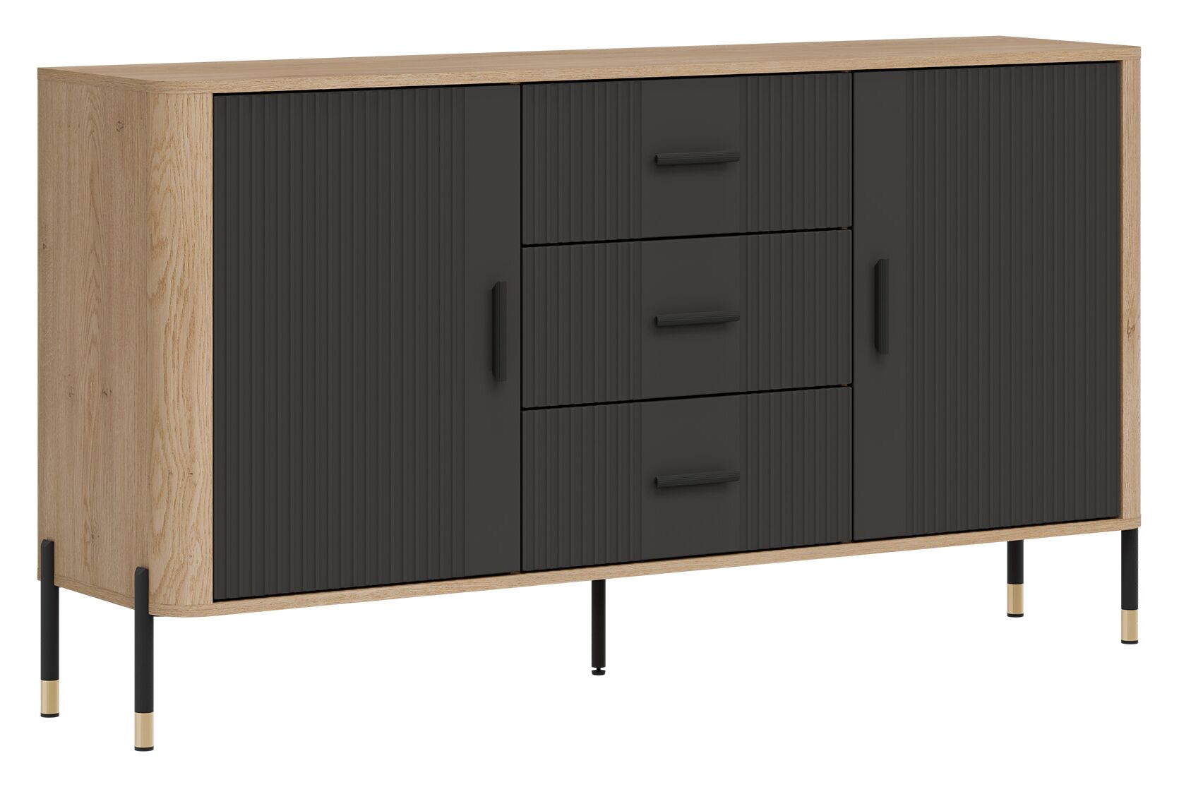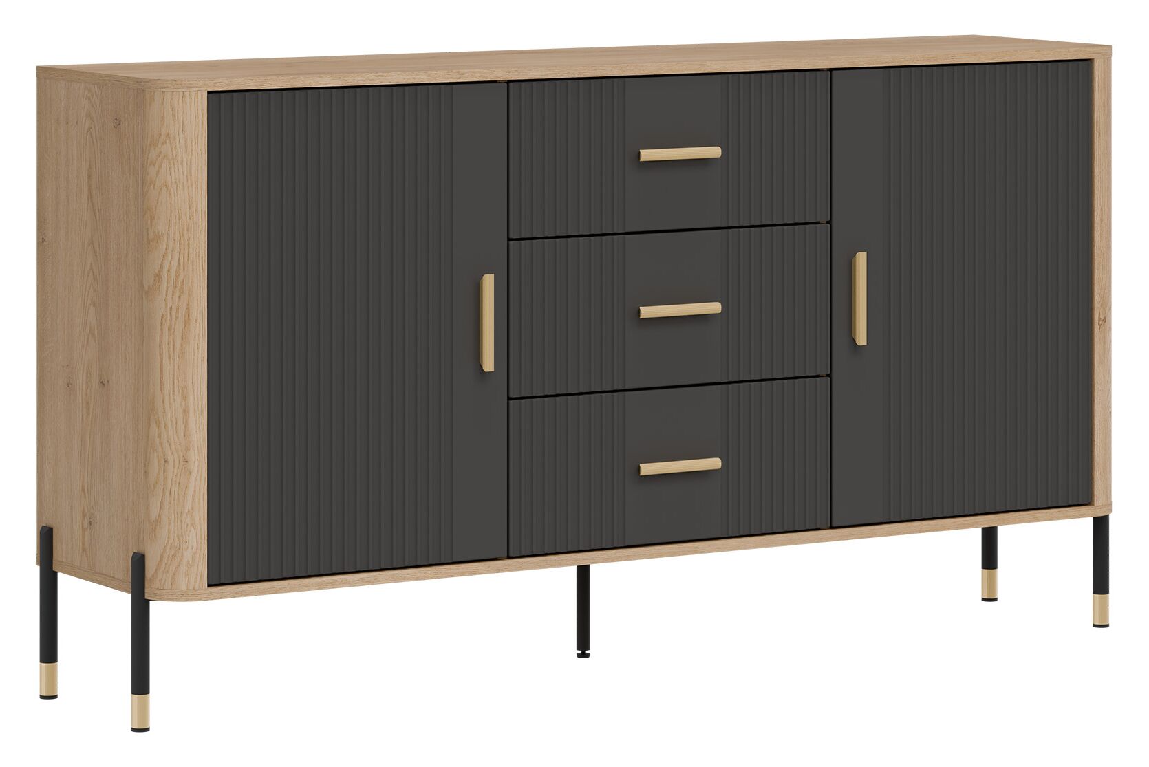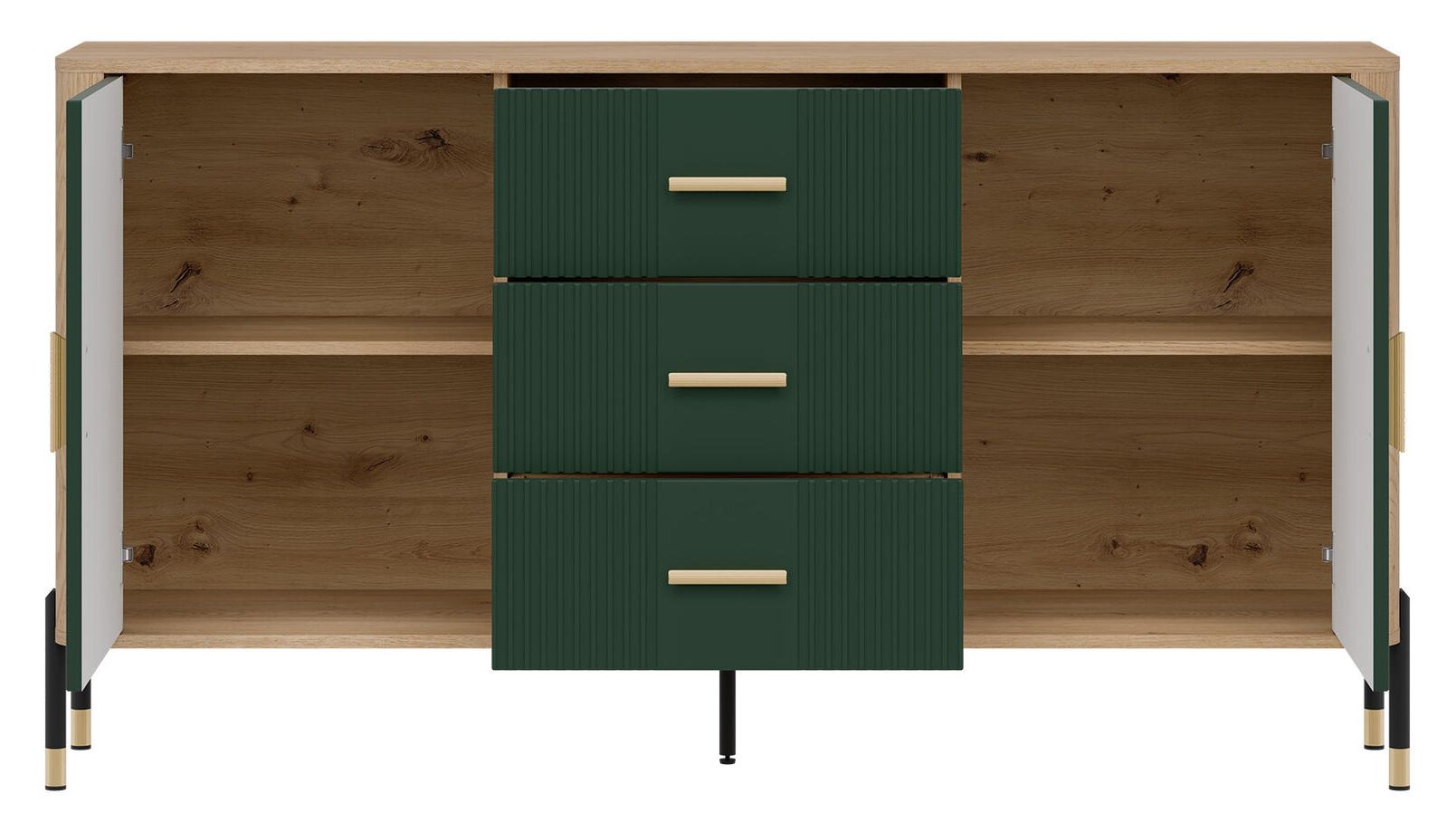 Comoda sudaro trys stalčiai centre bei dvi durelės abipus stalčių (viduje – lentynos), viskas su soft-close švelnaus uždarymo sistema, kuri užtikrina tylų ir saugų naudojimą. Komoda stovi ant grakščių juodų metalinių kojelių su auksiniais antgaliais, pridedančiais elegancijos ir lengvumo. Rankenėlės gali būti pasirenkamos – juodos arba auksinės, atsižvelgiant į interjero dizainą.