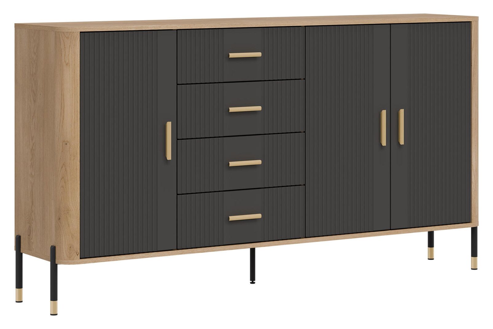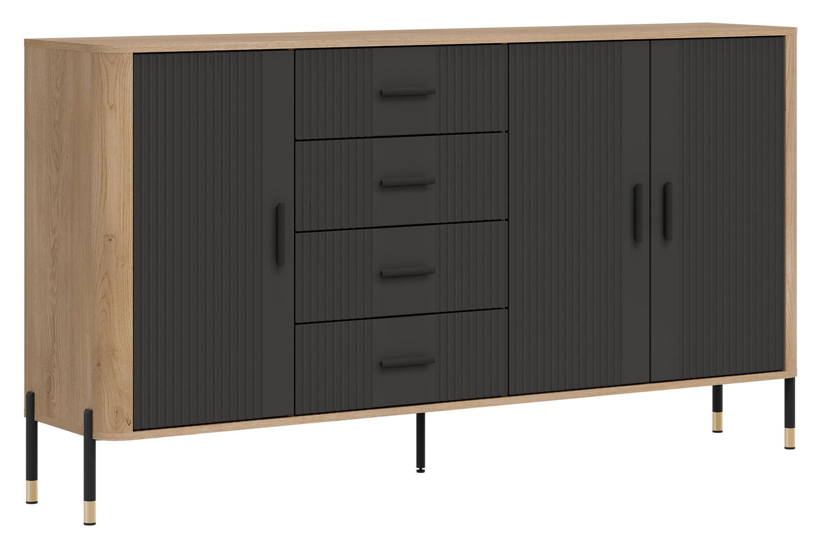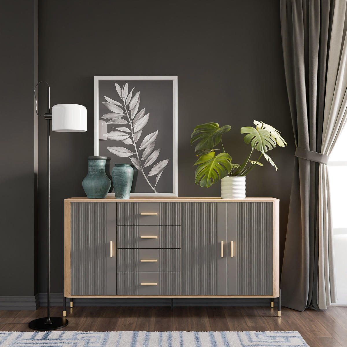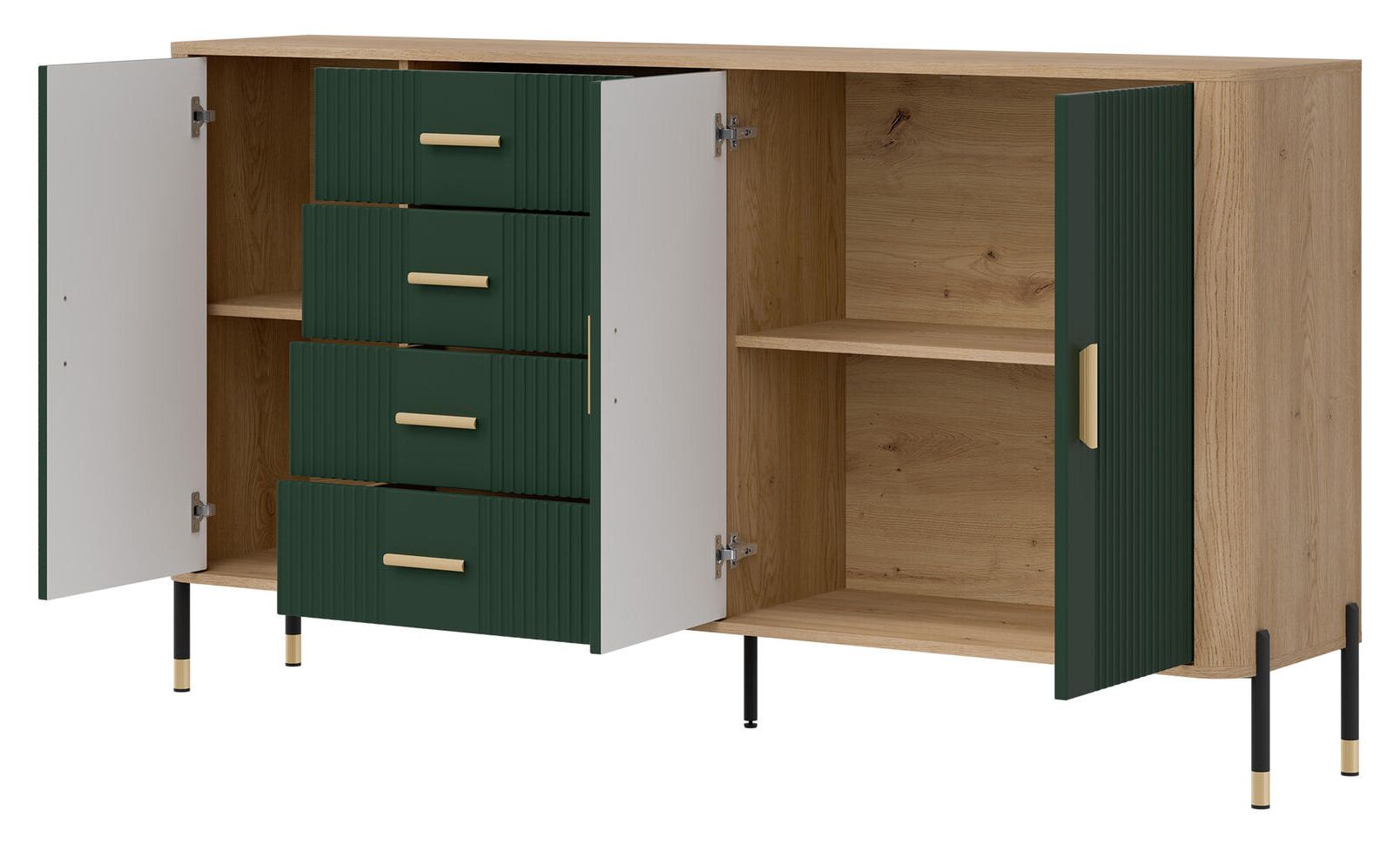 • Komoda Dante DT10 – tai išskirtinio dizaino, didelės talpos baldų sprendimas jūsų namams. Šis modelis pasižymi ne tik modernia estetika, bet ir aukšta funkcine verte – puikiai tinka tiek svetainei, tiek valgomajam ar erdviam prieškambariui.Komoda pagaminta iš tvirtų medžiagų: korpusas – LMDP plokštė 16 mm storio, šoninės dalys iš 32 mm storio MDF, o fasadai – 18 mm MDF plokštės. Paviršiai matiniai, todėl atrodo solidžiai, malonūs liesti ir atsparūs pirštų žymėms.Fasadų spalvą galite pasirinkti iš net penkių modernių atspalvių: balta matinė, kašmyro, žalia matinė, pilka matinė arba antracito matinė. Korpusas visuomet ąžuolo Cremona Torro atspalvio – šiltas ir natūralus fonas.Komoda turi 4 erdvius stalčius ir net 4 dureles (dvi po vieną ir vienas dvigubas skyrius), už kurių slepiasi talpios lentynos – puikus sprendimas drabužiams, indams, dokumentams ar kitiems daiktams laikyti.Švelnaus uždarymo mechanizmai tiek stalčiams, tiek durelėms užtikrina komfortą naudojantis kasdien.Modelis stovi ant tvirtų metalinių juodų kojelių, puoštų elegantiškomis auksinėmis detalėmis. Rankenėlių spalvą galima pasirinkti – juodos arba auksinės. Tai leidžia derinti prie kitų interjero akcentų.