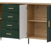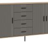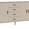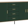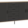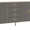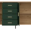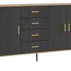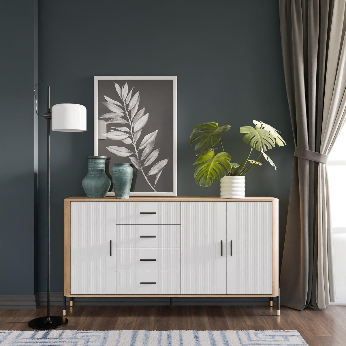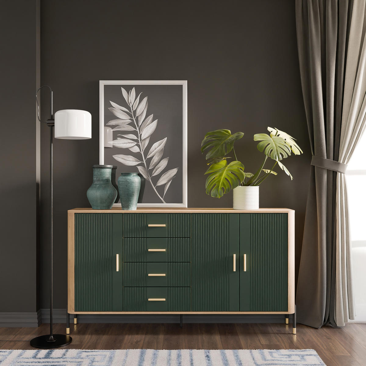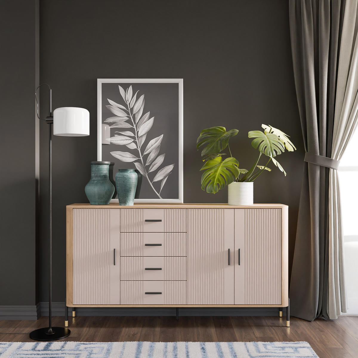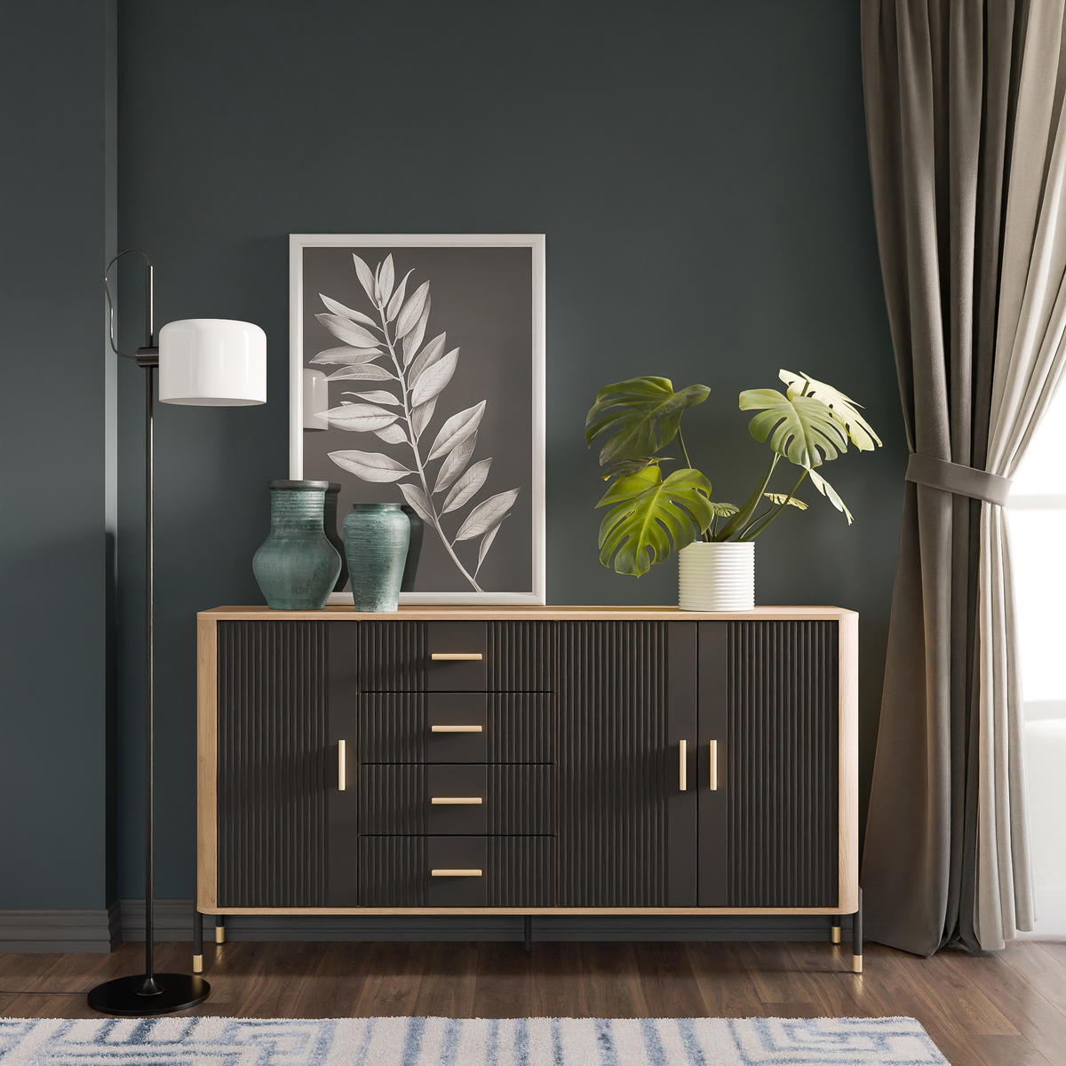 • Komoda Dante DT10 – tai išskirtinio dizaino, didelės talpos baldų sprendimas jūsų namams. Šis modelis pasižymi ne tik modernia estetika, bet ir aukšta funkcine verte – puikiai tinka tiek svetainei, tiek valgomajam ar erdviam prieškambariui.Komoda pagaminta iš tvirtų medžiagų: korpusas – LMDP plokštė 16 mm storio, šoninės dalys iš 32 mm storio MDF, o fasadai – 18 mm MDF plokštės. Paviršiai matiniai, todėl atrodo solidžiai, malonūs liesti ir atsparūs pirštų žymėms.Fasadų spalvą galite pasirinkti iš net penkių modernių atspalvių: balta matinė, kašmyro, žalia matinė, pilka matinė arba antracito matinė. Korpusas visuomet ąžuolo Cremona Torro atspalvio – šiltas ir natūralus fonas.Komoda turi 4 erdvius stalčius ir net 4 dureles (dvi po vieną ir vienas dvigubas skyrius), už kurių slepiasi talpios lentynos – puikus sprendimas drabužiams, indams, dokumentams ar kitiems daiktams laikyti.Švelnaus uždarymo mechanizmai tiek stalčiams, tiek durelėms užtikrina komfortą naudojantis kasdien.Modelis stovi ant tvirtų metalinių juodų kojelių, puoštų elegantiškomis auksinėmis detalėmis. Rankenėlių spalvą galima pasirinkti – juodos arba auksinės. Tai leidžia derinti prie kitų interjero akcentų.