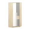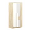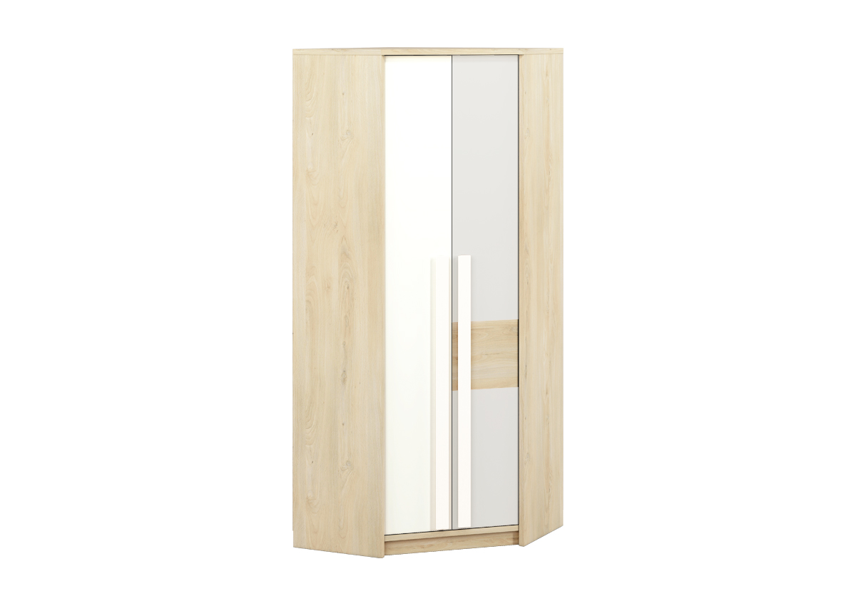 Funkcionali kampinė spinta Drop 01 su lentynomis, varstomomis durimis ir pasirinktinėmis dekoracijos spalvomis. Spalva: balta + bukas.