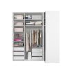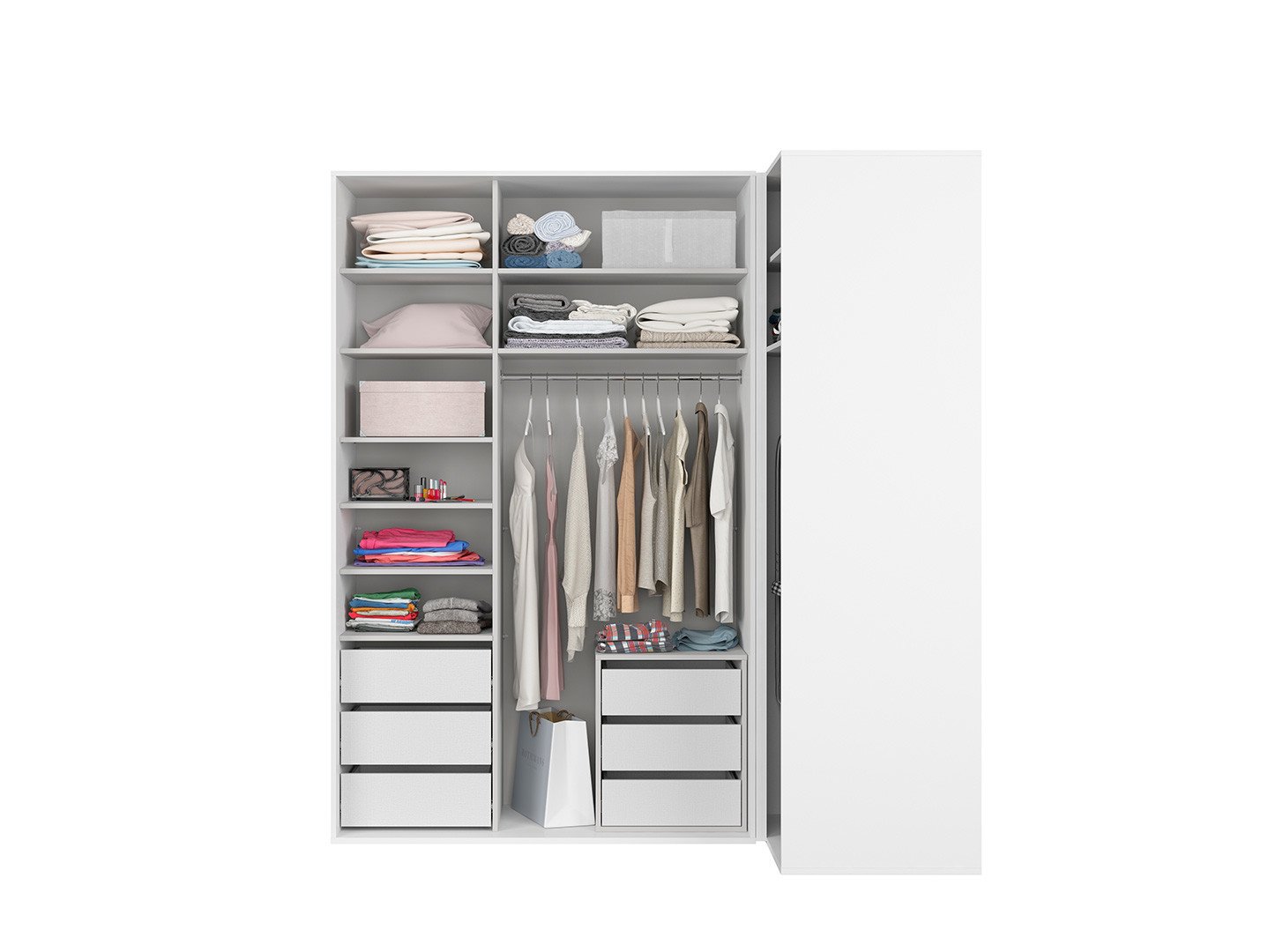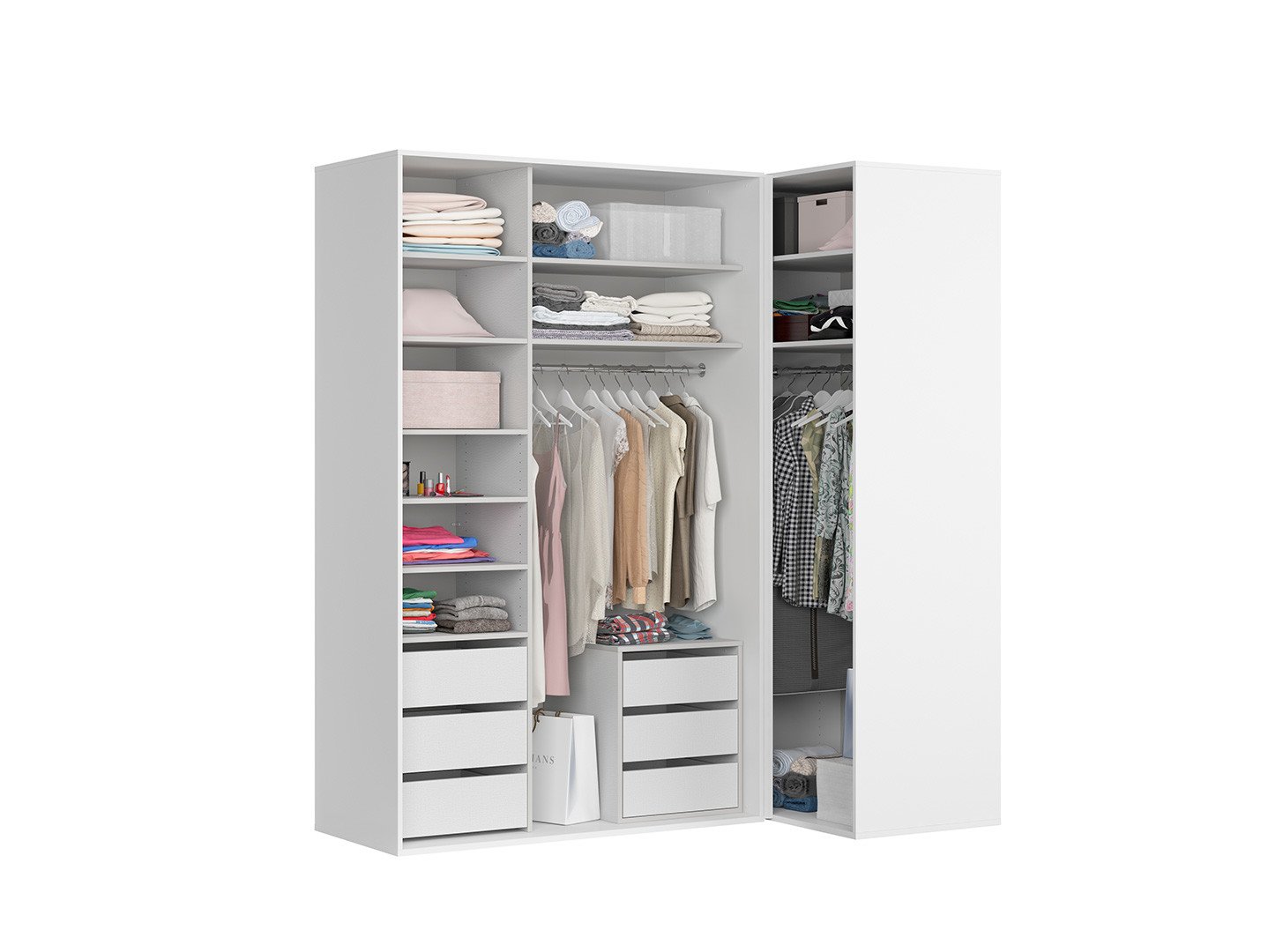 Spinta pasižymi puikiu vidaus išdėstymu – joje yra lentynos, kabykla ir stalčiai, todėl rūbai, avalynė ir aksesuarai visada bus savo vietoje. Dėl savo formos spinta puikiai telpa kambario kampe ir padeda optimaliai išnaudoti erdvę. Dydis: aukštis – 2400 mm, plotis – 2210 mm, gylis – 1160 mm. Tai funkcionalus baldas šiuolaikiškai gyvenančiam žmogui.