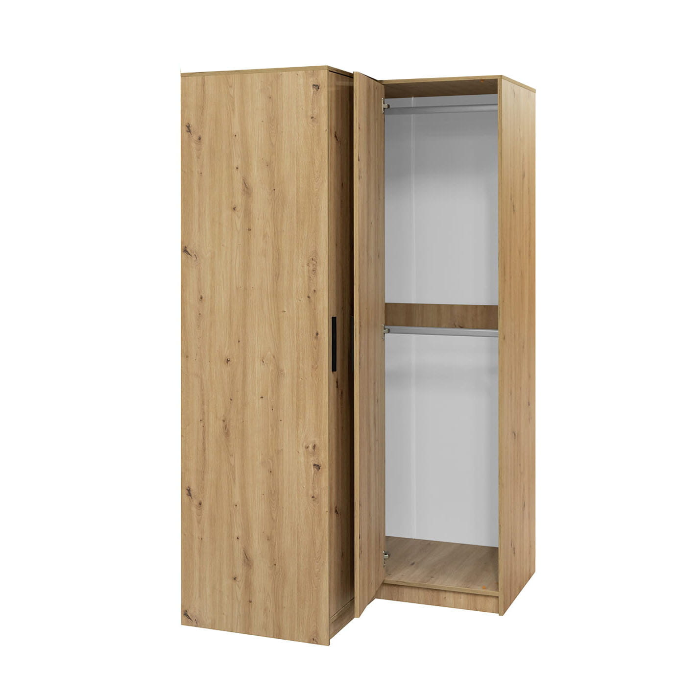 Dažniausiai užduodami klausimai: Ar ši spinta tinka mažoms erdvėms? Taip, dėl savo kampinės formos ir 1085 mm pločio ši spinta idealiai tinka mažesniems kambariams, nes užima mažai grindų ploto, bet pasiūlo daug vietos daiktams. Kokie yra tikslūs šios spintos matmenys? Spintos aukštis yra 2000 mm, plotis – 1085 mm, o gylis – 575 mm.
