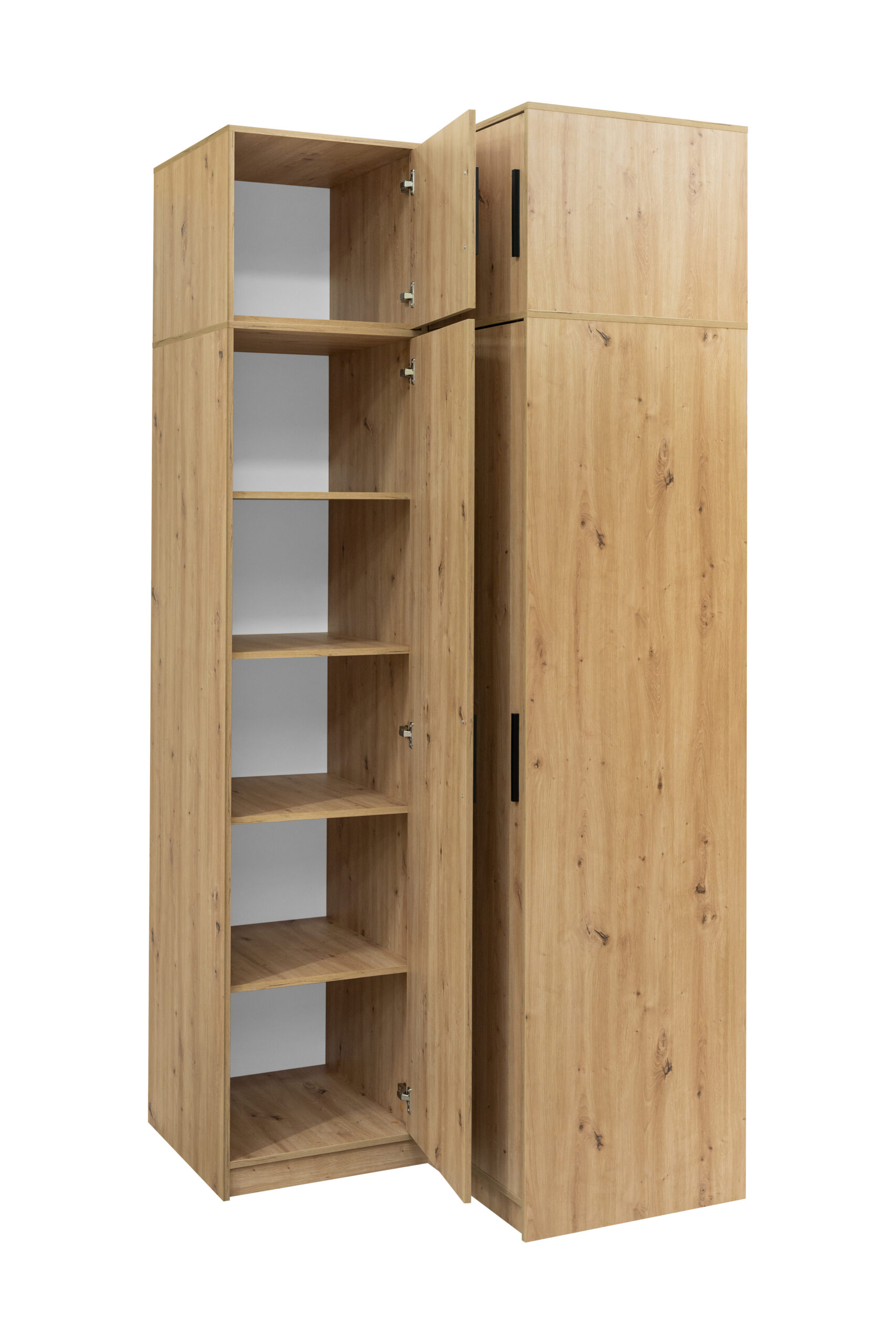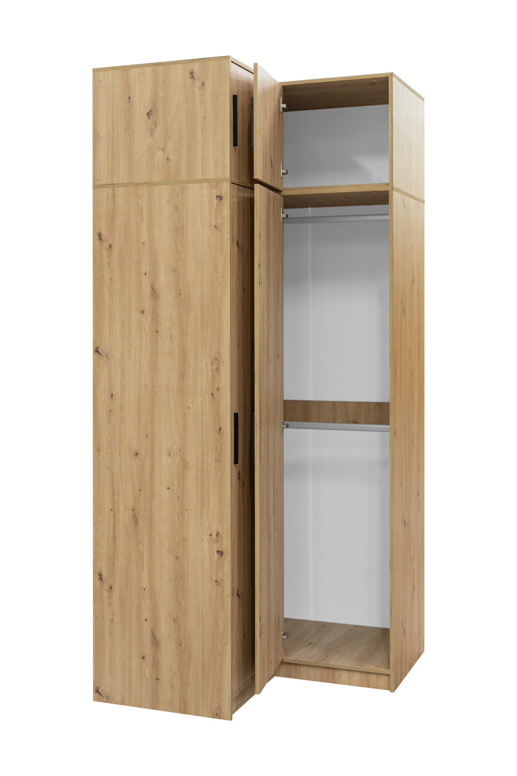 Maksimaliai talpi kampinė spinta su antresole, sukurta pilnai išnaudoti kambario aukštį ir kampus iki pat lubų. Šiltas Artisan ąžuolo raštas ir aukšta konstrukcija suteikia interjerui vientisumo bei užtikrina gausią erdvę visam jūsų garderobui.