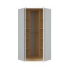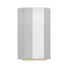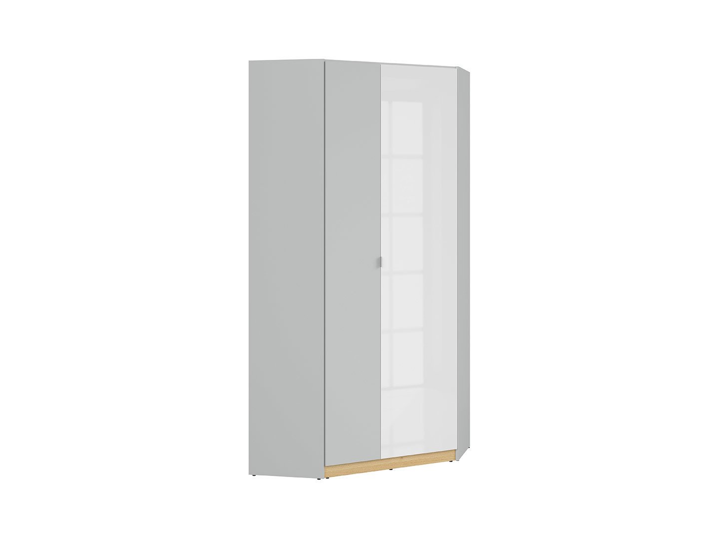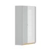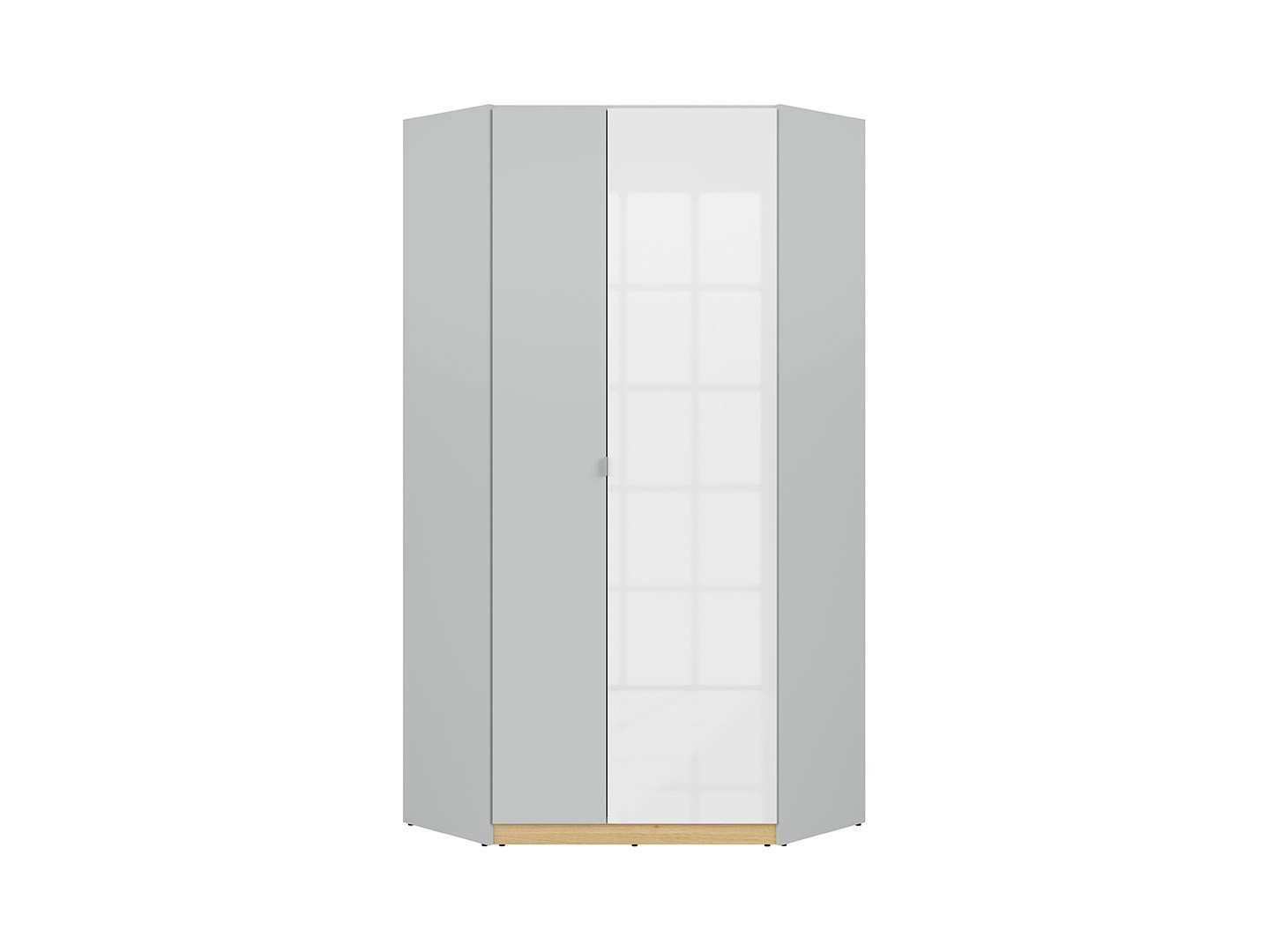 Pagaminta iš aukštos kokybės laminuotos medžio drožlių plokštės (LMDP), ši kampinė spinta užtikrina tvirtumą, ilgaamžiškumą ir lengvą priežiūrą. Korpusas – švelnios pilkos spalvos, fasadas dekoruotas balta blizgia plokšte, o pagrindas subtiliai įrėmintas natūralaus ąžuolo atspalvio detale, suteikiančia jaukumo.