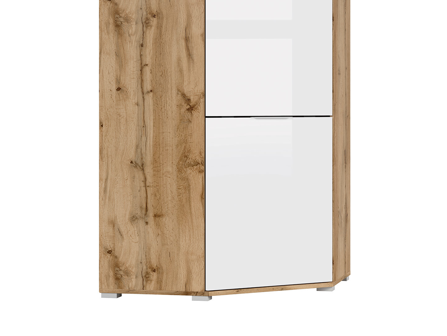 Pagaminta iš aukštos kokybės LMDP (laminuotos medžio drožlių plokštės), ši spinta pasižymi tvirtumu ir ilgaamžiškumu. Dėl Wotan ąžuolo spalvos korpuso ir baltos blizgios fasado apdailos ji puikiai dera tiek klasikiniame, tiek moderniame interjere. Kontrastingas spalvų derinys suteikia baldui elegantiškumo bei vizualinio lengvumo.