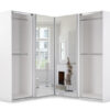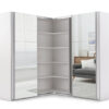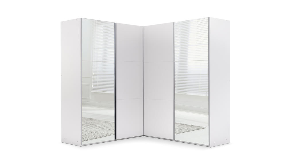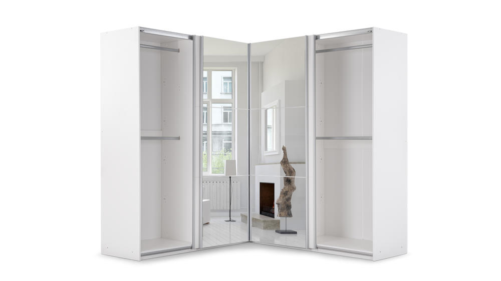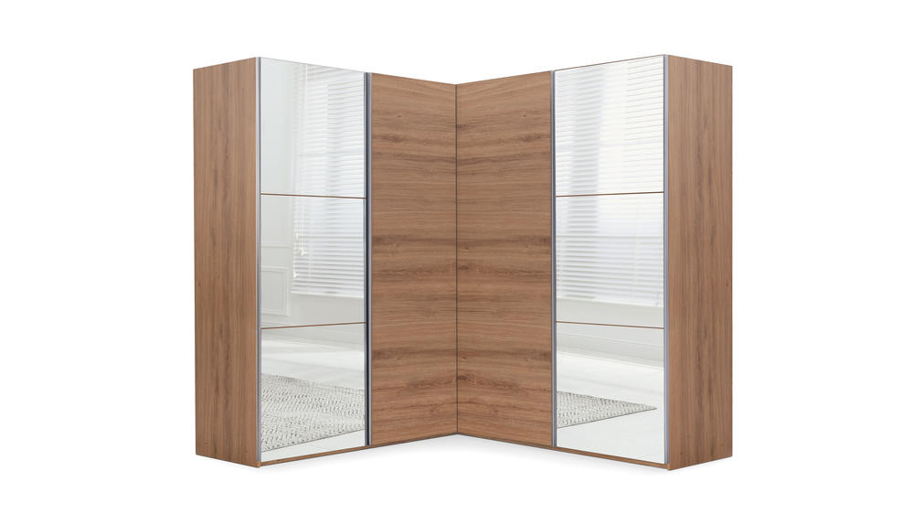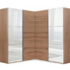 Praktinis erdvės optimizavimas L formos korpusas, kurio matmenys yra 2160×2075 mm, o aukštis siekia 2150 mm, talpina didesnį kiekį daiktų. Stumdomų durų sistema užtikrina priėjimą prie turinio neužimant papildomo ploto priešais spintą. Veidrodžiai ant fasado vizualiai keičia patalpos gylį ir suteikia papildomo apšvietimo pojūtį.