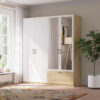 Dizainas ir stilius Baltas fasadas dera su ąžuolo detalėmis. Tai suteikia spintai jaukumo. Minimalistinė forma tinka šiuolaikiniam stiliui. Varstomos durys leidžia lengvai pasiekti daiktus. Veidrodis padeda kasdien renkantis aprangą.