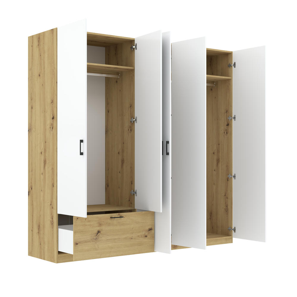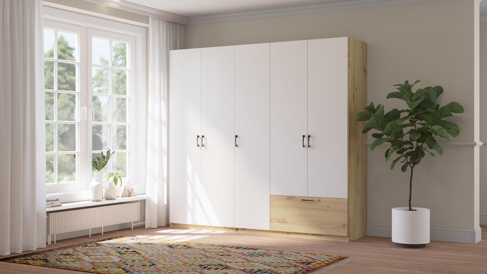 Spinta Alta 5D1S yra penkių durų sandėliavimo baldas, sukurtas siekiant maksimaliai išnaudoti kambario plotą ir užtikrinti nepriekaištingą tvarką. Šis modelis efektyviai sprendžia didelio kiekio drabužių saugojimo problemą, suteikdamas plačias sekcijas, kuriose kiekvienas daiktas randa savo vietą, o lygus fasadas be veidrodžio suteikia interjerui ramybės ir vientisumo pojūtį.