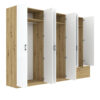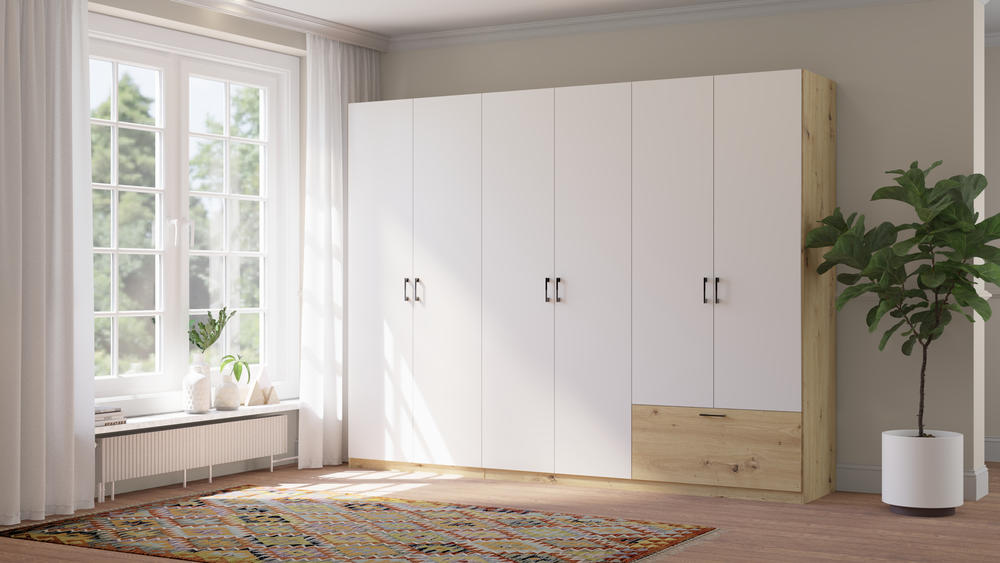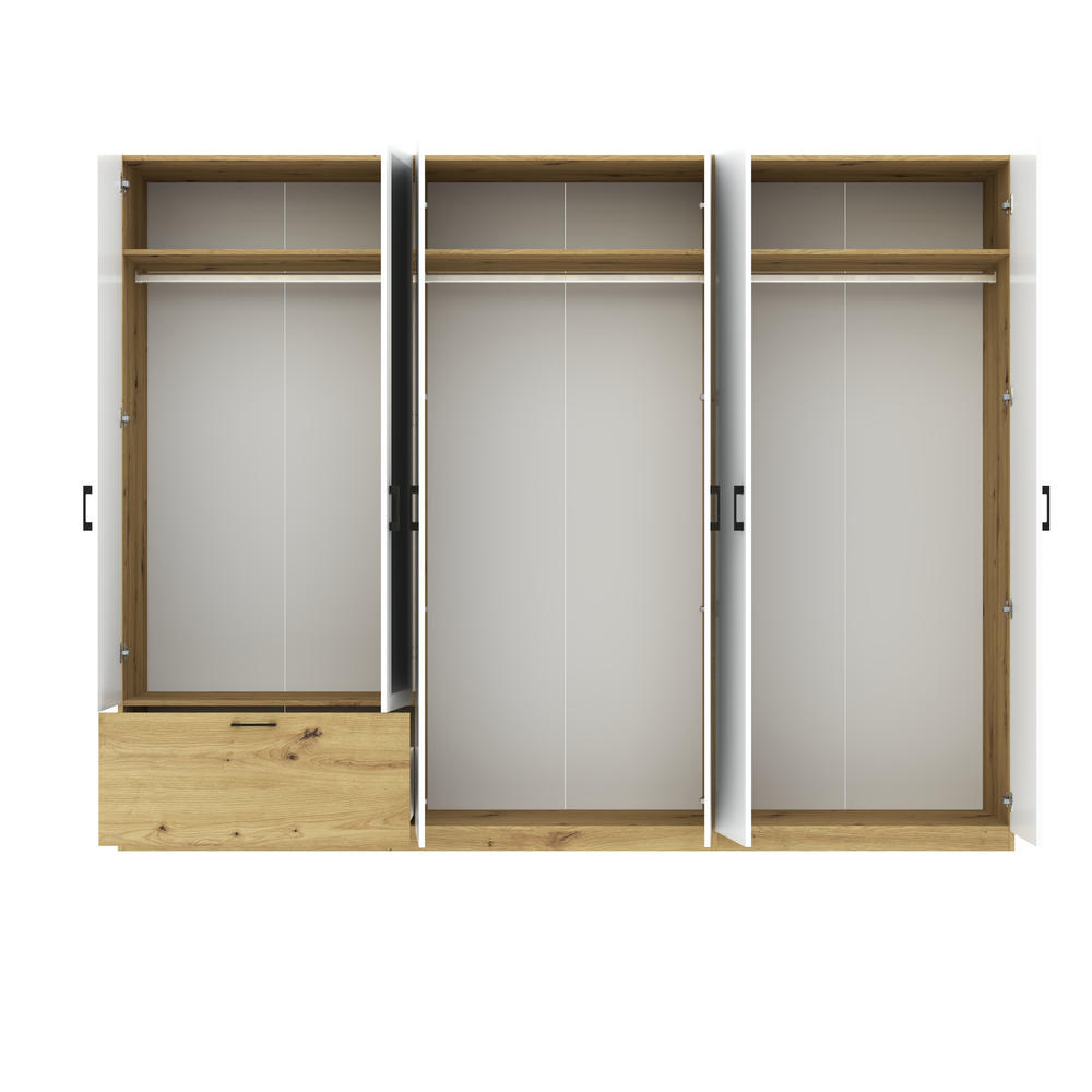 Modernus dizainas ir spalvinė gama Baltos spalvos derinys su Artisan ąžuolo akcentais suteikia spintai vizualinio lengvumo, nepaisant jos didelių gabaritų. Tai padeda išvengti kambario apkrovimo pojūčio, suteikiant interjerui šviesos ir natūralios medienos tekstūros jaukumo. 2100 mm aukštis ir 540 mm gylis suformuoja optimalią erdvę, kuri yra skirta visapusiškam ir stilingam drabužių organizavimui moderniuose namuose.