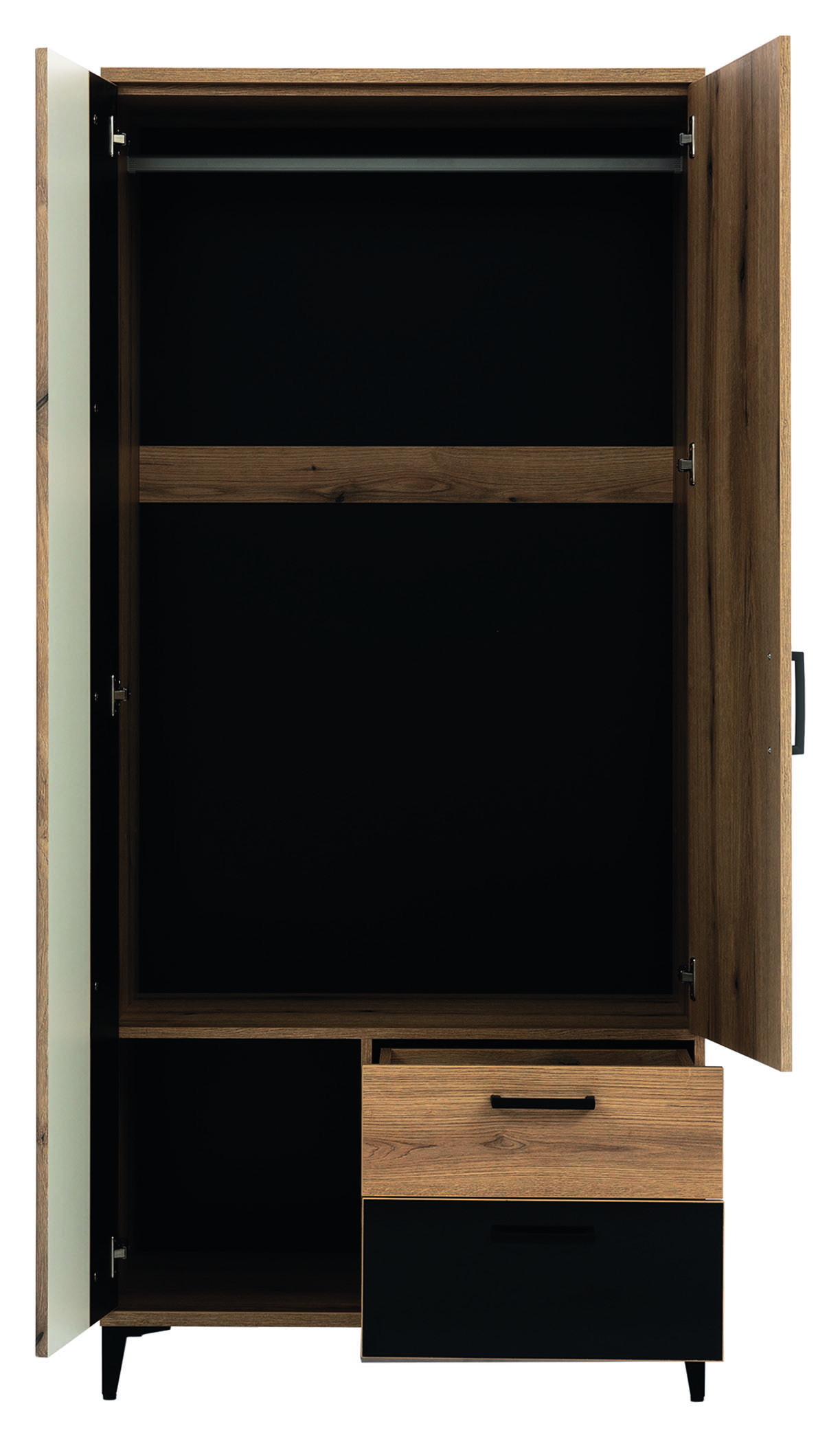 Spinta Aris AS10 su švelnaus uždarymo durimis, stalčiais ir moderniu dizainu – puikus pasirinkimas interjerui. Spalva: ąžuolas + juoda blizgi. Aukštis 194 cm, plotis 88,5 cm, gylis 54,5 cm.