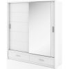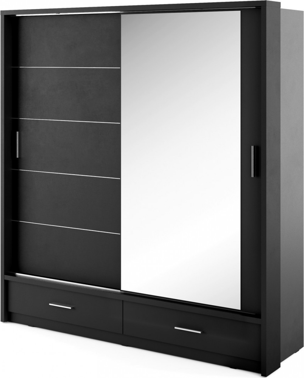 Spinta „Arti AR-05“ – puikus pasirinkimas ieškantiems erdvios ir estetiškos vietos daiktams laikyti. Ši dviejų durų stumdomoji spinta pagaminta iš kokybiškos LMDP plokštės, kurios paviršius padengtas matiniu juodu arba baltu laminatu – šios spalvos puikiai įsilieja į šiuolaikišką interjerą. Veidrodis padidina erdvės pojūtį kambaryje, o vidinės lentynos ir dvi kabinimo zonos leidžia lengvai susitvarkyti rūbus bei aksesuarus. Apatinėje dalyje įrengti du stalčiai papildomam daiktų laikymui. Spintos matmenys: aukštis – 2150 mm, plotis – 2000 mm, gylis – 630 mm. Stumdomų durų sistema veikia tyliai ir užtikrintai.