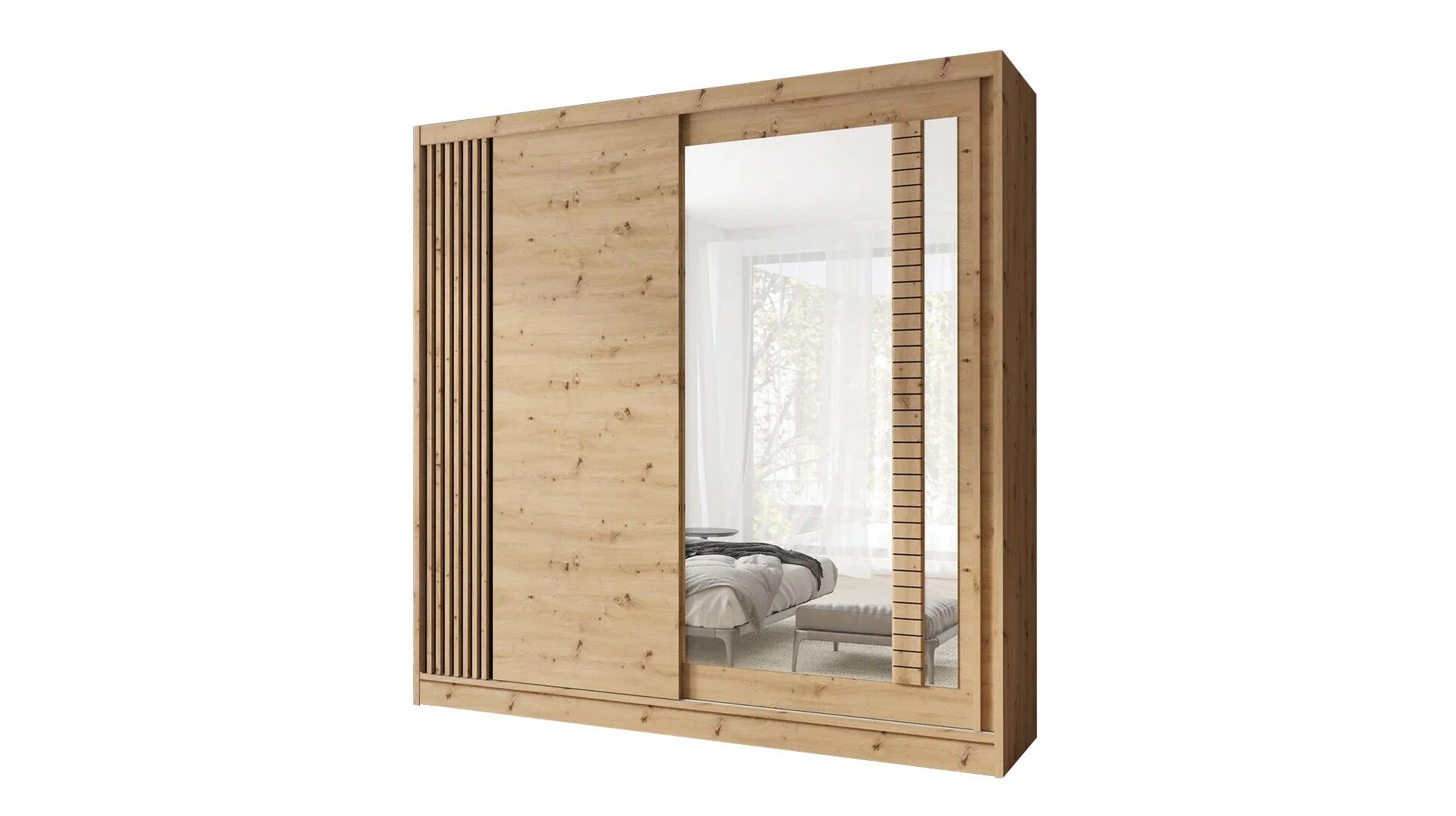 Spinta Artiz AZ5-20 – tai šiuolaikiško dizaino ir praktiškumo derinys. Ši stumdomų durų spinta su integruotu veidrodžiu pagaminta iš aukštos kokybės LMDP plokštės. Dėl plačių durų ir patogiai išdėstytų lentynų viduje – tai puikus pasirinkimas tiems, kurie vertina funkcionalumą ir talpumą. Dizainą papildo vertikalios medinės juostelės, kurios suteikia skandinavišką estetiką. Spintos matmenys: aukštis – 2150 mm, plotis – 2000 mm, gylis – 590 mm. Ši spinta puikiai tinka tiek miegamajam, tiek prieškambariui.