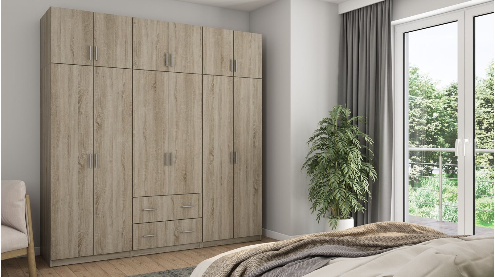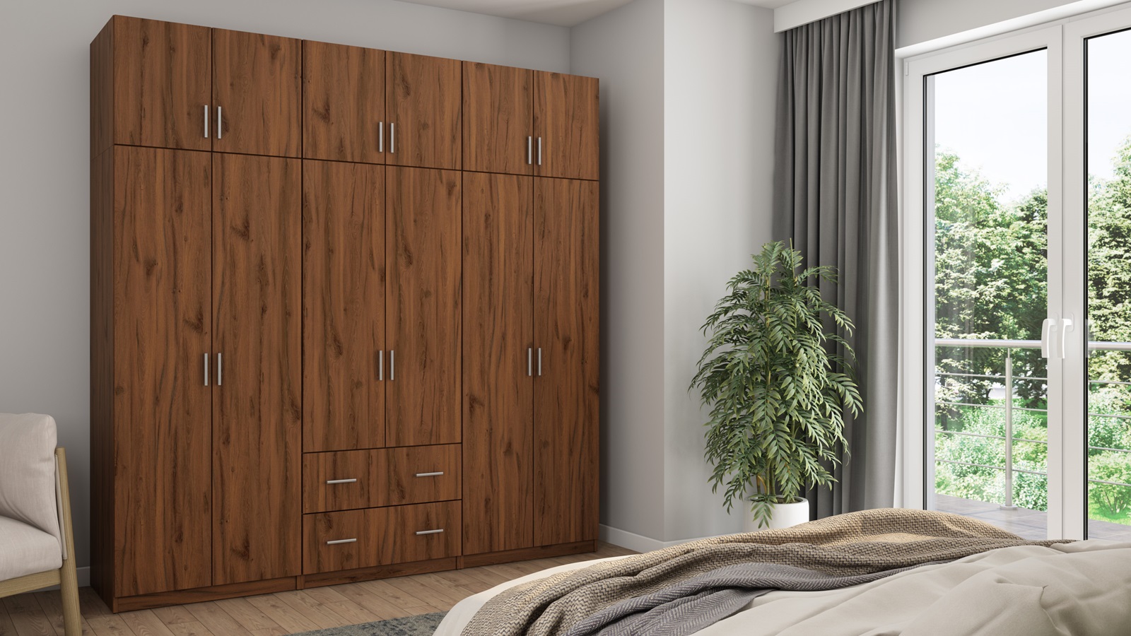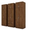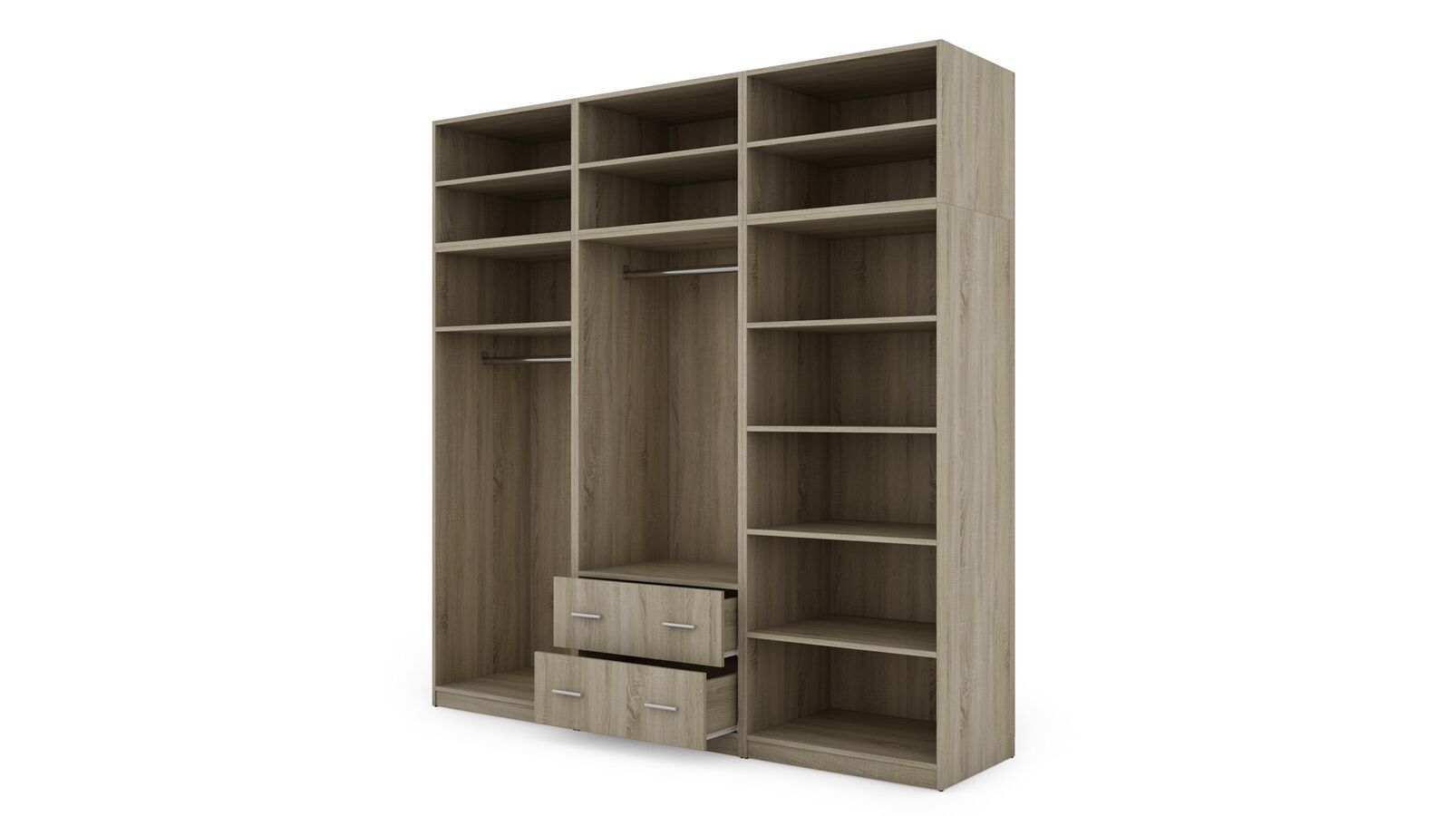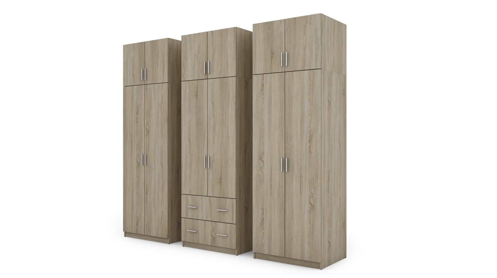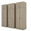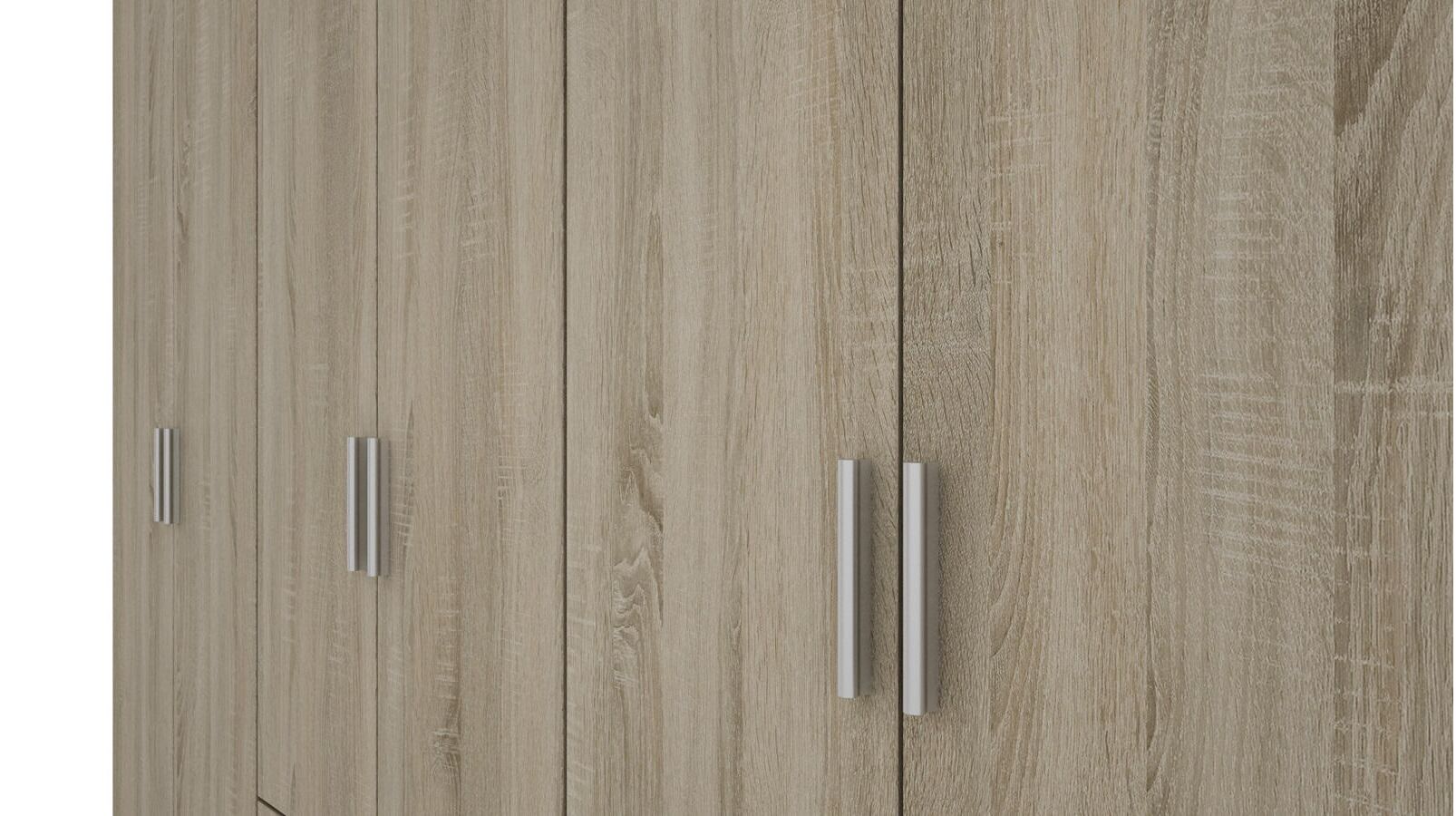 Spinta pagaminta iš aukščiausios kokybės 18 mm dvipusės laminuotos plokštės iš Pfleiderer.• Visi elementai padengti itin atspariu 0,8 mm storio PVC apvadu, taip pat ir apatinėje grindų pusėje. Dėl to spinta įgavo papildomą apsaugą nuo drėgmės plaunant grindis.• Galinės sienelės pagamintos iš HDF plokštės, laminuotos iš vienos pusės (baldo korpuso spalvos), 3 mm storio.• Metalinės drabužių kabyklos.• Problema dėl nelygių grindų? Spintos kojelės tvirtos, reguliuojamos sklendės (užmaskuotas nuimamu cokoliu). Dėl to galite lengvai reguliuoti drabužių spintos lygį.