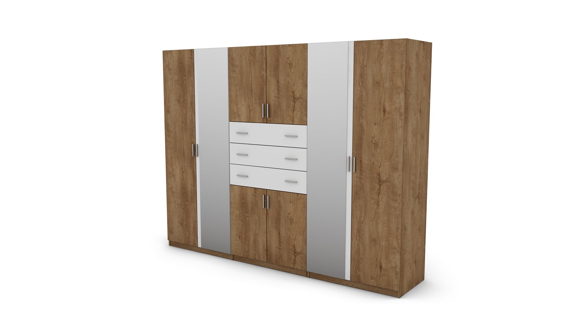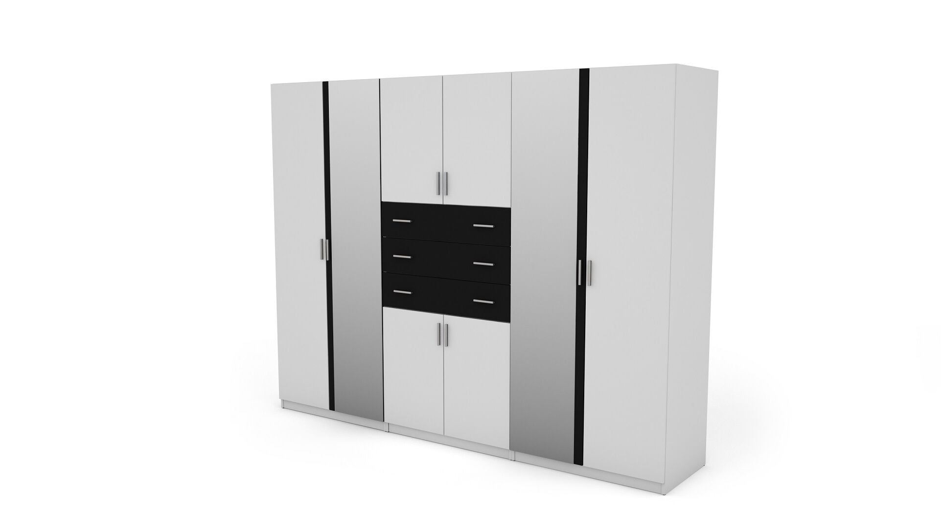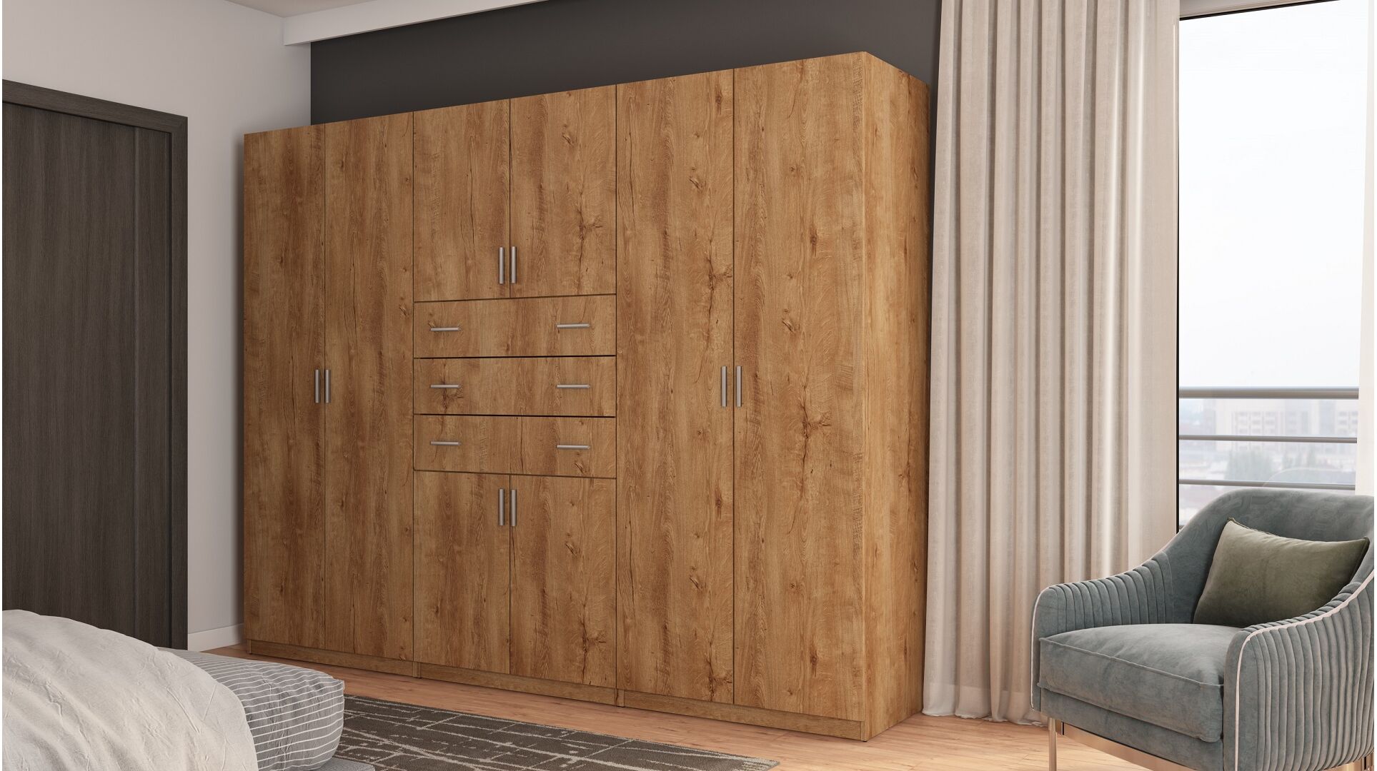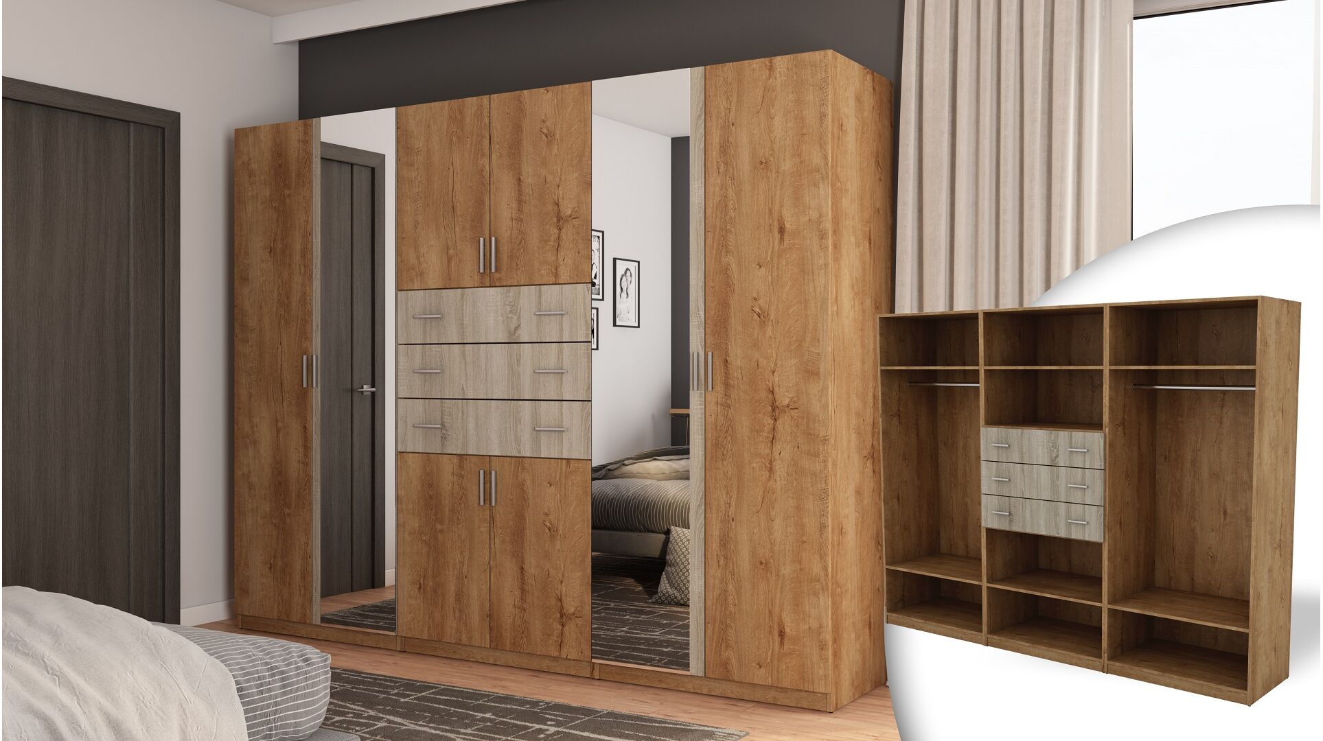 Spinta pagaminta iš aukščiausios kokybės 18 mm dvipusės laminuotos plokštės iš Pfleiderer.• Visi elementai padengti itin atspariu 0,8 mm storio PVC apvadu, taip pat ir apatinėje grindų pusėje. Dėl to spinta įgavo papildomą apsaugą nuo drėgmės plaunant grindis.• Galinės sienelės pagamintos iš HDF plokštės, laminuotos iš vienos pusės (baldo korpuso spalvos), 3 mm storio.• Metalinės drabužių kabyklos.• Problema dėl nelygių grindų? Spintos kojelės tvirtos, reguliuojamos sklendės (užmaskuotas nuimamu cokoliu). Dėl to galite lengvai reguliuoti drabužių spintos lygį.