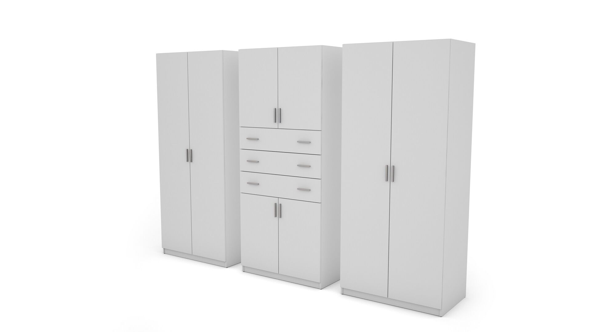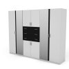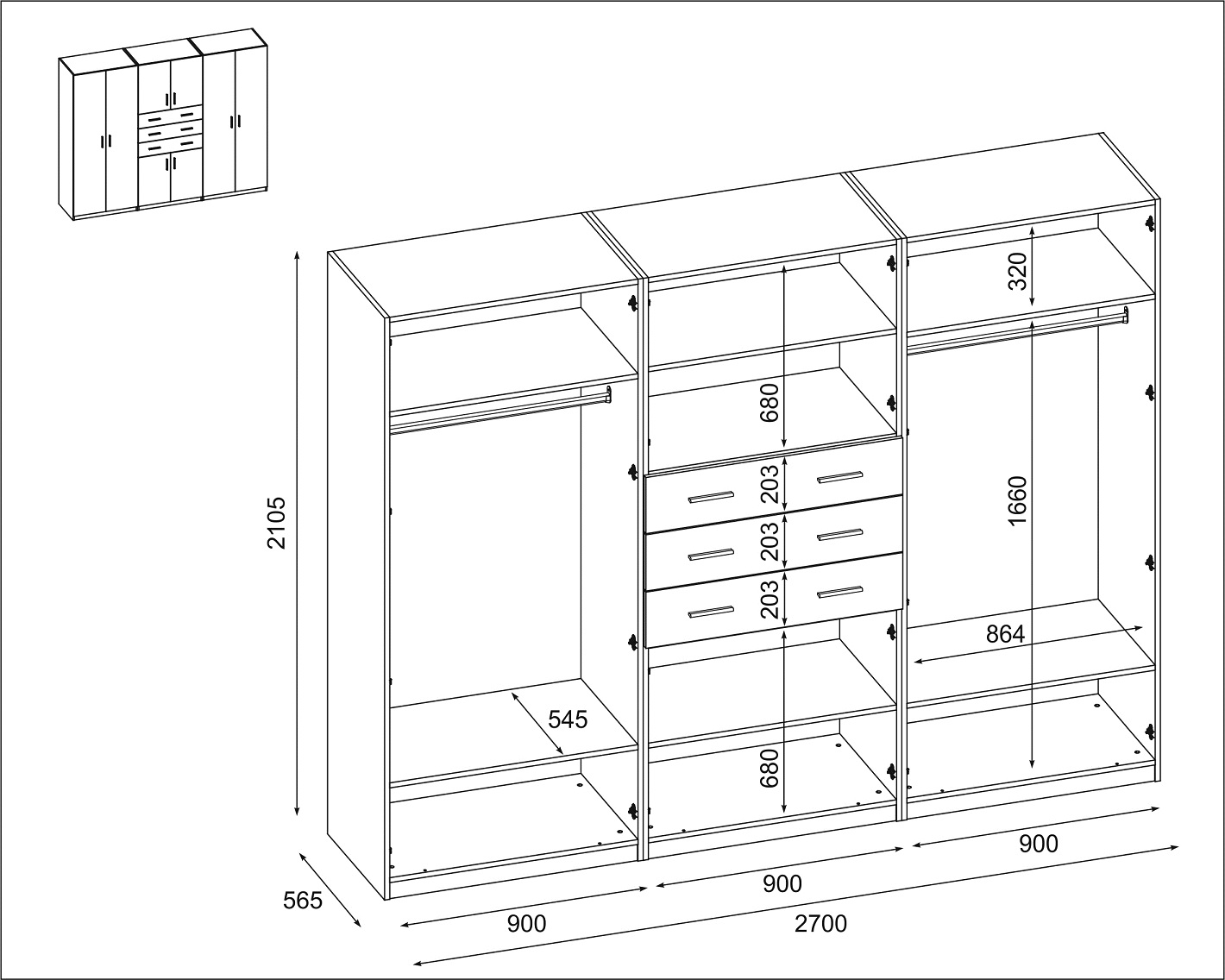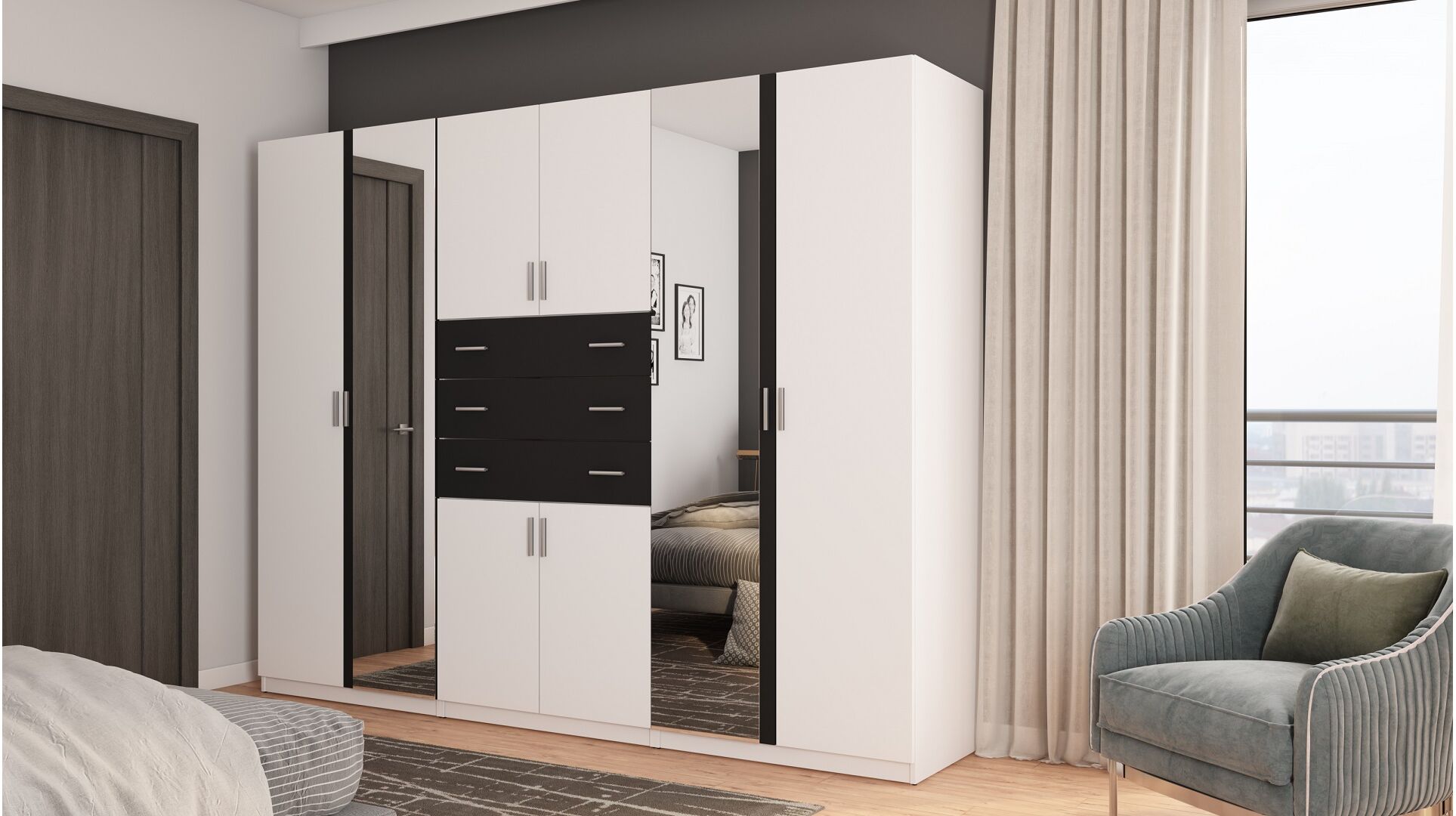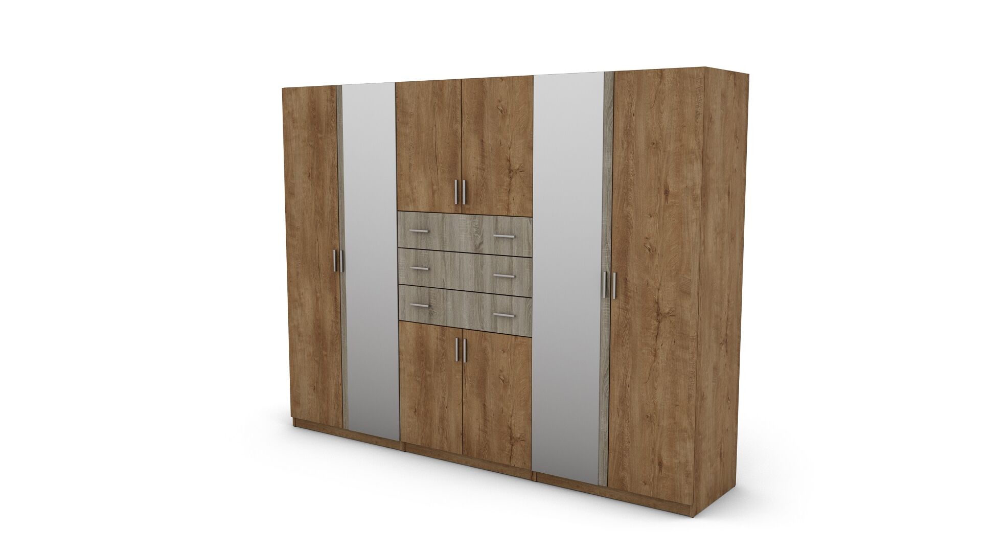 Spinta pagaminta iš aukščiausios kokybės 18 mm dvipusės laminuotos plokštės iš Pfleiderer.• Visi elementai padengti itin atspariu 0,8 mm storio PVC apvadu, taip pat ir apatinėje grindų pusėje. Dėl to spinta įgavo papildomą apsaugą nuo drėgmės plaunant grindis.• Galinės sienelės pagamintos iš HDF plokštės, laminuotos iš vienos pusės (baldo korpuso spalvos), 3 mm storio.• Metalinės drabužių kabyklos.• Problema dėl nelygių grindų? Spintos kojelės tvirtos, reguliuojamos sklendės (užmaskuotas nuimamu cokoliu). Dėl to galite lengvai reguliuoti drabužių spintos lygį.