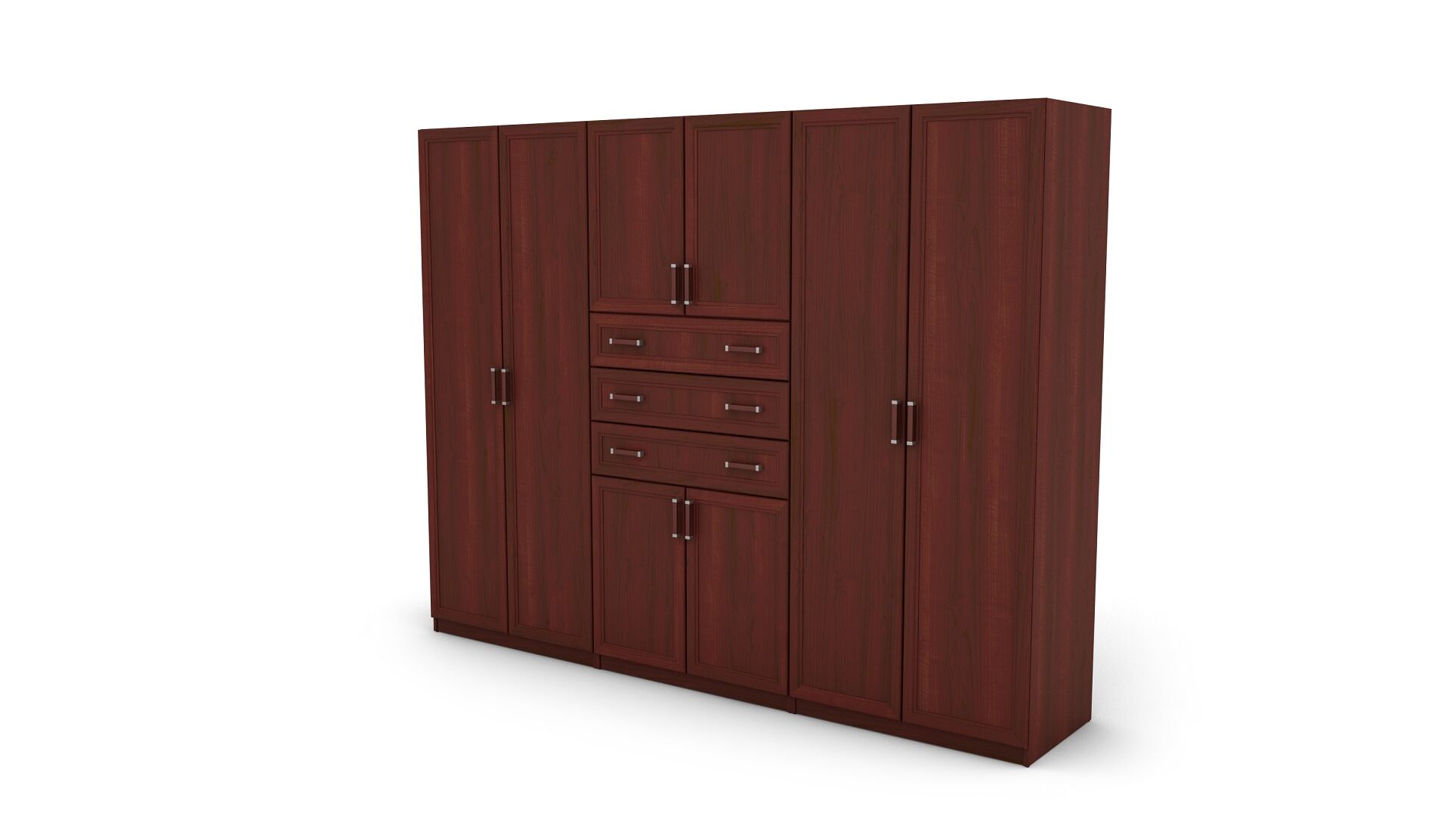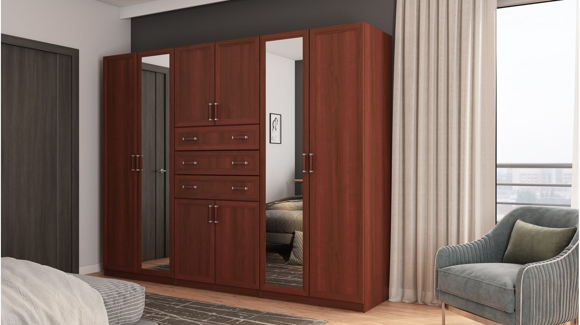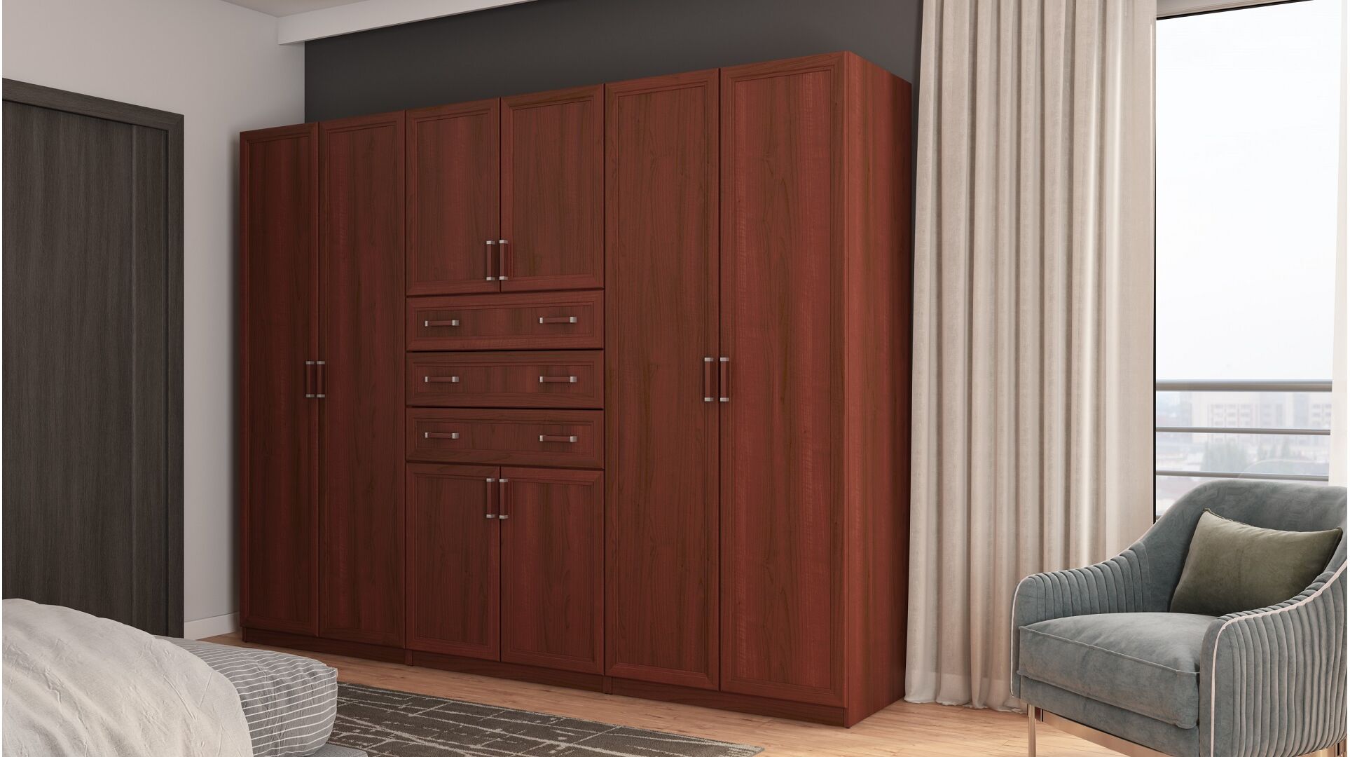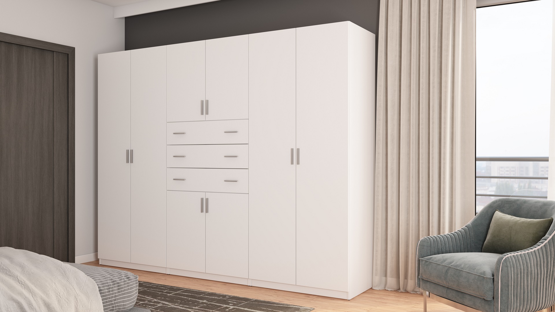 Spinta pagaminta iš aukščiausios kokybės 18 mm dvipusės laminuotos plokštės iš Pfleiderer.• Visi elementai padengti itin atspariu 0,8 mm storio PVC apvadu, taip pat ir apatinėje grindų pusėje. Dėl to spinta įgavo papildomą apsaugą nuo drėgmės plaunant grindis.• Galinės sienelės pagamintos iš HDF plokštės, laminuotos iš vienos pusės (baldo korpuso spalvos), 3 mm storio.• Metalinės drabužių kabyklos.• Problema dėl nelygių grindų? Spintos kojelės tvirtos, reguliuojamos sklendės (užmaskuotas nuimamu cokoliu). Dėl to galite lengvai reguliuoti drabužių spintos lygį.