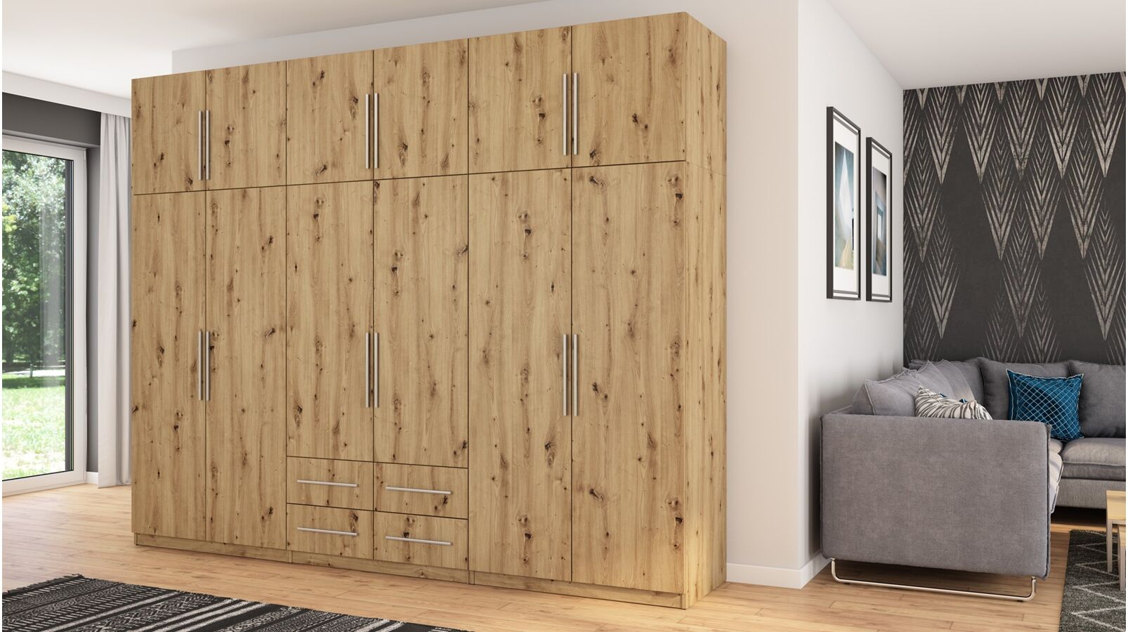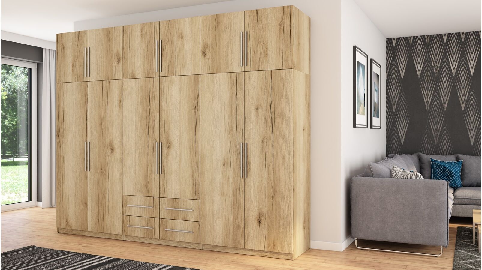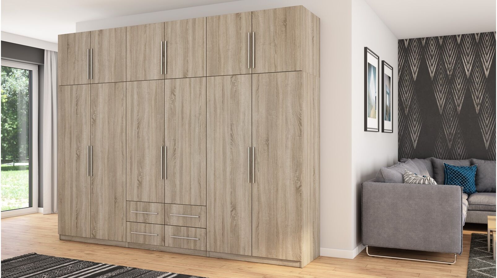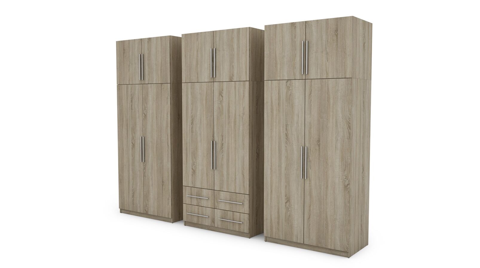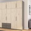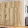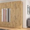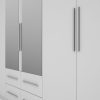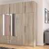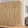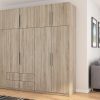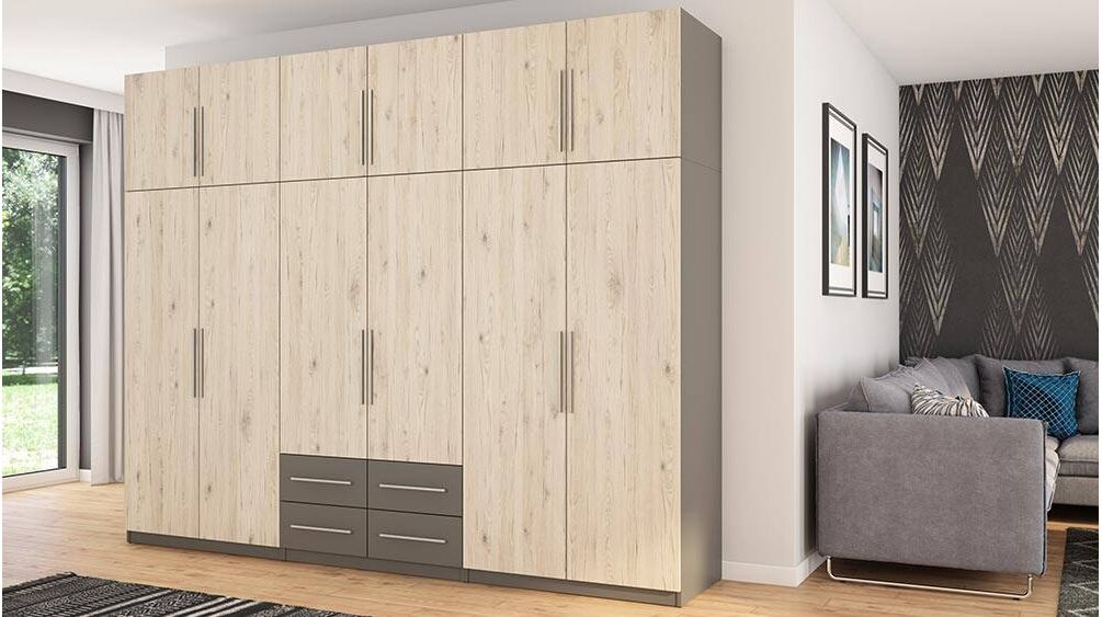 Spinta pagaminta iš aukščiausios kokybės 18 mm dvipusės laminuotos plokštės iš Pfleiderer.• Visi elementai padengti itin atspariu 0,8 mm storio PVC apvadu, taip pat ir apatinėje grindų pusėje. Dėl to spinta įgavo papildomą apsaugą nuo drėgmės plaunant grindis.• Galinės sienelės pagamintos iš HDF plokštės, laminuotos iš vienos pusės (baldo korpuso spalvos), 3 mm storio.• Metalinės drabužių kabyklos.• Problema dėl nelygių grindų? Spintos kojelės tvirtos, reguliuojamos sklendės (užmaskuotas nuimamu cokoliu). Dėl to galite lengvai reguliuoti drabužių spintos lygį.