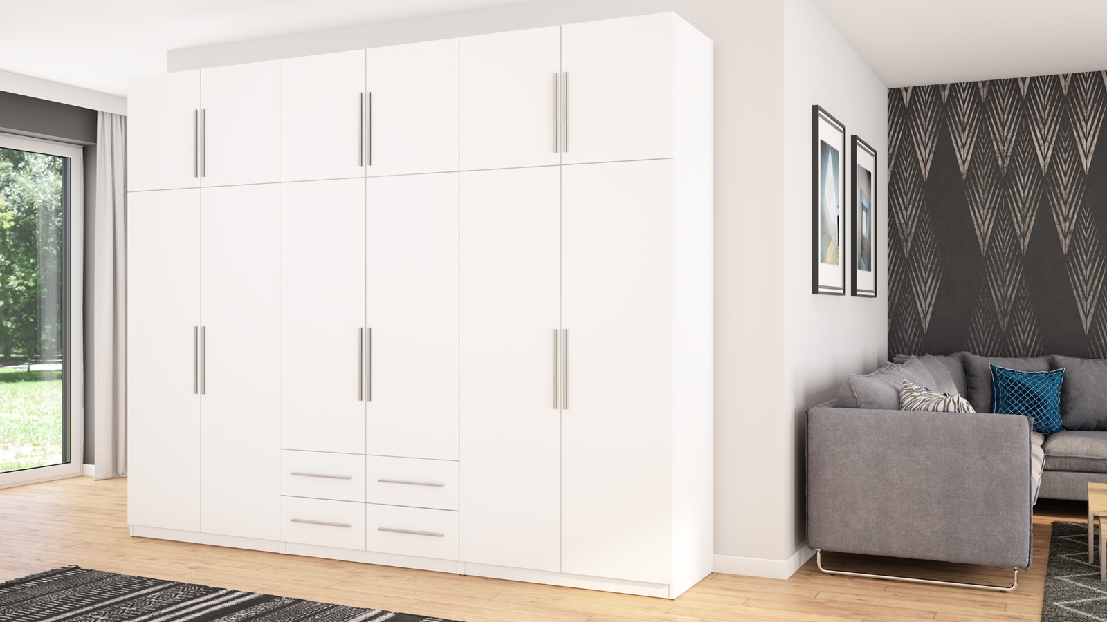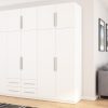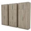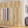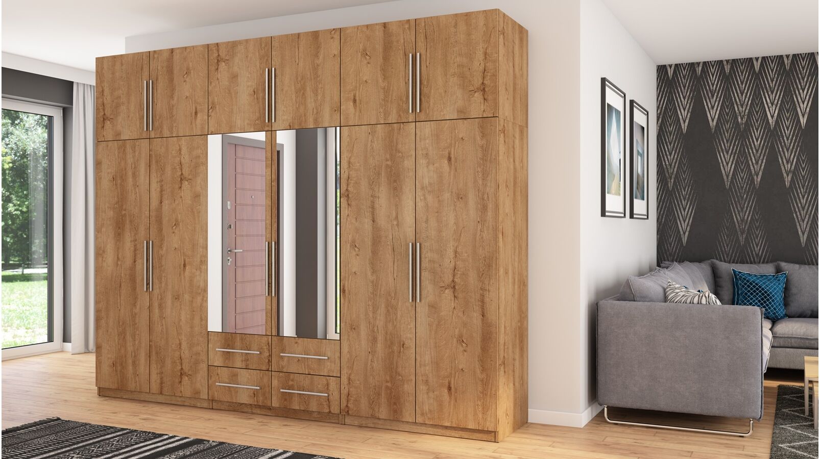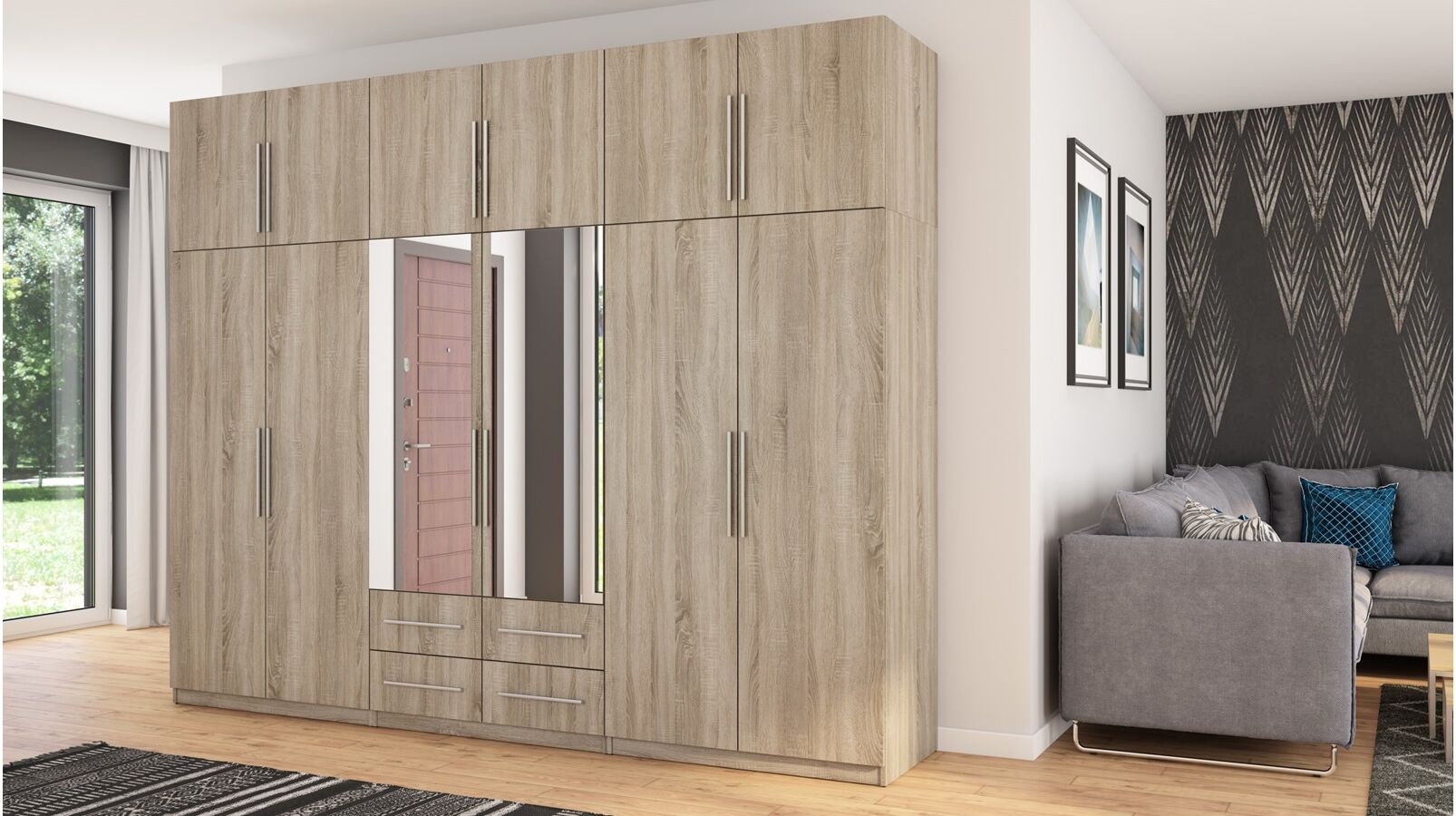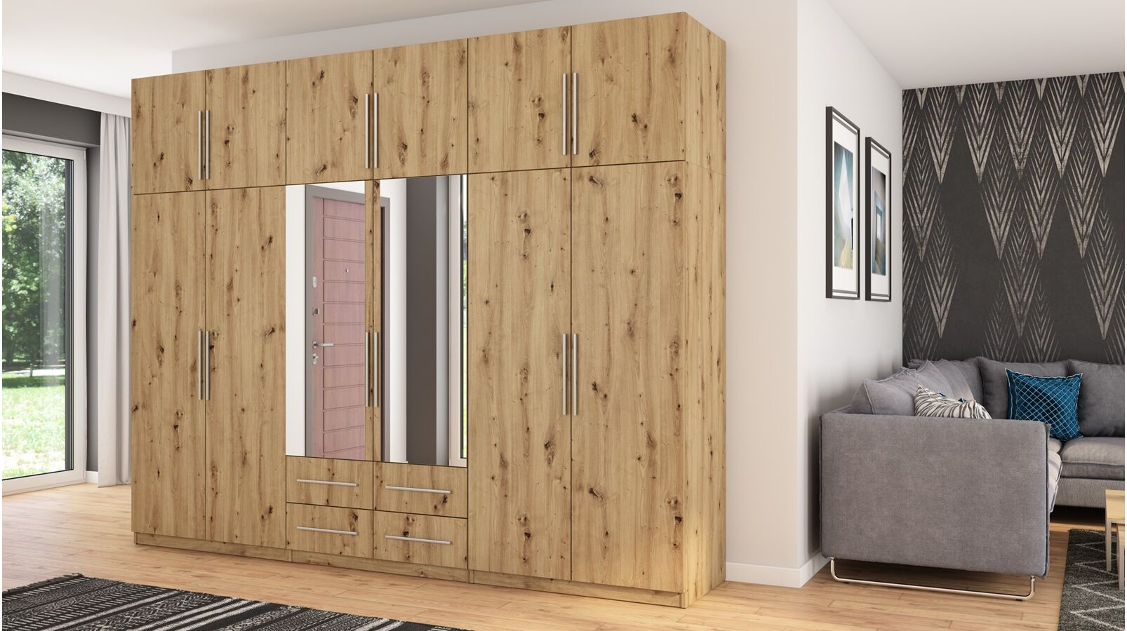 Spinta pagaminta iš aukščiausios kokybės 18 mm dvipusės laminuotos plokštės iš Pfleiderer.• Visi elementai padengti itin atspariu 0,8 mm storio PVC apvadu, taip pat ir apatinėje grindų pusėje. Dėl to spinta įgavo papildomą apsaugą nuo drėgmės plaunant grindis.• Galinės sienelės pagamintos iš HDF plokštės, laminuotos iš vienos pusės (baldo korpuso spalvos), 3 mm storio.• Metalinės drabužių kabyklos.• Problema dėl nelygių grindų? Spintos kojelės tvirtos, reguliuojamos sklendės (užmaskuotas nuimamu cokoliu). Dėl to galite lengvai reguliuoti drabužių spintos lygį.