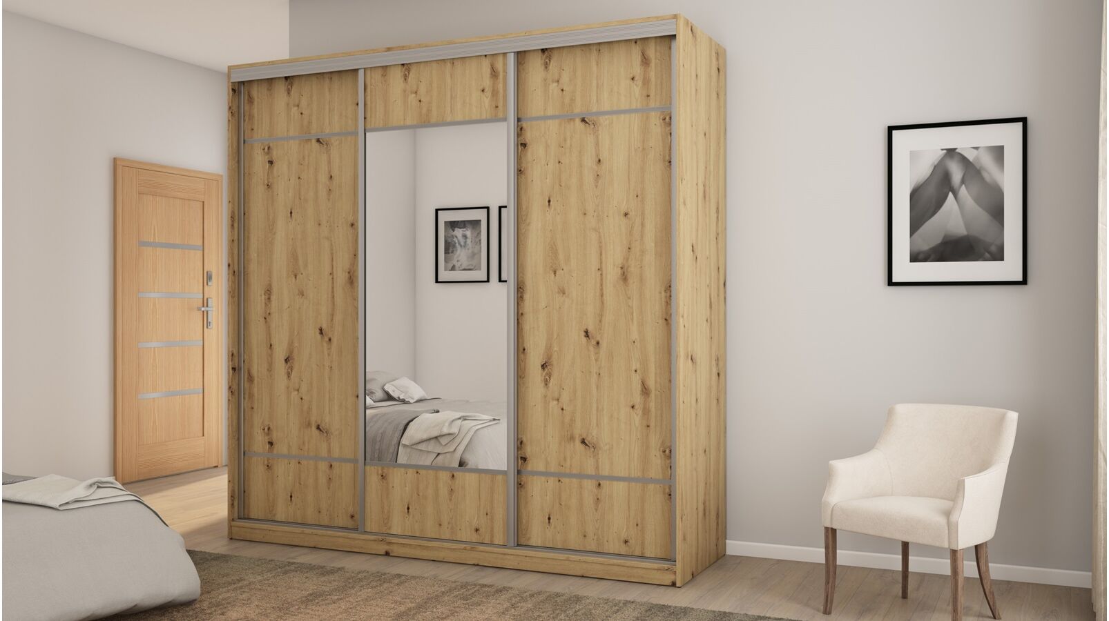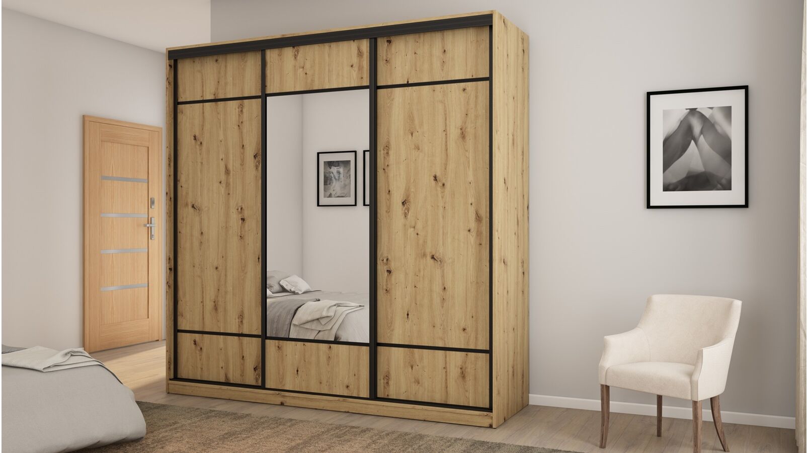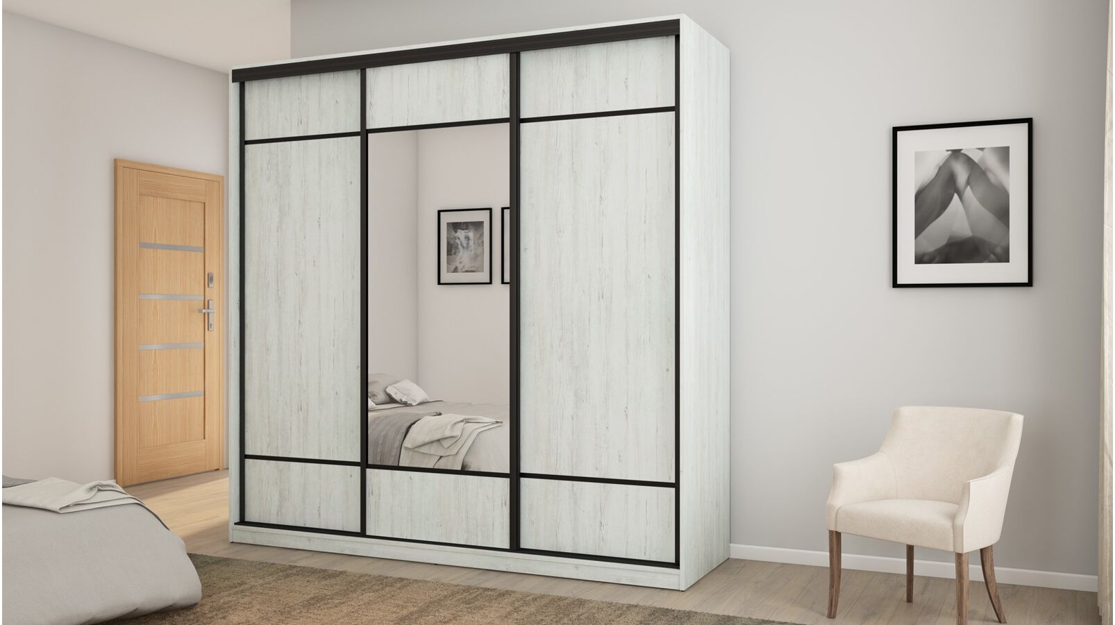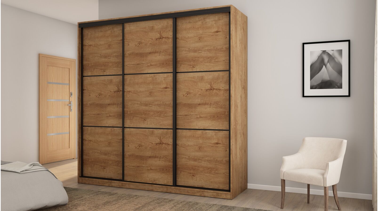 Spinta pagaminta iš aukščiausios kokybės 18 mm dvipusės laminuotos plokštės iš Pfleiderer.• Visi elementai padengti itin atspariu 0,8 mm storio PVC apvadu, taip pat ir apatinėje grindų pusėje. Dėl to spinta įgavo papildomą apsaugą nuo drėgmės plaunant grindis.• Galinės sienelės pagamintos iš HDF plokštės, laminuotos iš vienos pusės (baldo korpuso spalvos), 3 mm storio.• Metalinės drabužių kabyklos.• Problema dėl nelygių grindų? Spintos kojelės tvirtos, reguliuojamos sklendės (užmaskuotas nuimamu cokoliu). Dėl to galite lengvai reguliuoti drabužių spintos lygį.