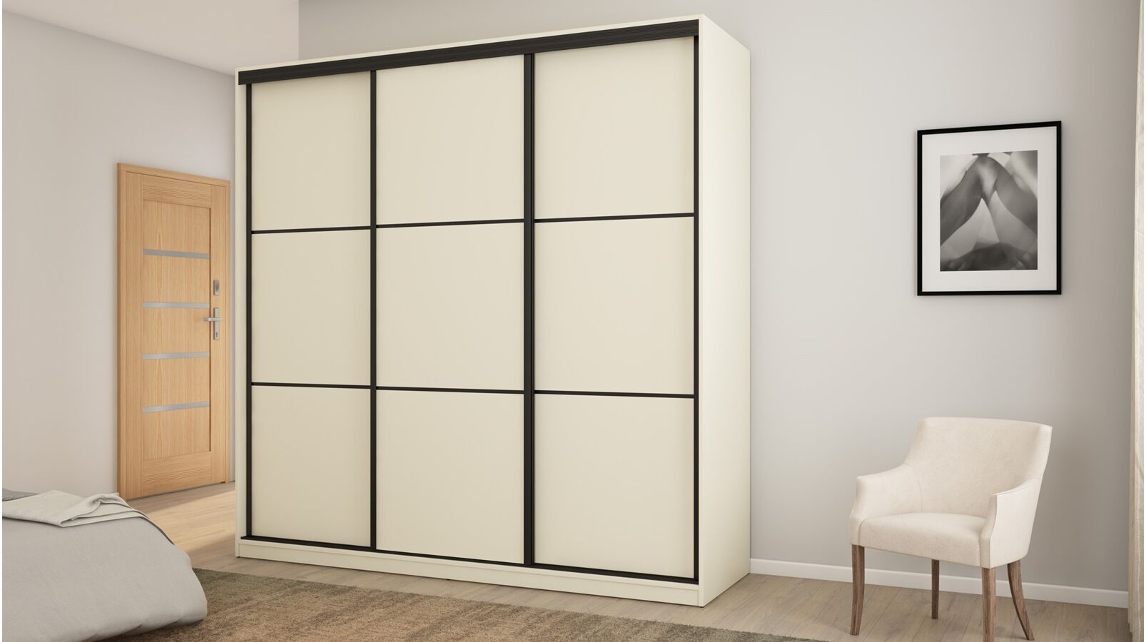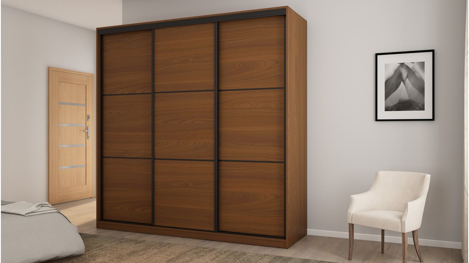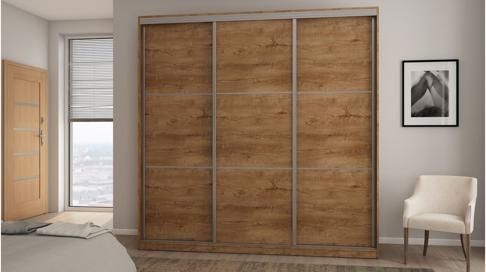 Spinta pagaminta iš aukščiausios kokybės 18 mm dvipusės laminuotos plokštės iš Pfleiderer.• Visi elementai padengti itin atspariu 0,8 mm storio PVC apvadu, taip pat ir apatinėje grindų pusėje. Dėl to spinta įgavo papildomą apsaugą nuo drėgmės plaunant grindis.• Galinės sienelės pagamintos iš HDF plokštės, laminuotos iš vienos pusės (baldo korpuso spalvos), 3 mm storio.• Metalinės drabužių kabyklos.• Problema dėl nelygių grindų? Spintos kojelės tvirtos, reguliuojamos sklendės (užmaskuotas nuimamu cokoliu). Dėl to galite lengvai reguliuoti drabužių spintos lygį.