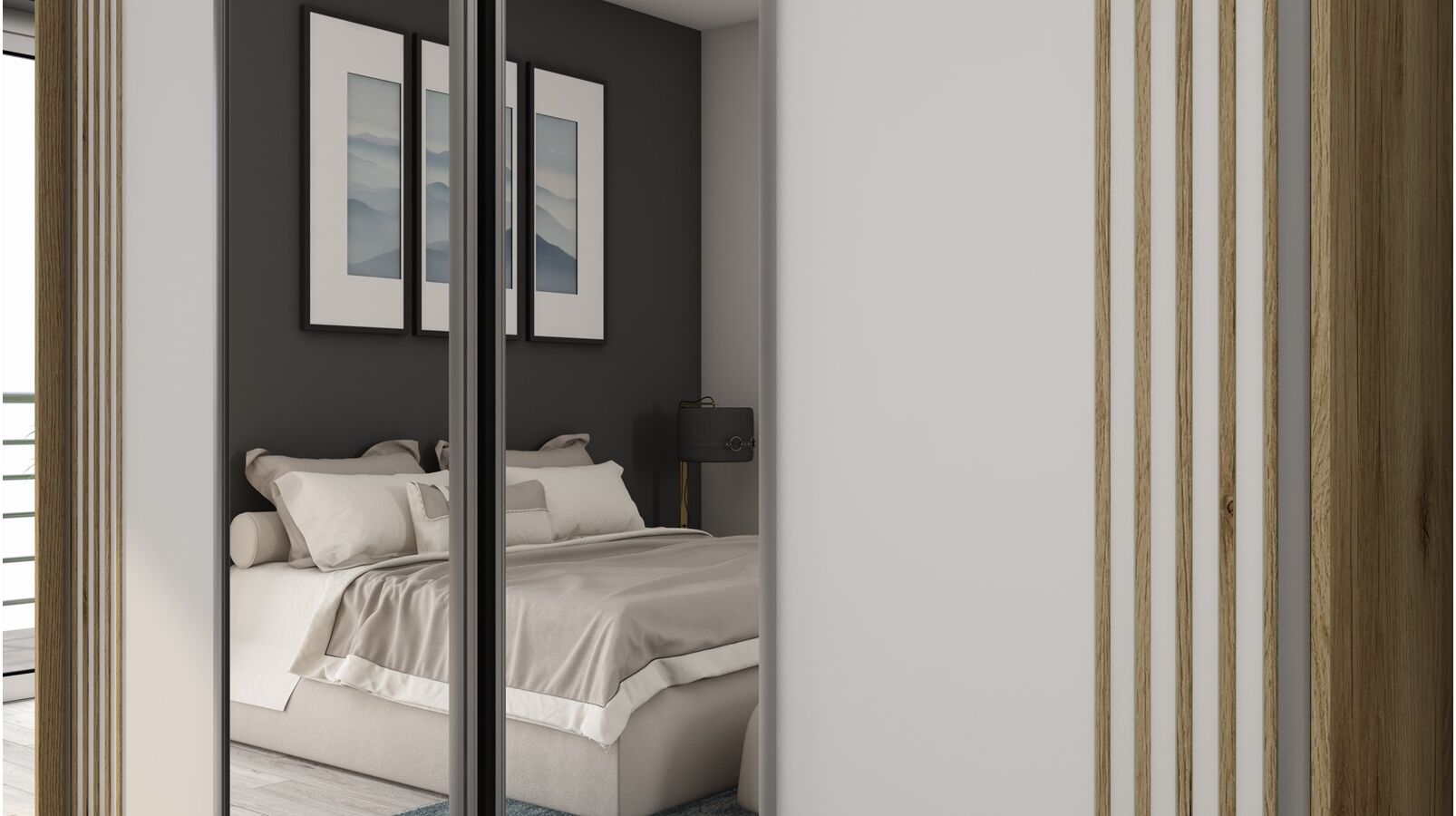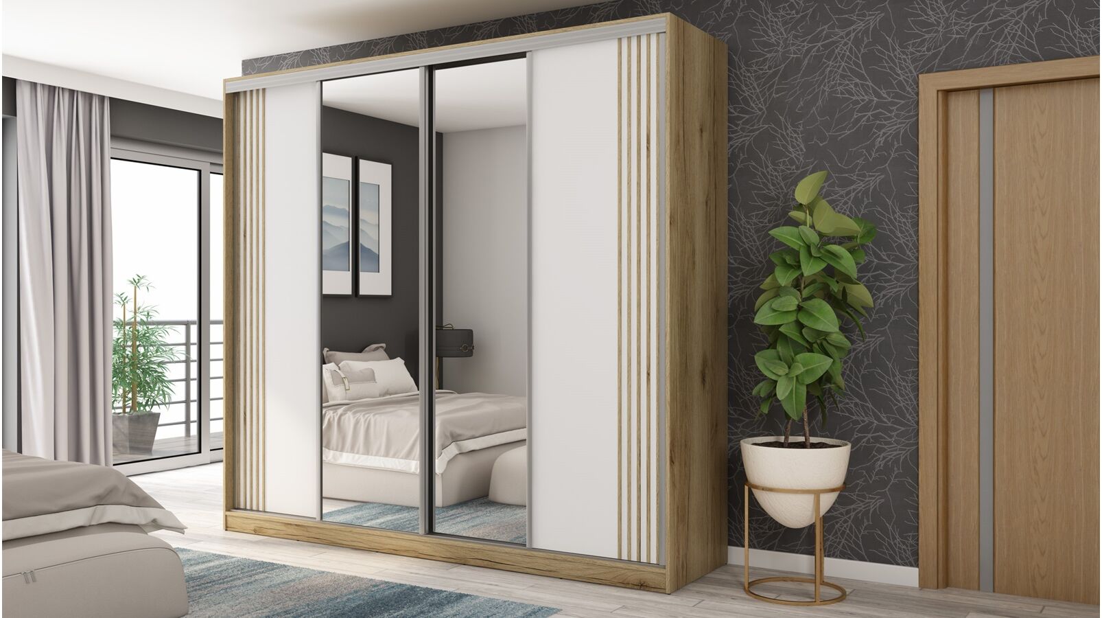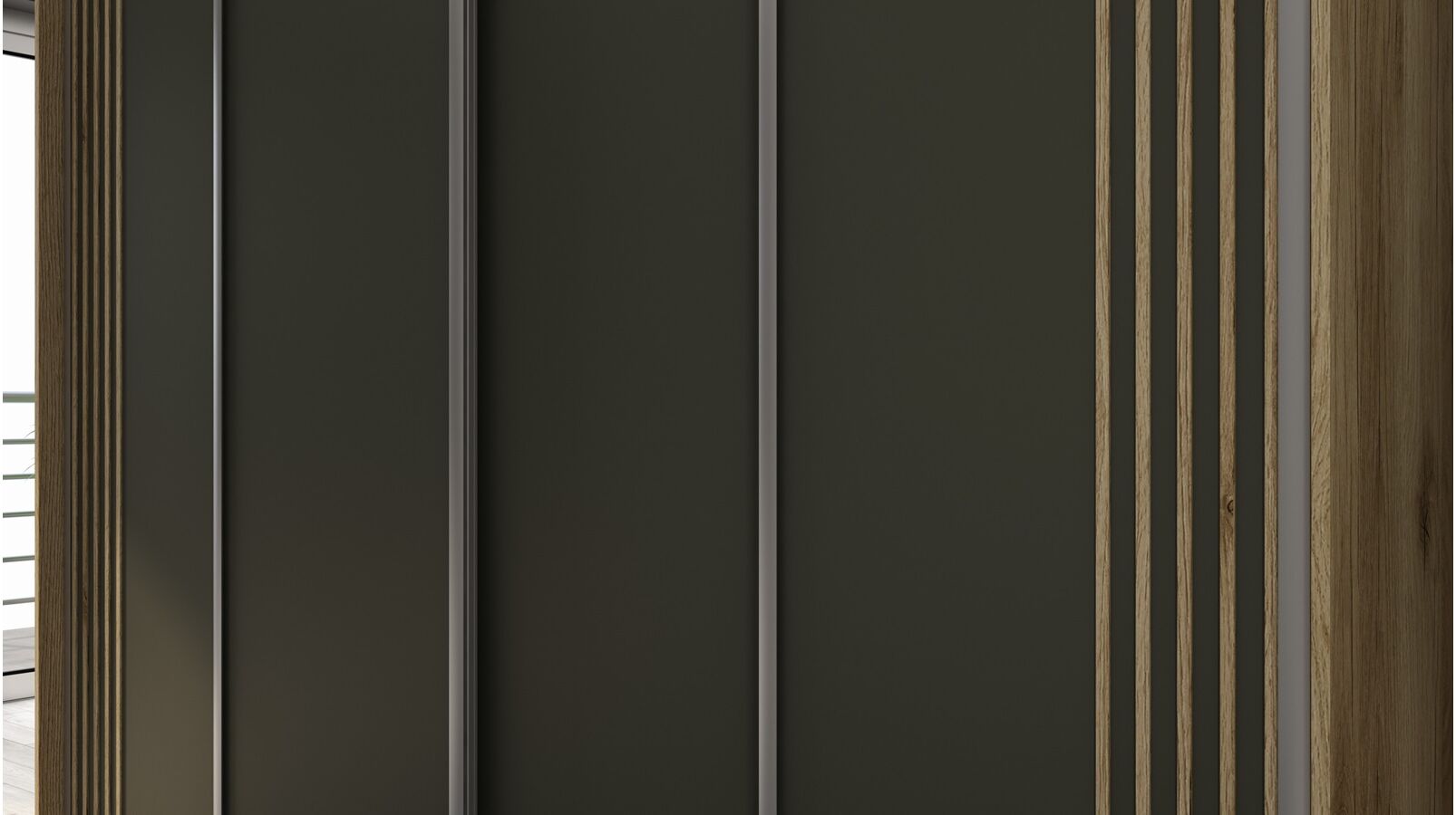 Stumdomos durys dekoruotos madingomis medinę struktūrą ir spalvą primenančiomis MDF juostelėmis. Sutvirtintos specialia baldo korpuso spalvos laminuota folija. Jie yra 4 mm storio ir 15 mm pločio ir klijuojami tiesiai prie durų (vienoda matinė spalva – stipriai kontrastinga). Dėl šio apdorojimo baldai įgavo nuostabų 3D efektą.