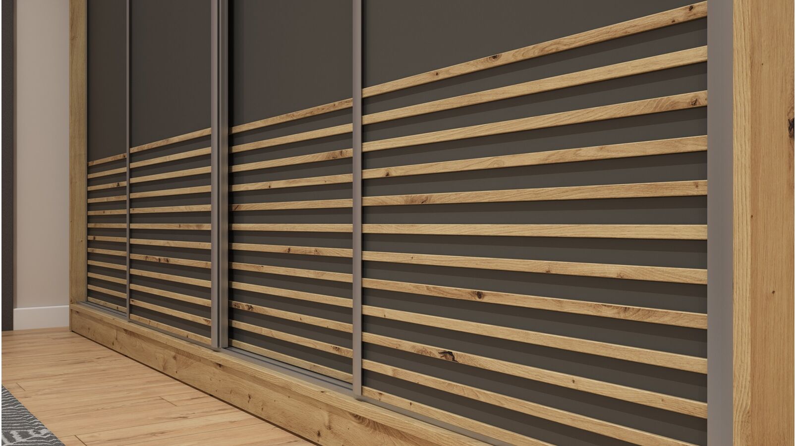 Stumdomos durys dekoruotos madingomis medinę struktūrą ir spalvą primenančiomis MDF juostelėmis. Sutvirtintos specialia baldo korpuso spalvos laminuota folija. Jie yra 4 mm storio ir 15 mm pločio ir klijuojami tiesiai prie durų (vienoda matinė spalva – stipriai kontrastinga). Dėl šio apdorojimo baldai įgavo nuostabų 3D efektą.