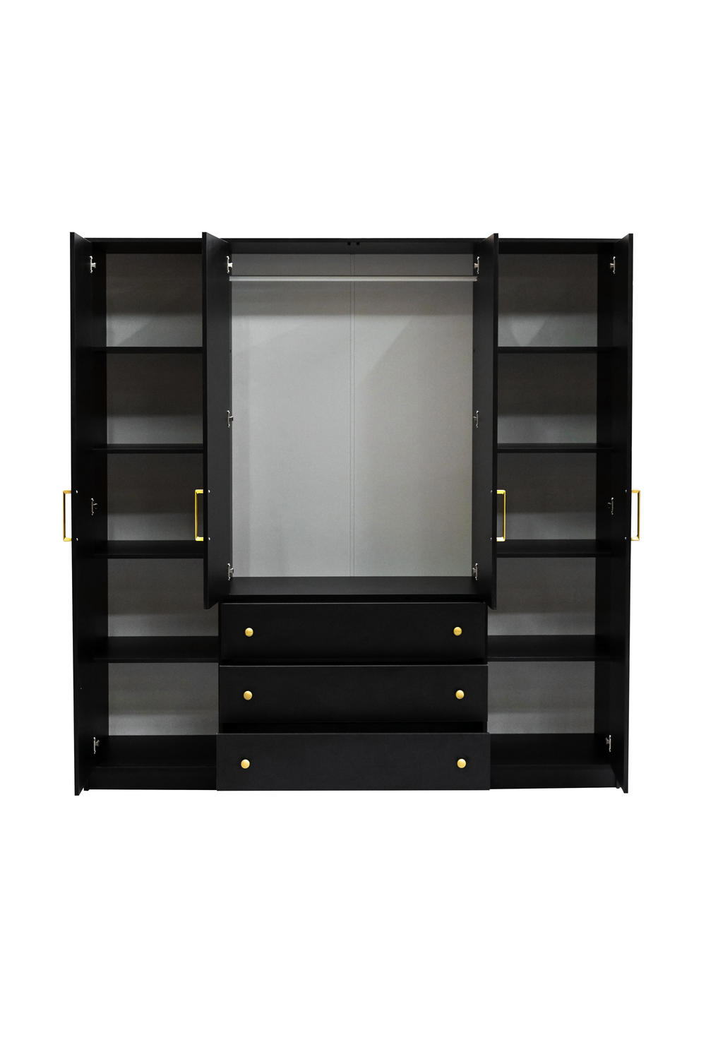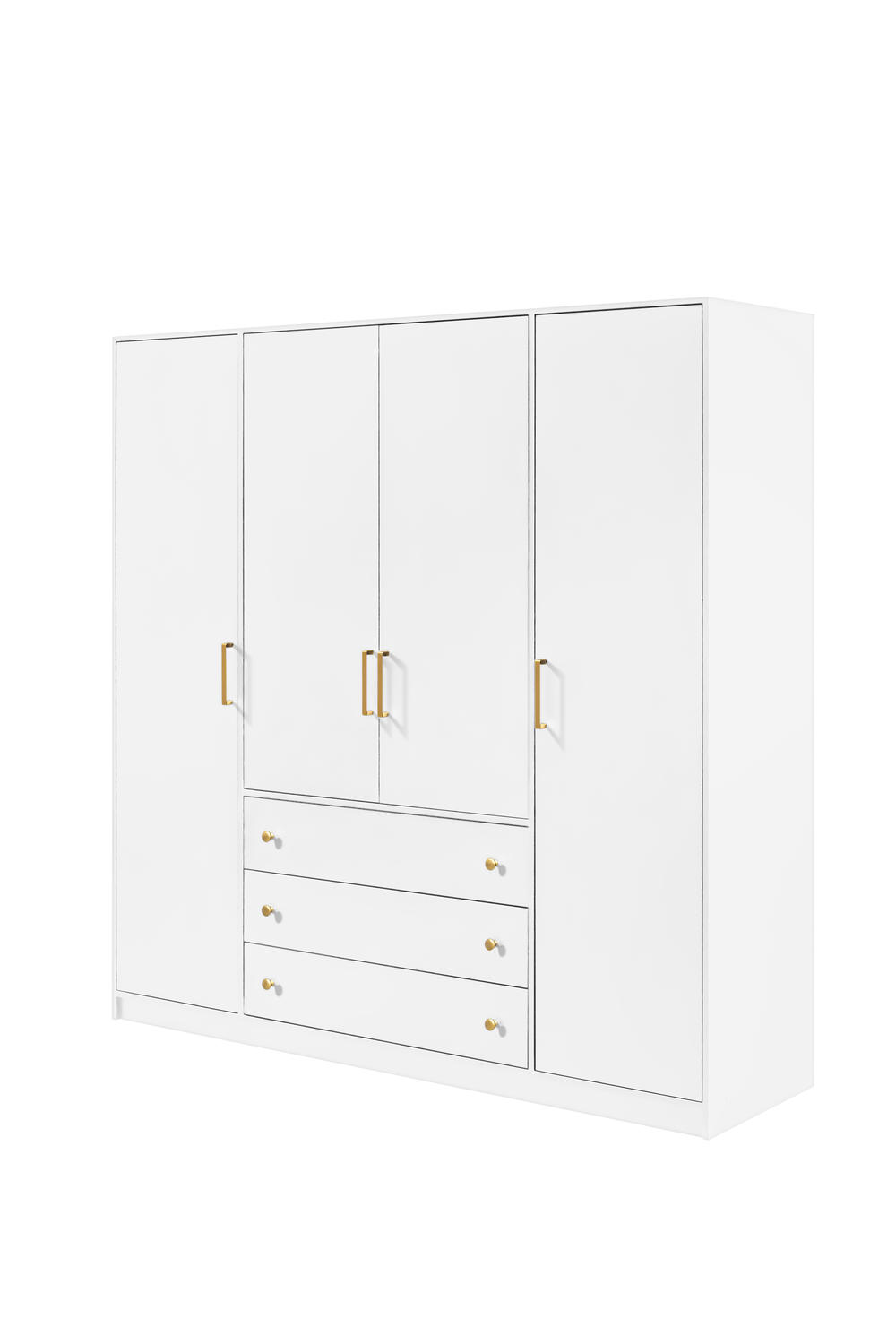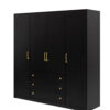 Klasikinio dizaino keturių durų spinta su metalinėmis rankenėlėmis ir varstomų durų sistema, skirta talpiam drabužių sandėliavimui.