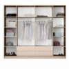 Praktinis erdvės optimizavimas 2550 mm pločio korpusas su sulankstomų durų sistema leidžia patogiai pasiekti spintos turinį neužblokuojant praėjimo kambaryje. Centrinėje dalyje sumontuotas veidrodis vizualiai keičia patalpos gylį ir suteikia papildomo apšvietimo pojūtį. Baldo aukštis siekia 2190 mm, todėl maksimaliai išnaudojamas vertikalus plotas.
