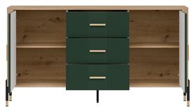 Comoda sudaro trys stalčiai centre bei dvi durelės abipus stalčių (viduje – lentynos), viskas su soft-close švelnaus uždarymo sistema, kuri užtikrina tylų ir saugų naudojimą. Komoda stovi ant grakščių juodų metalinių kojelių su auksiniais antgaliais, pridedančiais elegancijos ir lengvumo. Rankenėlės gali būti pasirenkamos – juodos arba auksinės, atsižvelgiant į interjero dizainą.