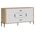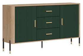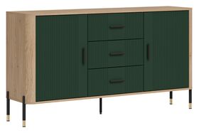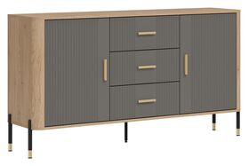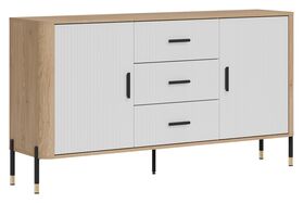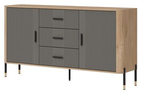 Komodos korpusas pagamintas iš 16 mm storio LMDP plokštės, su elegantiška ąžuolo Cremona Torro tekstūra. Šoninės plokštės – 32 mm MDF, suteikiančios stabilumo ir vizualinio masyvumo. Fasadai – 18 mm MDF, dekoruoti subtiliais vertikaliais grioveliais, ir gali būti dažyti vienu iš šių matinės spalvos variantų: balta, kašmyro, žalia, pilka arba antracito.