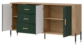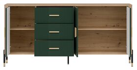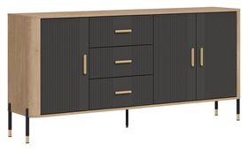 Komodoje įrengti 3 talpūs stalčiai ir 3 durelės su lentynomis – visa tai su soft-close švelnaus uždarymo sistema. Ji stovi ant juodų metalinių kojelių su auksiniais akcentais, o rankenėles galima rinktis – juodos arba auksinės, priklausomai nuo interjero tono.