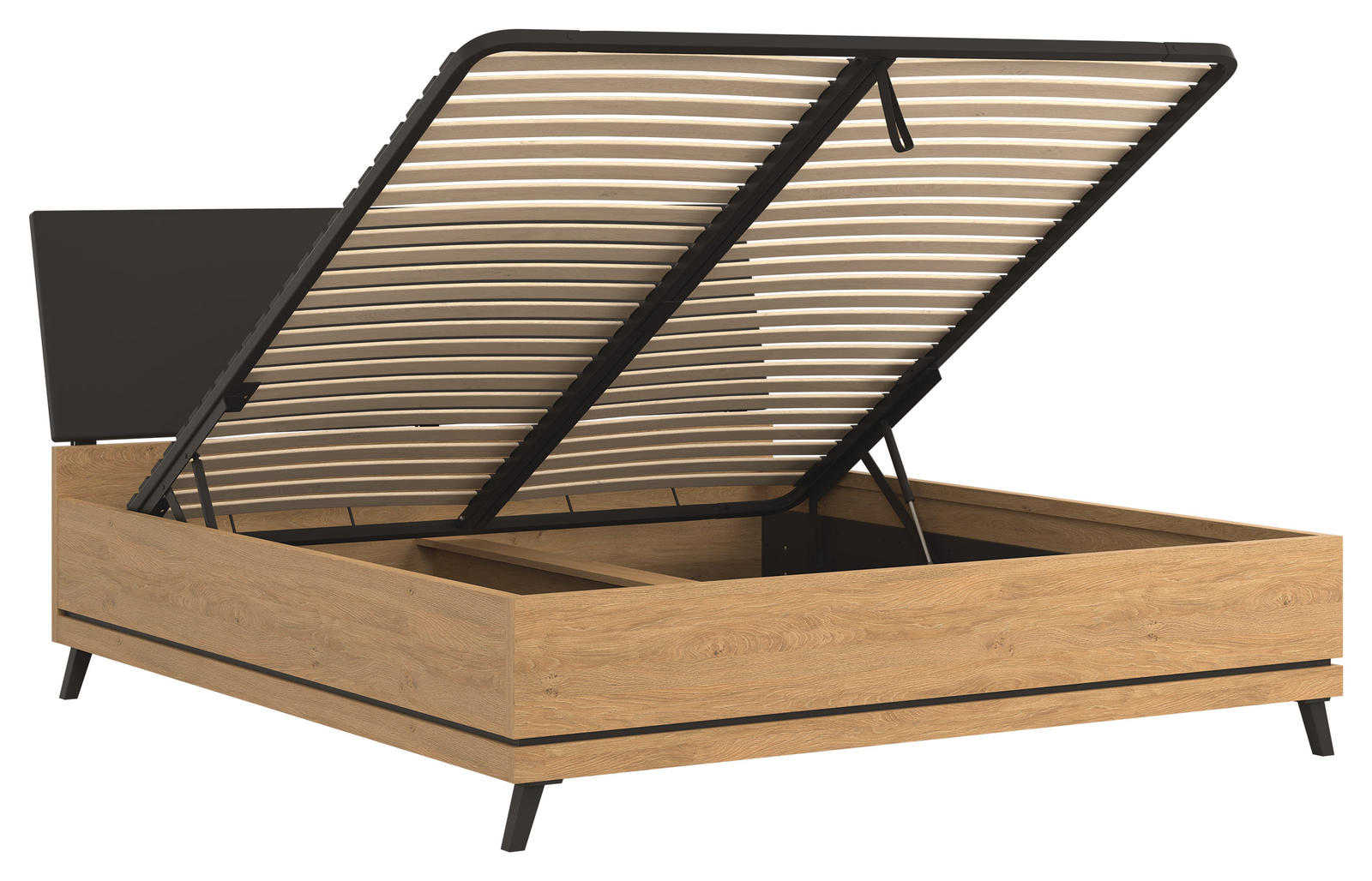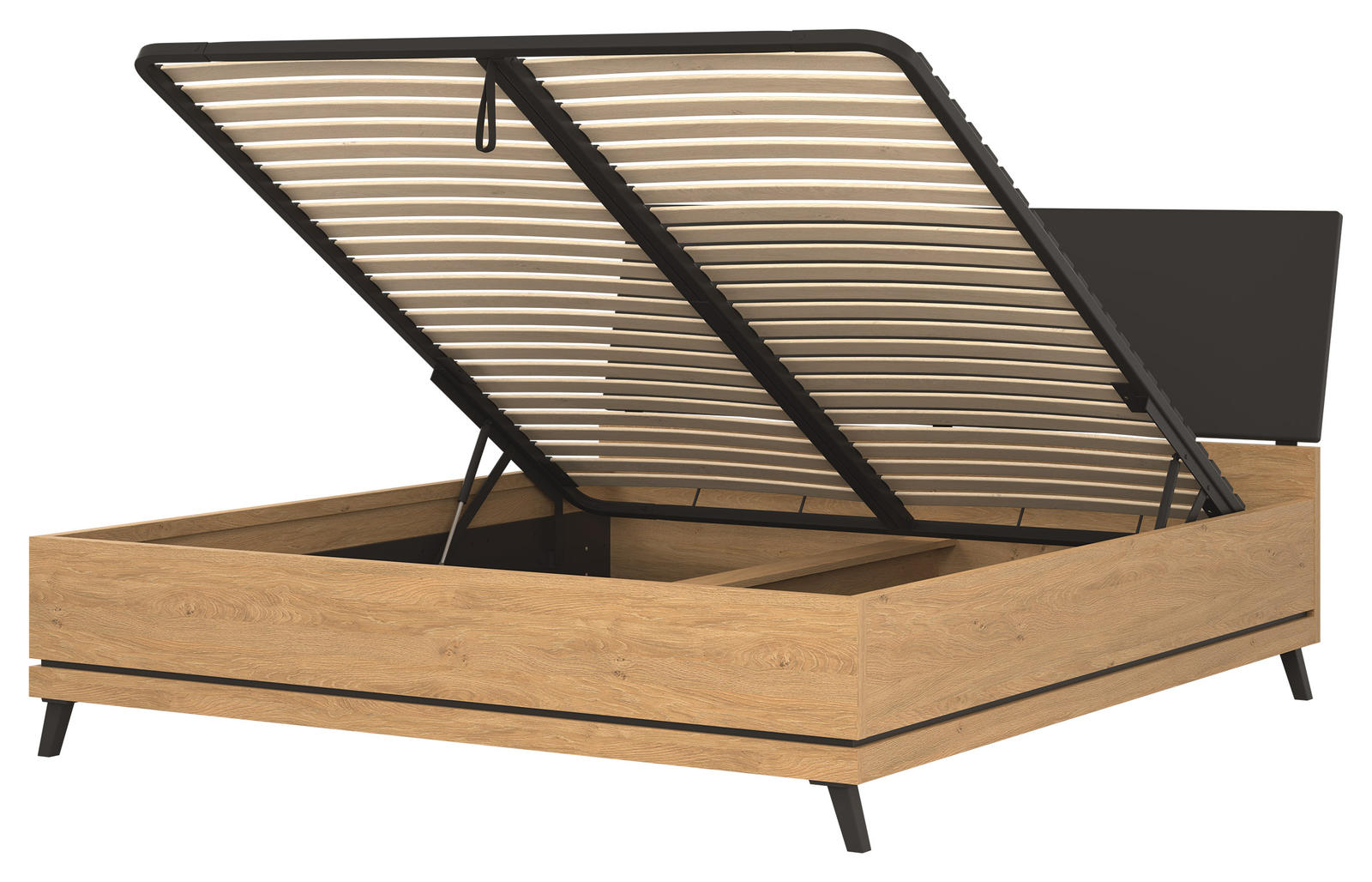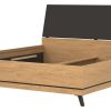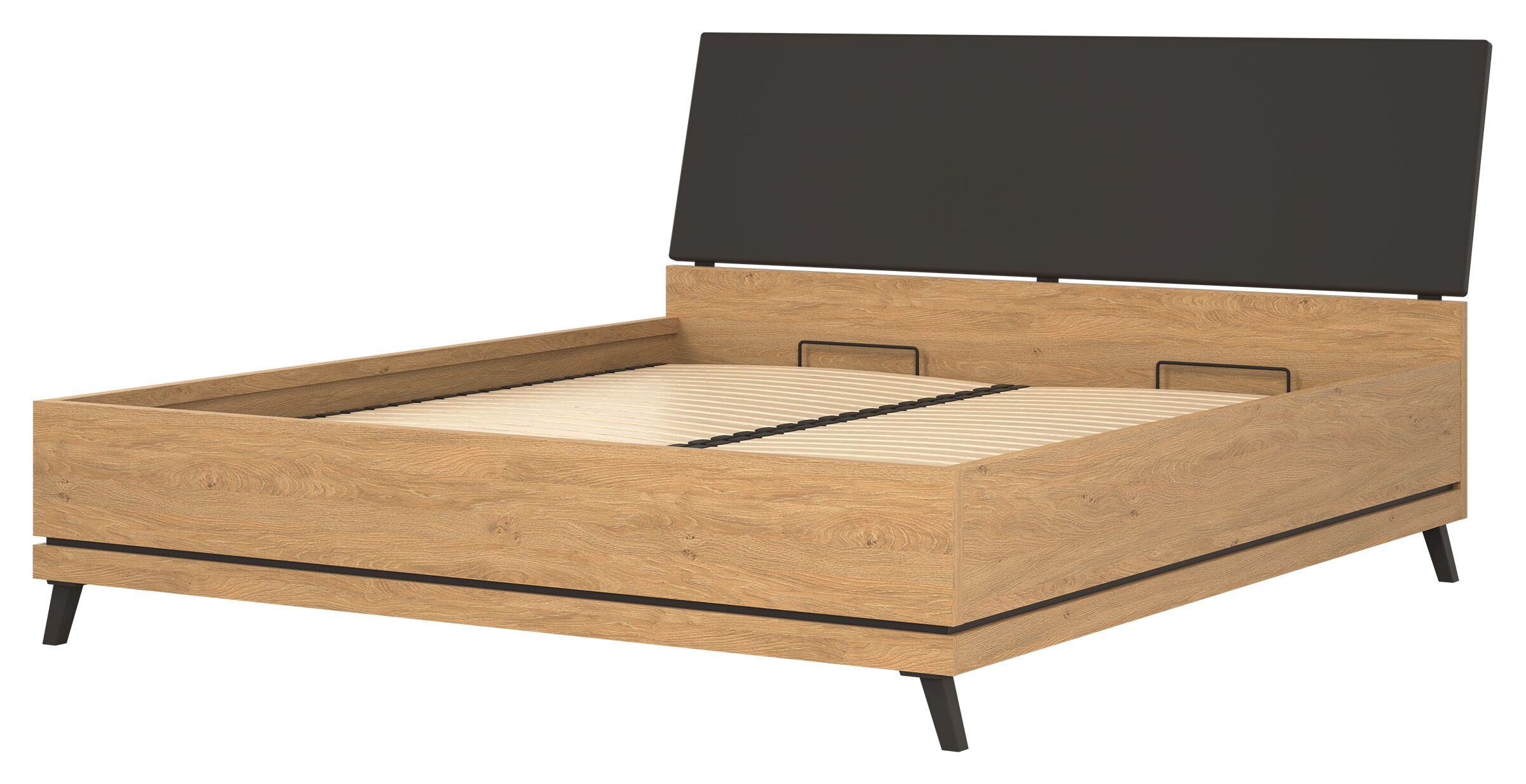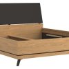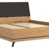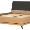 Lova Ate 180×200 cm, pagaminta iš LMDP ąžuolo spalvos, su juodos spalvos gobeleniniu galvūgalio apmušalu, reguliuojamomis kojelėmis ir patalynės dėže, modernūs baldai iš Lenkijos Jūsų miegamajam.