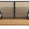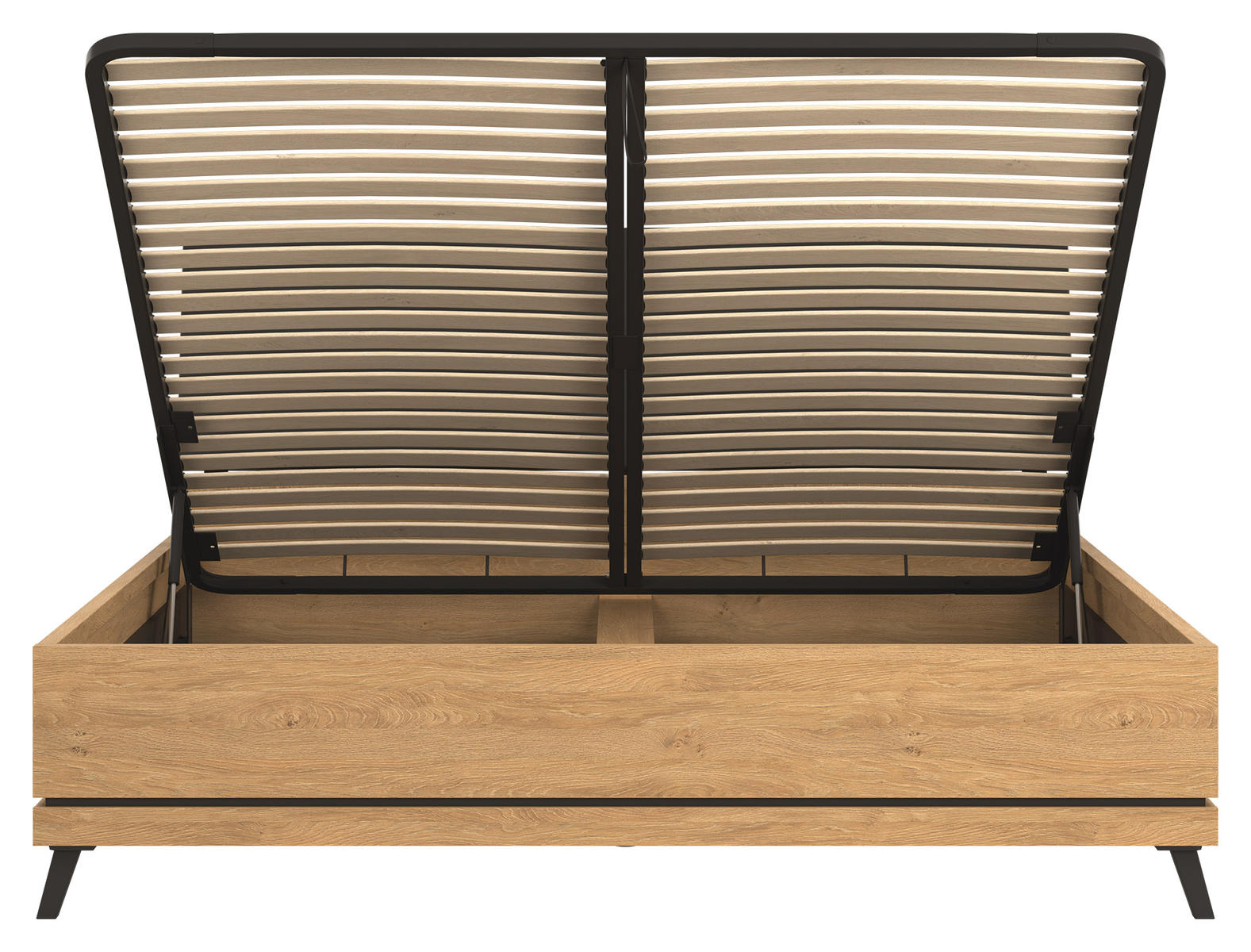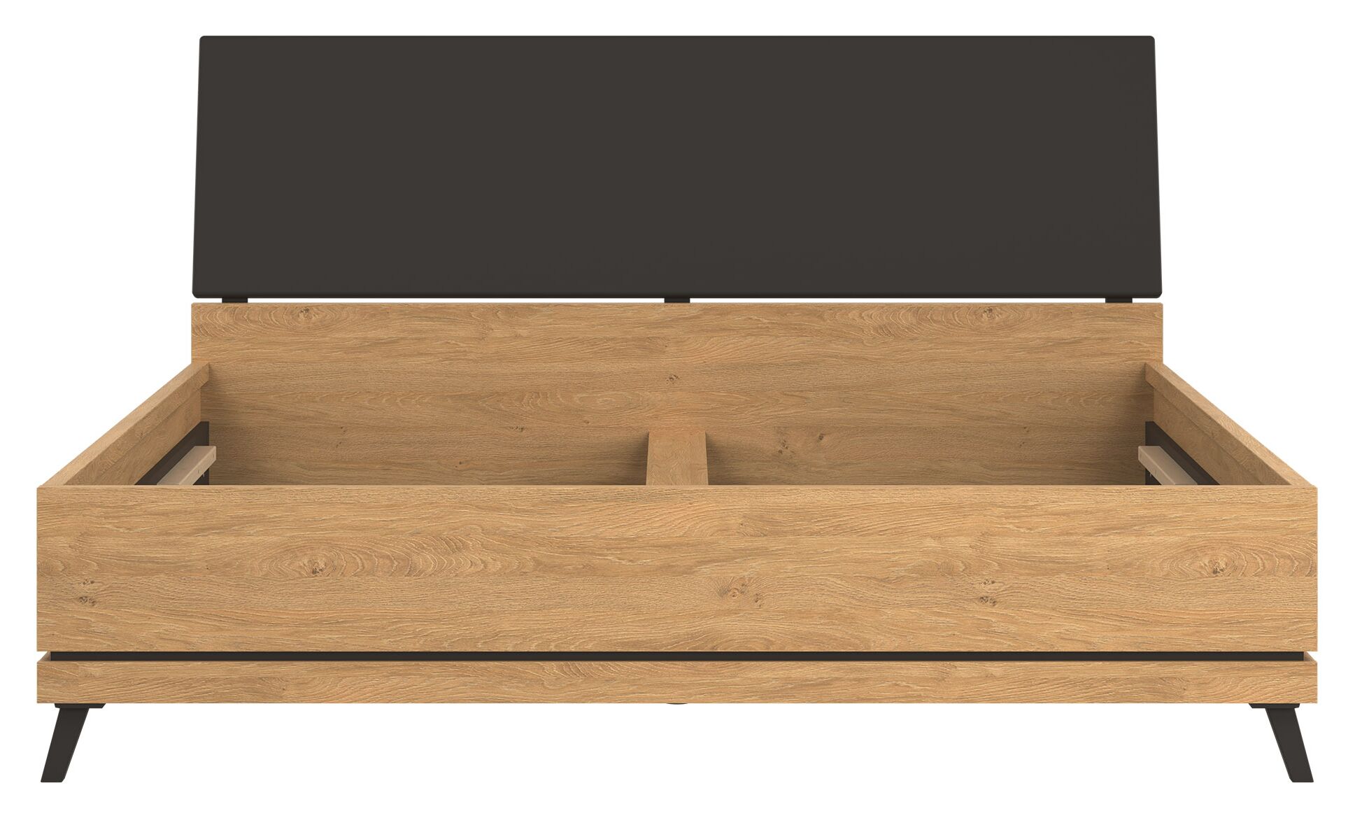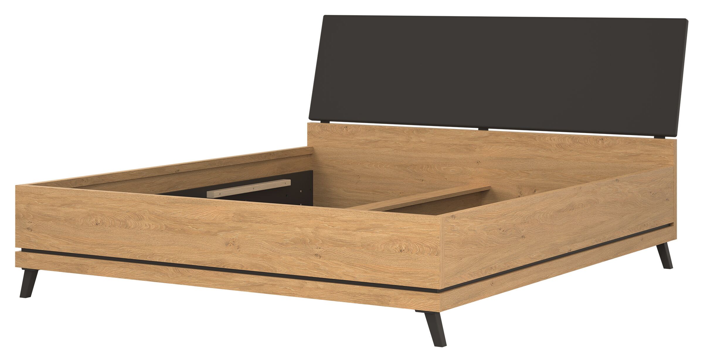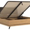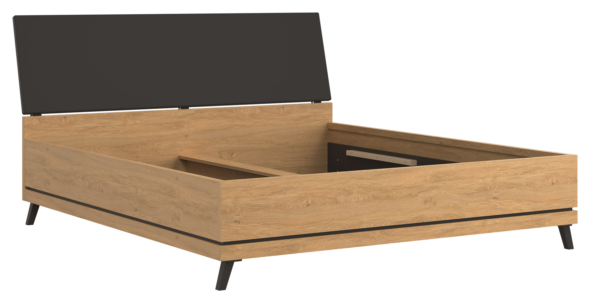 Lova Ate 180×200 cm, pagaminta iš LMDP ąžuolo spalvos, su juodos spalvos gobeleniniu galvūgalio apmušalu, reguliuojamomis kojelėmis ir patalynės dėže, modernūs baldai iš Lenkijos Jūsų miegamajam.