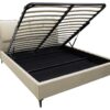 Konstrukcija pritaikyta 160×200 cm čiužiniui, todėl lova patogiai tinka standartiniam dviguliam miegui. Po grotelėmis įrengta erdvi patalynės dėžė, kuri atsidaro pakėlus metalinį grotelių rėmą. Tai patogus sprendimas patalynei, sezoniniams drabužiams ar kitiems daiktams laikyti, taupantis vietą miegamajame.