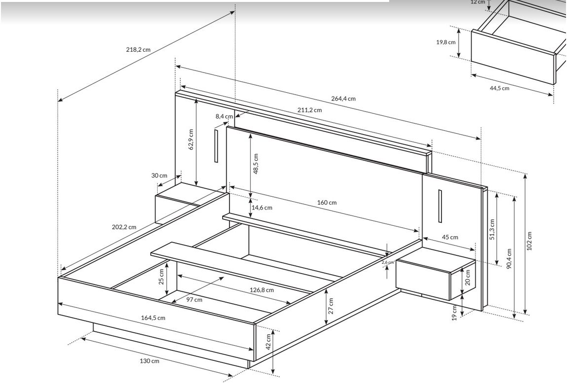 Lova 3D 160 B (su naktiniais staliukais + led) – 1016/2612/2182 mm;