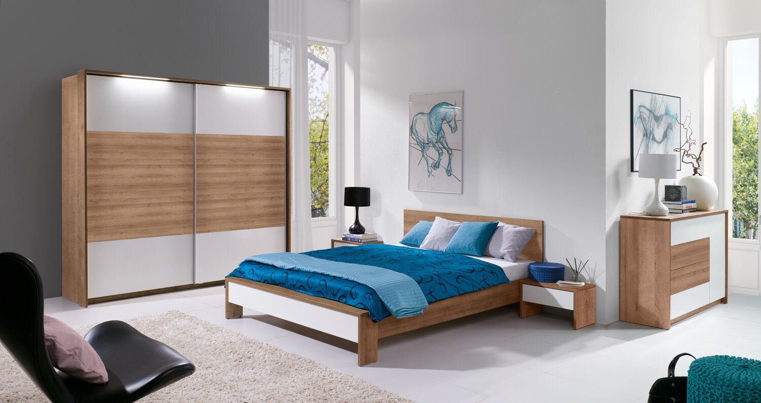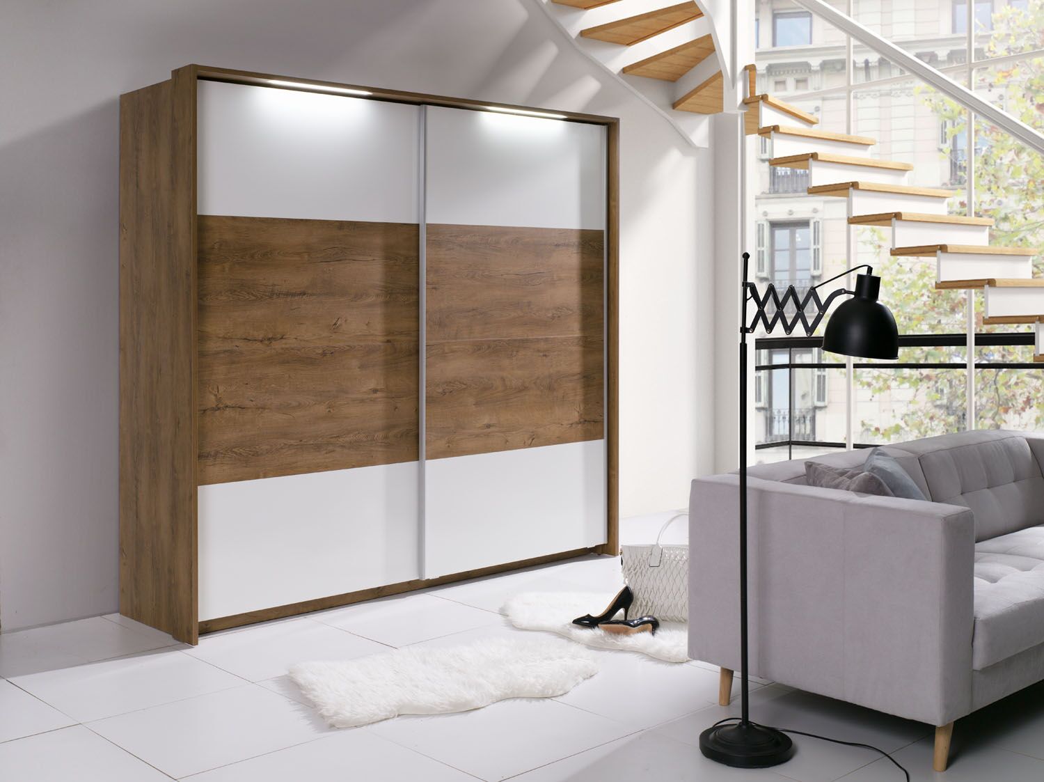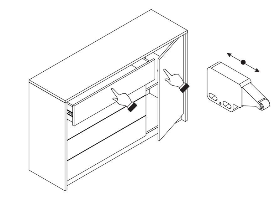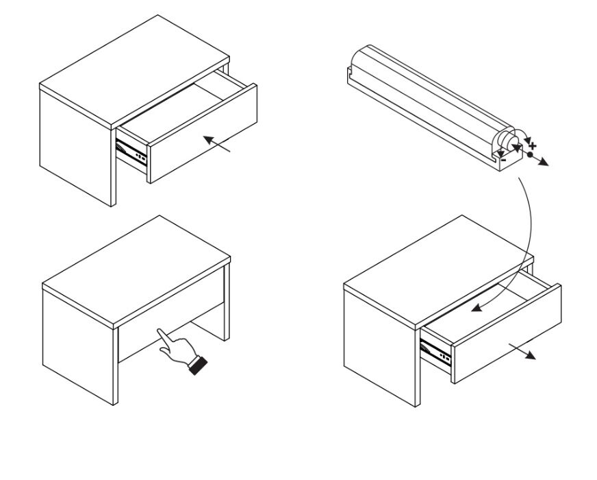 Led apšvietimas spintoje. Komoda ir naktinis staliukas turi stalčių ir durelių atidarymą su atmetimo funkcija „Push Open”