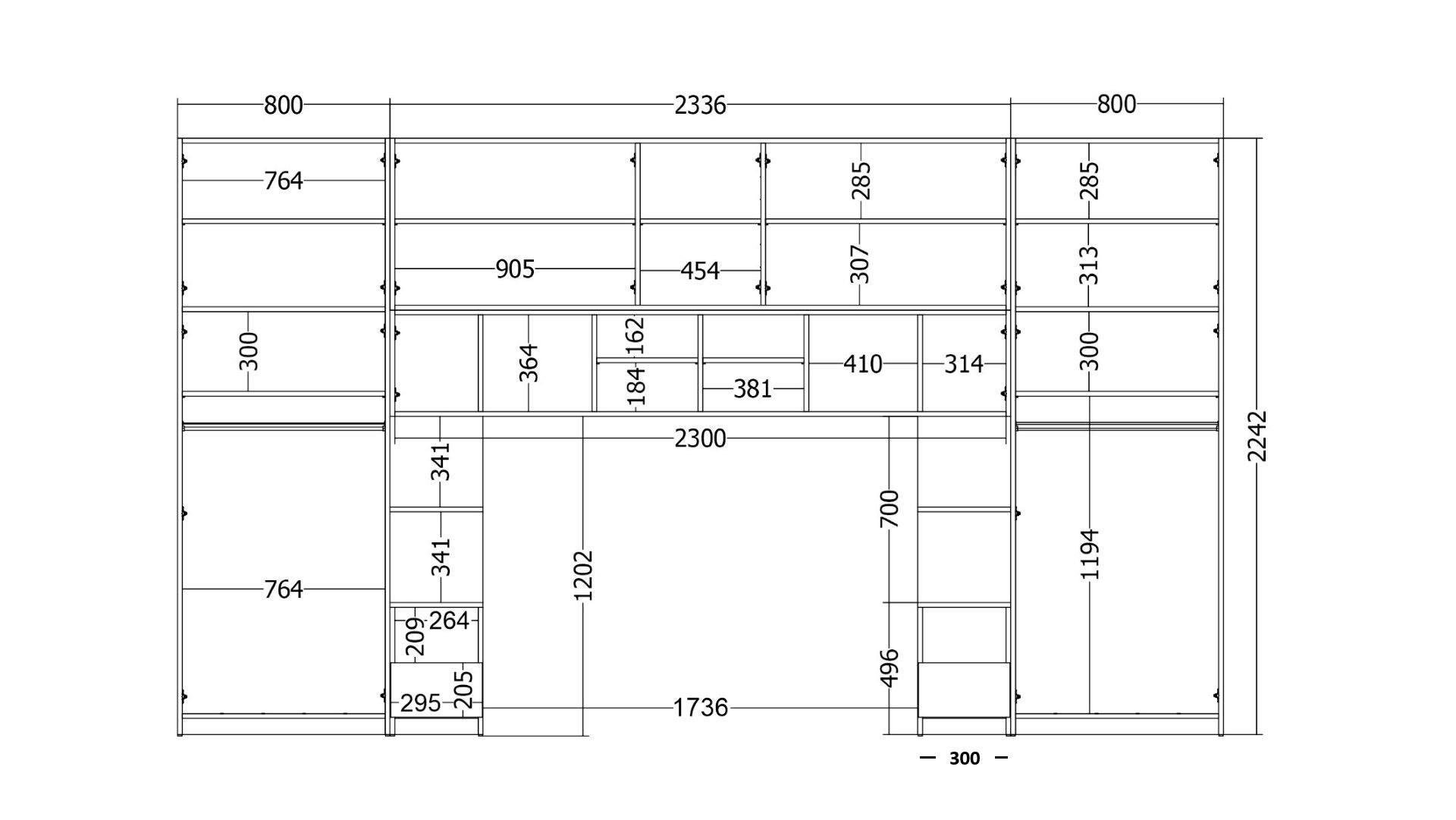 Sienelės konstrukcija yra itin stabili. Visi komponentai gaminami iš 18 mm storio dvipusės laminuotos „Woodeco“ plokštės. Ši medžiaga pasižymi dideliu atsparumu apkrovoms. Sistemą sudaro dvi 800 mm pločio šoninės spintos su kabyklomis. Viršutinė dalis turi talpias antresolines spinteles. Bendri sistemos matmenys yra 3940 mm plotis, 2250 mm aukštis ir 540 mm gylis. Tai sukuria labai didelę erdvę daiktams laikyti.