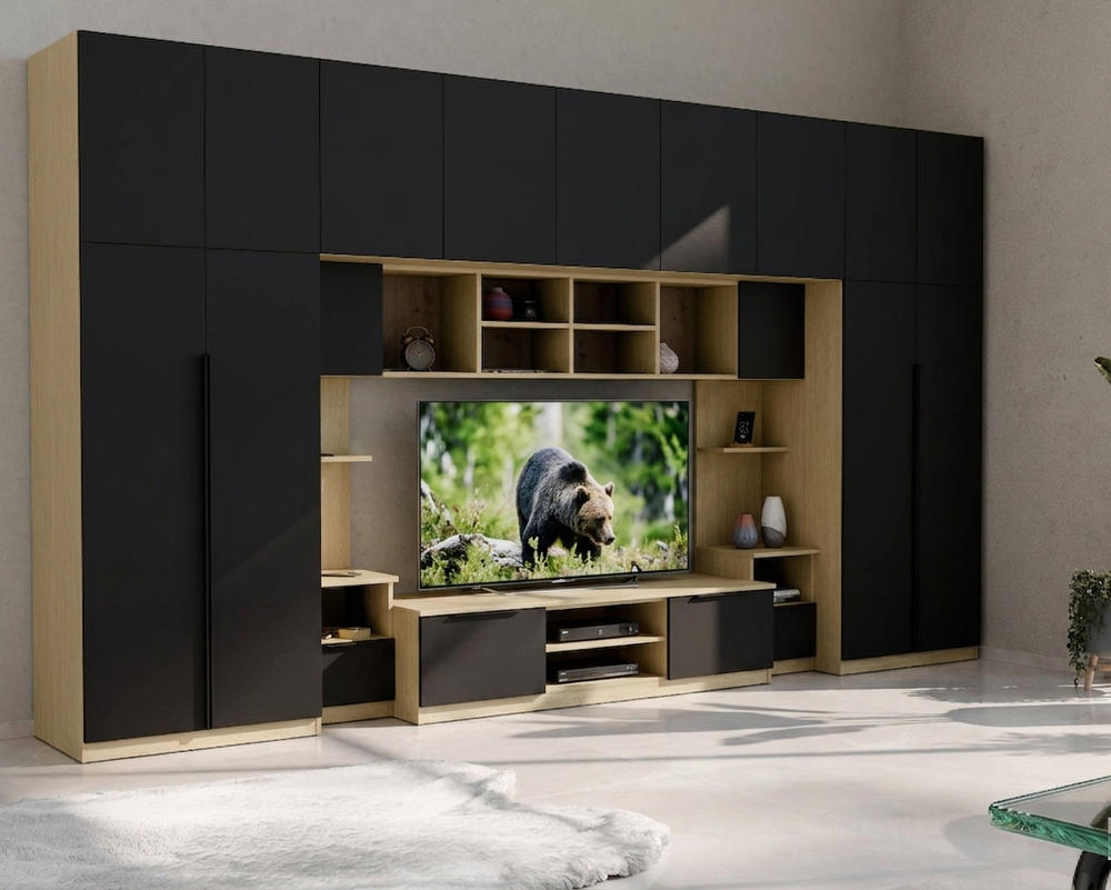 Ąžuolo Artisan ir matinės juodos spalvų derinys atrodo moderniai. Baldas yra labai praktiškas. Visi komponentai padengti 0,8 mm storio PVC kraštu. Jis saugo nuo drėgmės valant patalpas. Dizainą pabrėžia minimalistinės HEXA kraštinės rankenos. Jos turi saugius užapvalintus kampus. 3 mm storio HDF galinė sienelė tiksliai atitinka korpuso spalvą. Ši modulinė sistema gali būti pritaikoma pagal jūsų poreikius. Galime keisti matmenis pagal individualų namų išplanavimą.