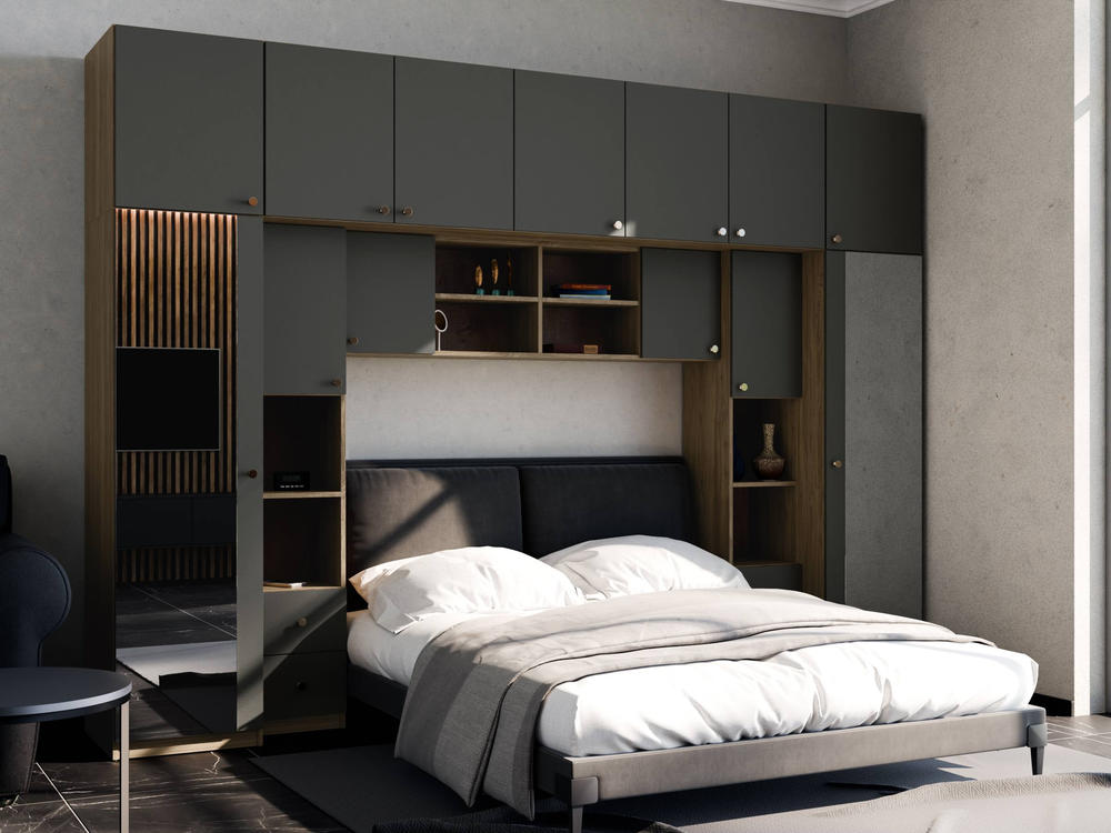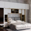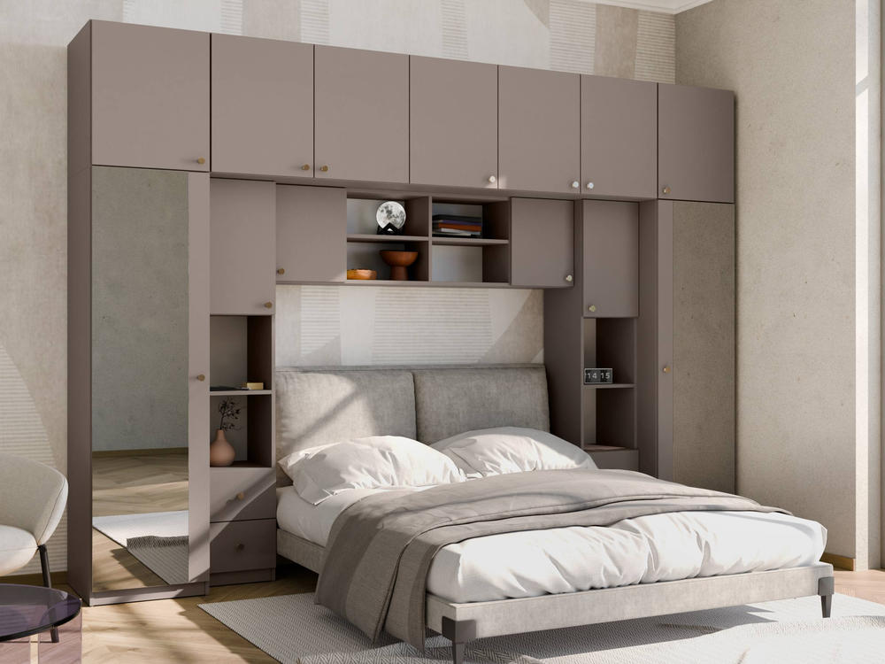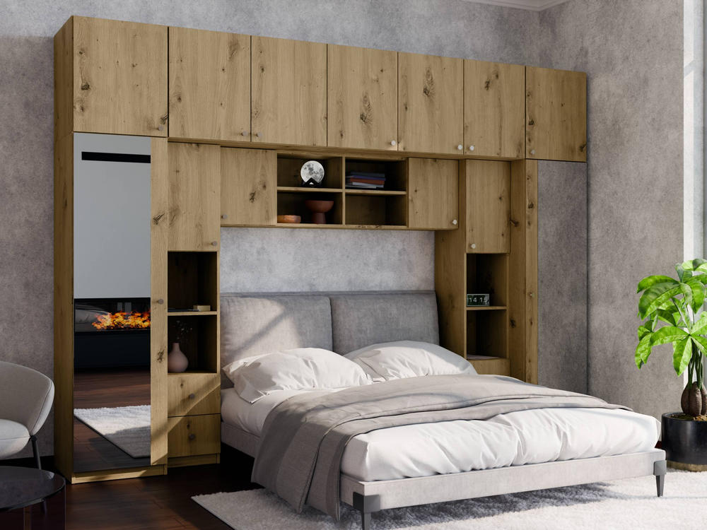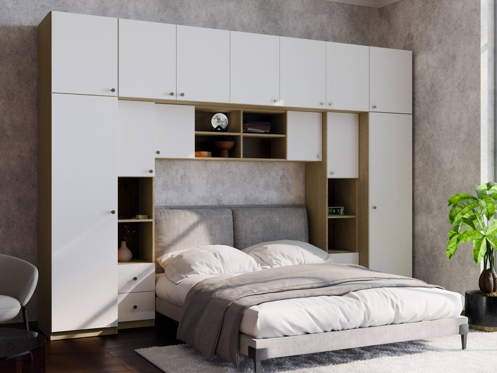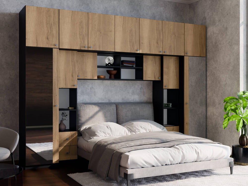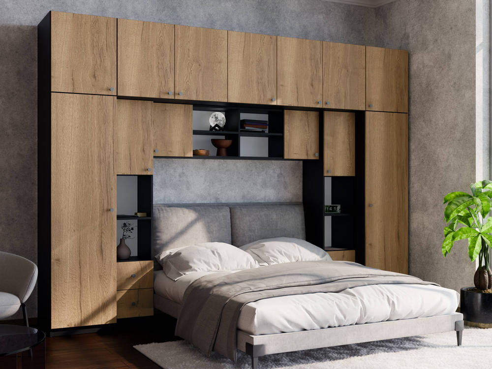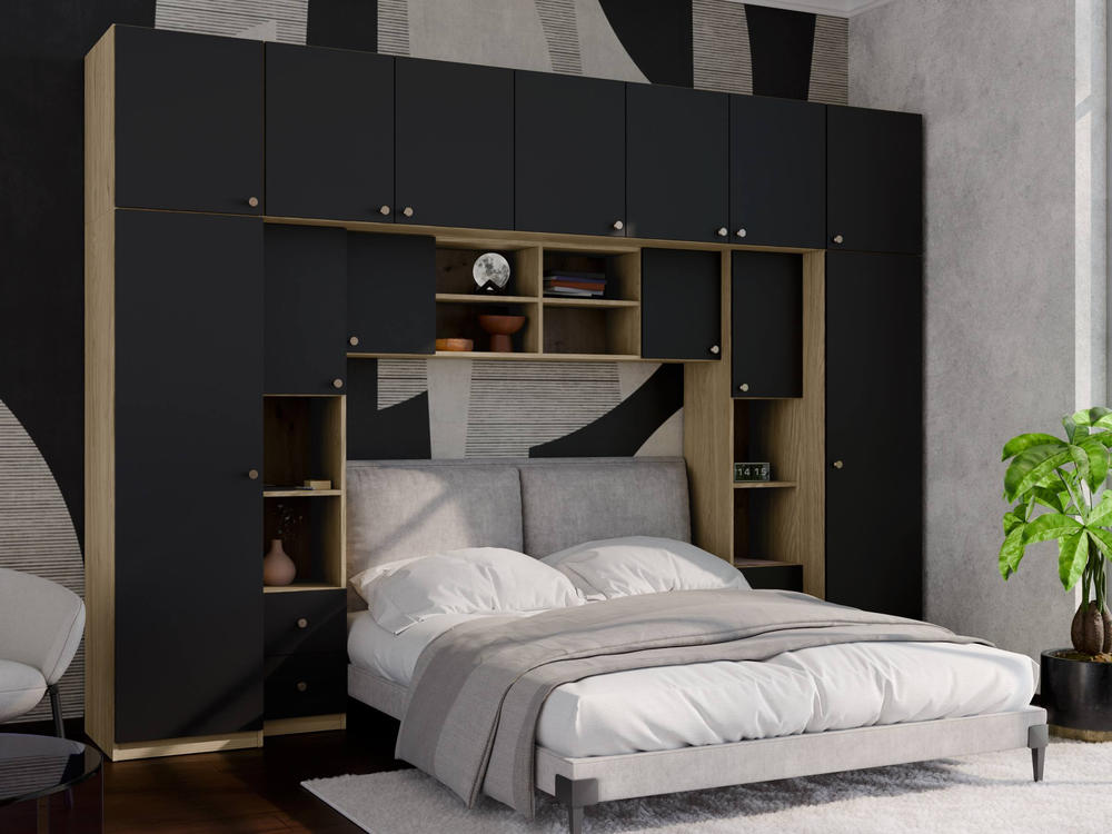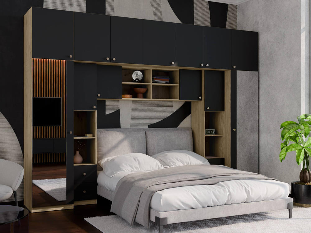 Baldo funkcionalumą užtikrina metalinės rankenėlės ir reguliuojamos kojelės. Tvirtos kojelės leidžia lengvai išlyginti spintelę ant nelygių grindų. Galimas platus spalvų pasirinkimas pagal jūsų interjerą. Papildomai galite pasirinkti veidrodžius ant vienos arba abiejų šoninių spintų. Bendri sistemos matmenys: 3340 mm plotis, 2400 mm aukštis ir 540 mm gylis. Atkreipiame dėmesį, kad lova ar TV staliukas į nurodytą kainą neįtraukti.
