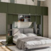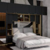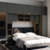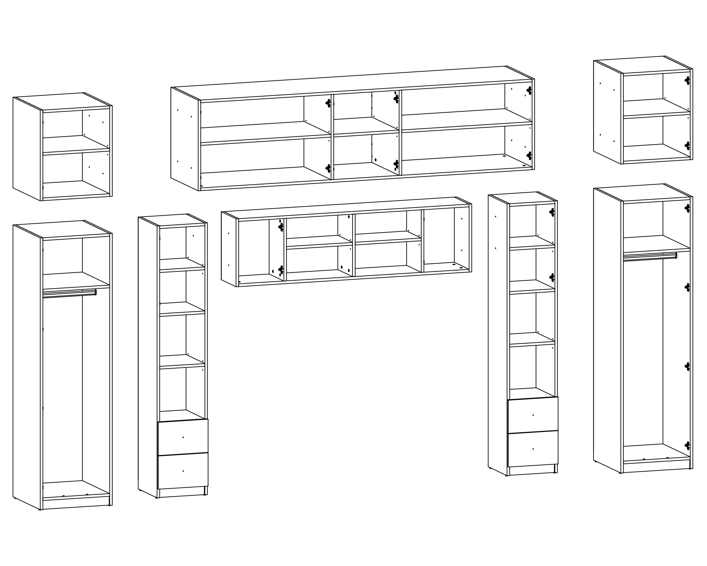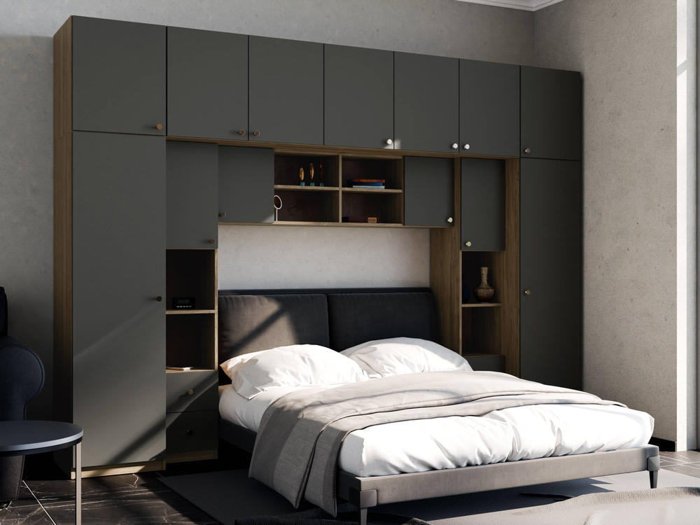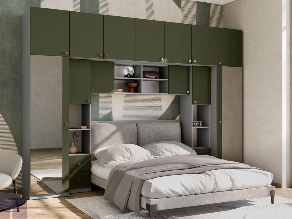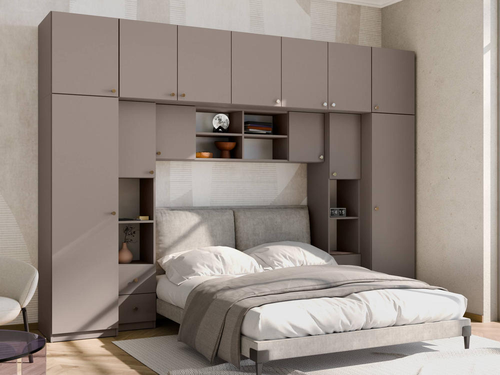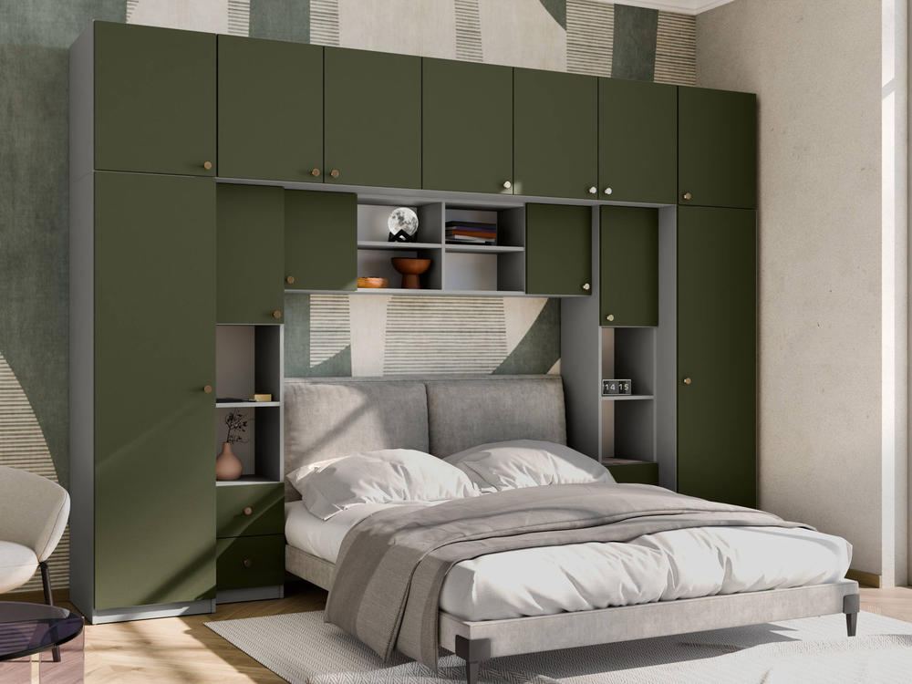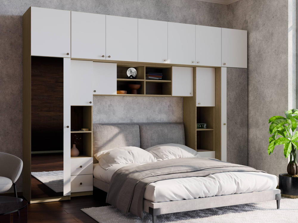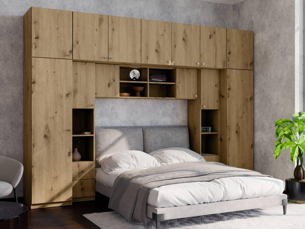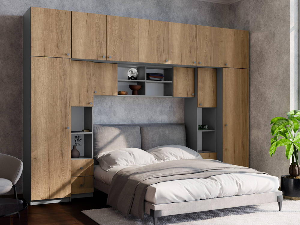 Baldo funkcionalumą užtikrina metalinės rankenėlės ir reguliuojamos kojelės. Tvirtos kojelės leidžia lengvai išlyginti spintelę ant nelygių grindų. Galimas platus spalvų pasirinkimas pagal jūsų interjerą. Papildomai galite pasirinkti veidrodžius ant vienos arba abiejų šoninių spintų. Bendri sistemos matmenys: 3340 mm plotis, 2400 mm aukštis ir 540 mm gylis. Atkreipiame dėmesį, kad lova ar TV staliukas į nurodytą kainą neįtraukti.