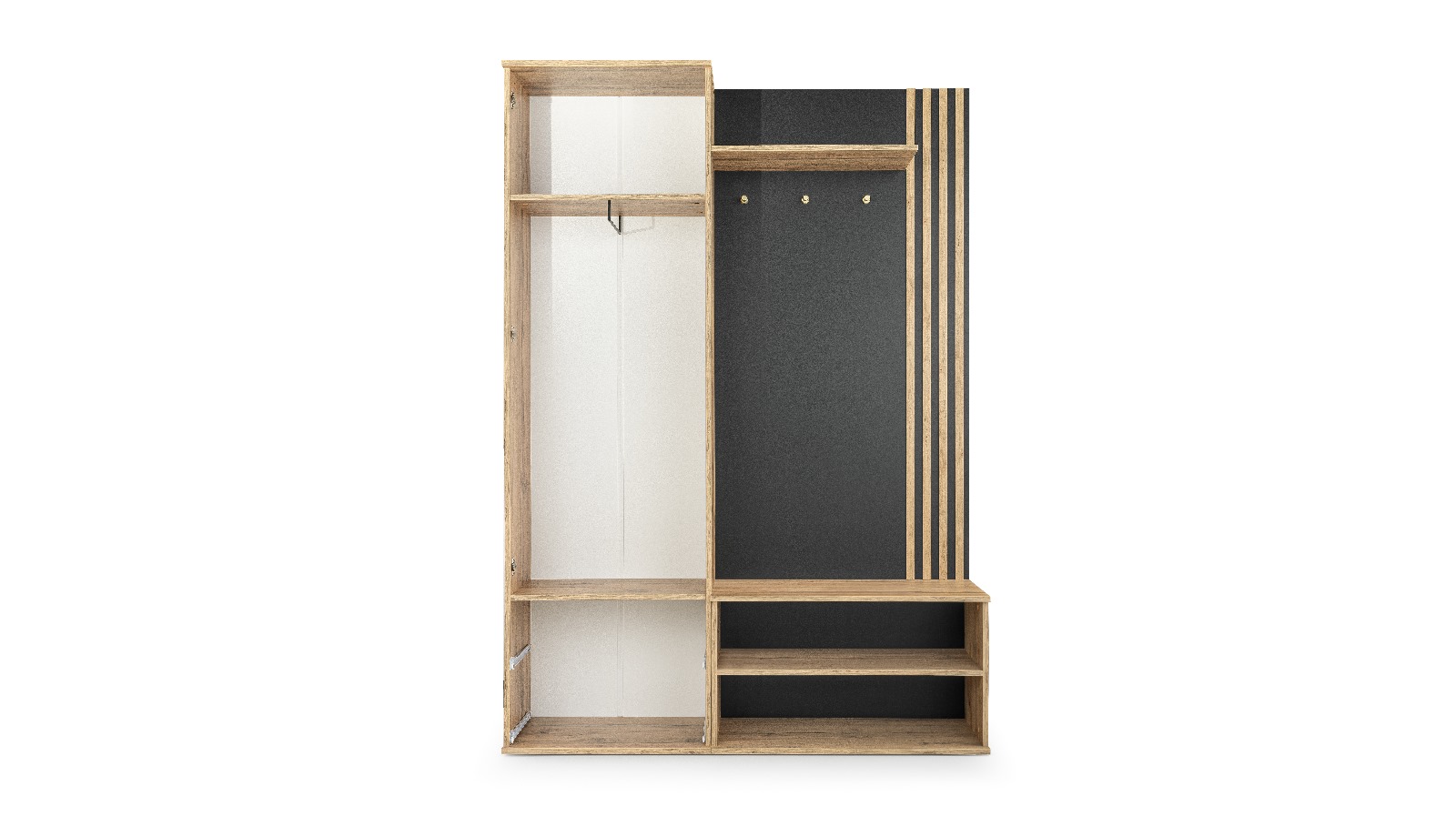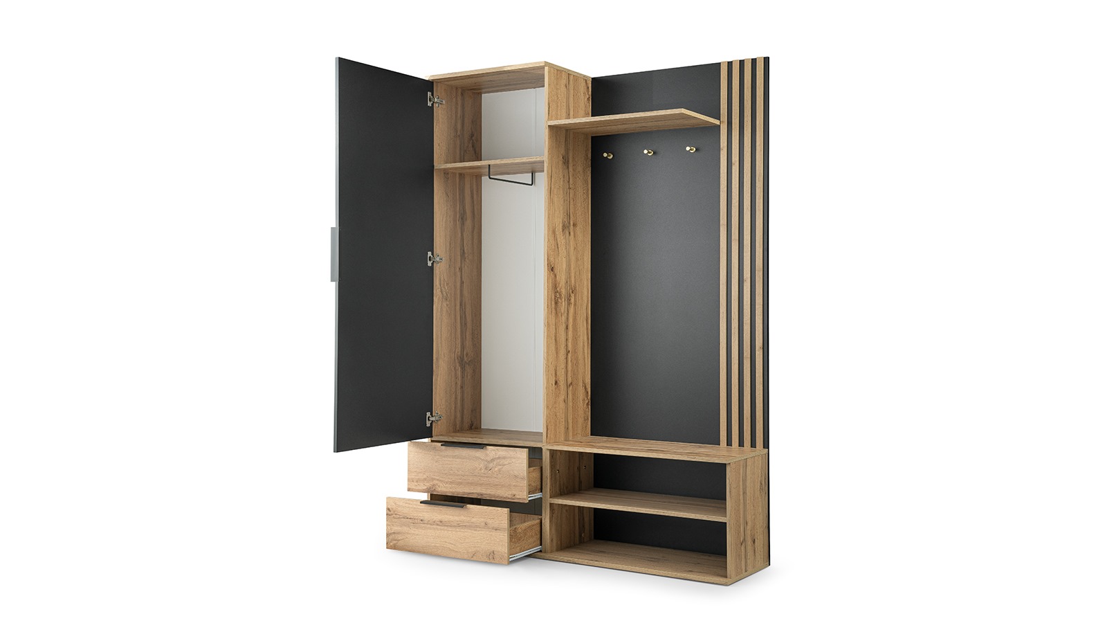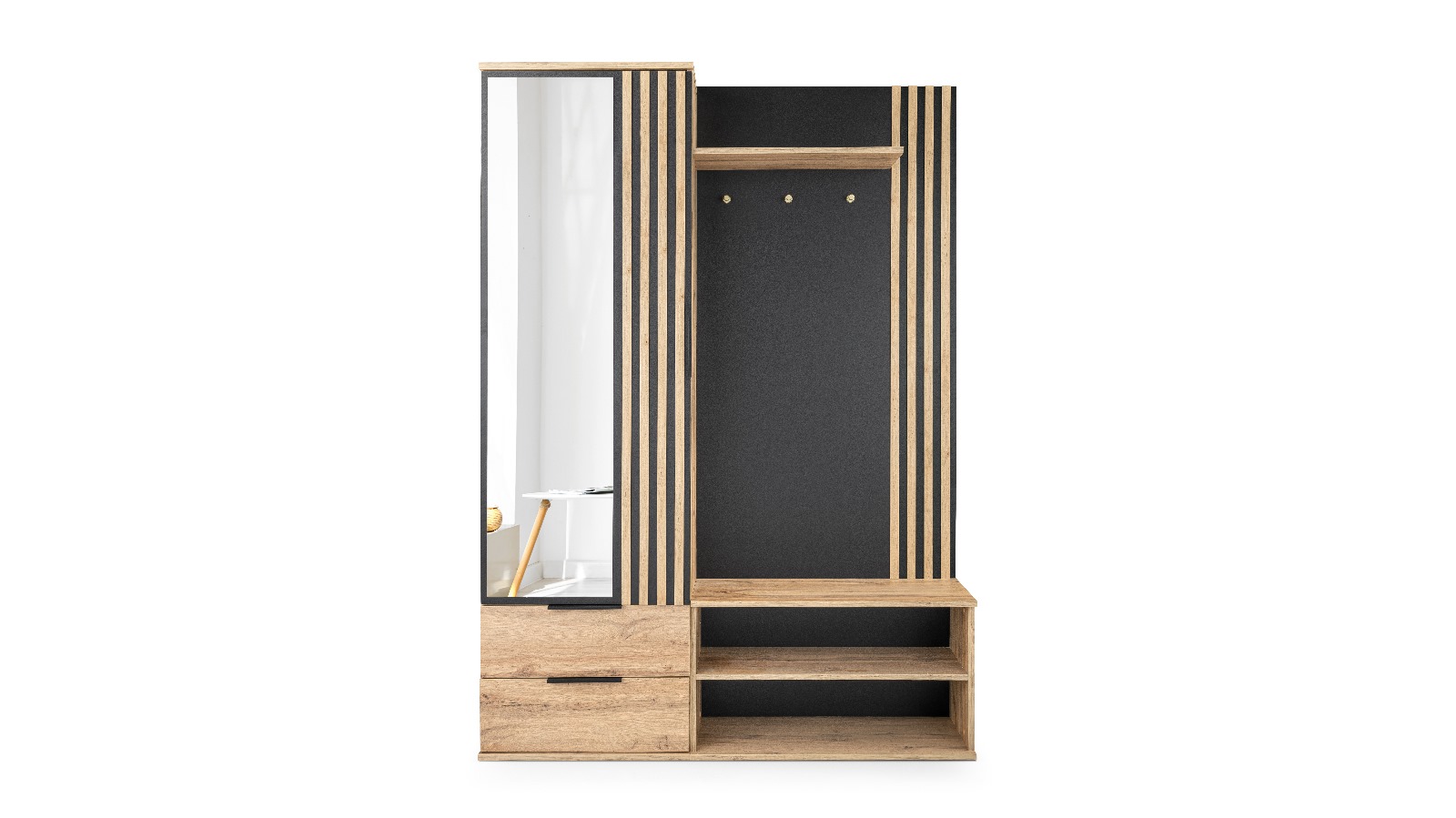 Prieškambario komplektas Lugo 140 su lamelėmis – praktiškas ir šiuolaikiškas pasirinkimas Jūsų namams. Dėl savo konstrukcijos jis leidžia patogiai susidėti drabužius, avalynę bei kitus kasdien naudojamus daiktus. Komplekte yra vieta pakabinti drabužiams, lentynos bei stalčiai, kurie padeda palaikyti tvarką prieškambaryje. Integruotas veidrodis suteikia papildomo funkcionalumo ir padeda vizualiai padidinti erdvę. Baldas pagamintas iš LMDP plokštės, kurios storis 16 mm. Naudojamos plastikinės rankenėlės. Spalvų derinys – wotan ąžuolas ir juoda – suteikia modernų ir kontrastingą vaizdą, kuris lengvai pritaikomas įvairiuose interjeruose.