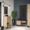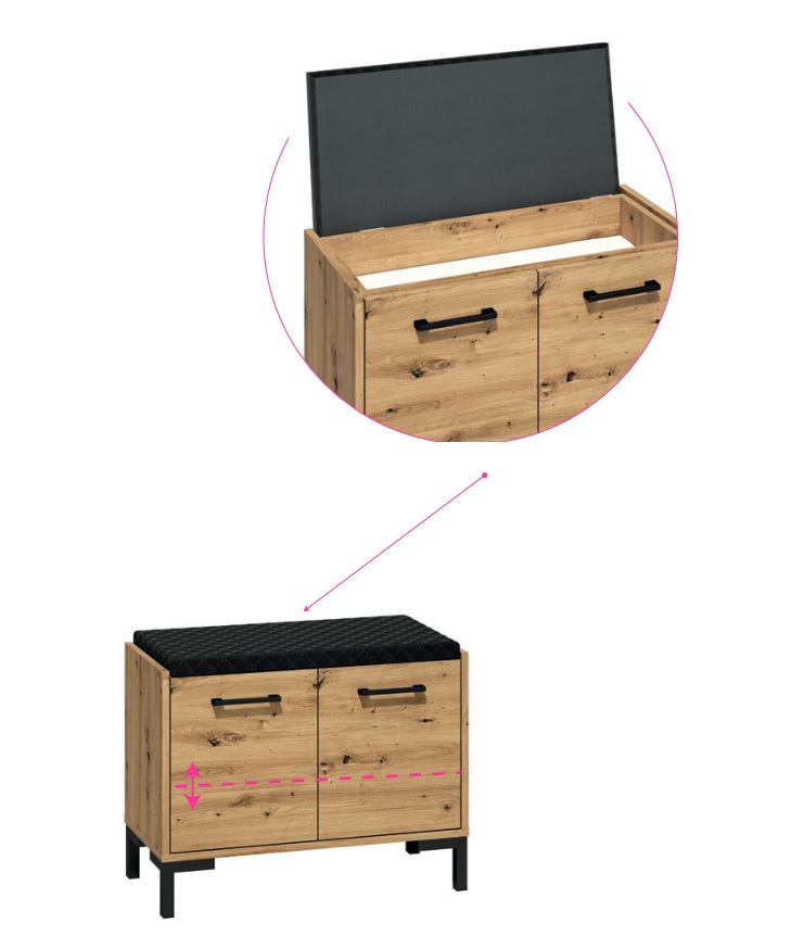 Stilingas ir funkcionalus prieškambario komplektas Nevio C, pagamintas iš kokybiško artisan ąžuolo. Komplektą sudaro paminkštinimas iš eko odos, veidrodis ir modulinė sistema. Kojelių aukštis 12 cm užtikrina patogų naudojimą. Plotis 245 cm – puikus sprendimas Jūsų prieškambariui.