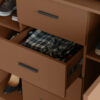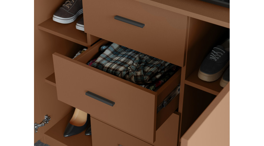 - Iš kokių medžiagų gaminama sekcija Atrium? Gamybai naudojama 18 mm storio „Woodeco“ laminuota plokštė ir 0,8 mm PVC briaunos. Rankenėlės pagamintos iš metalo.