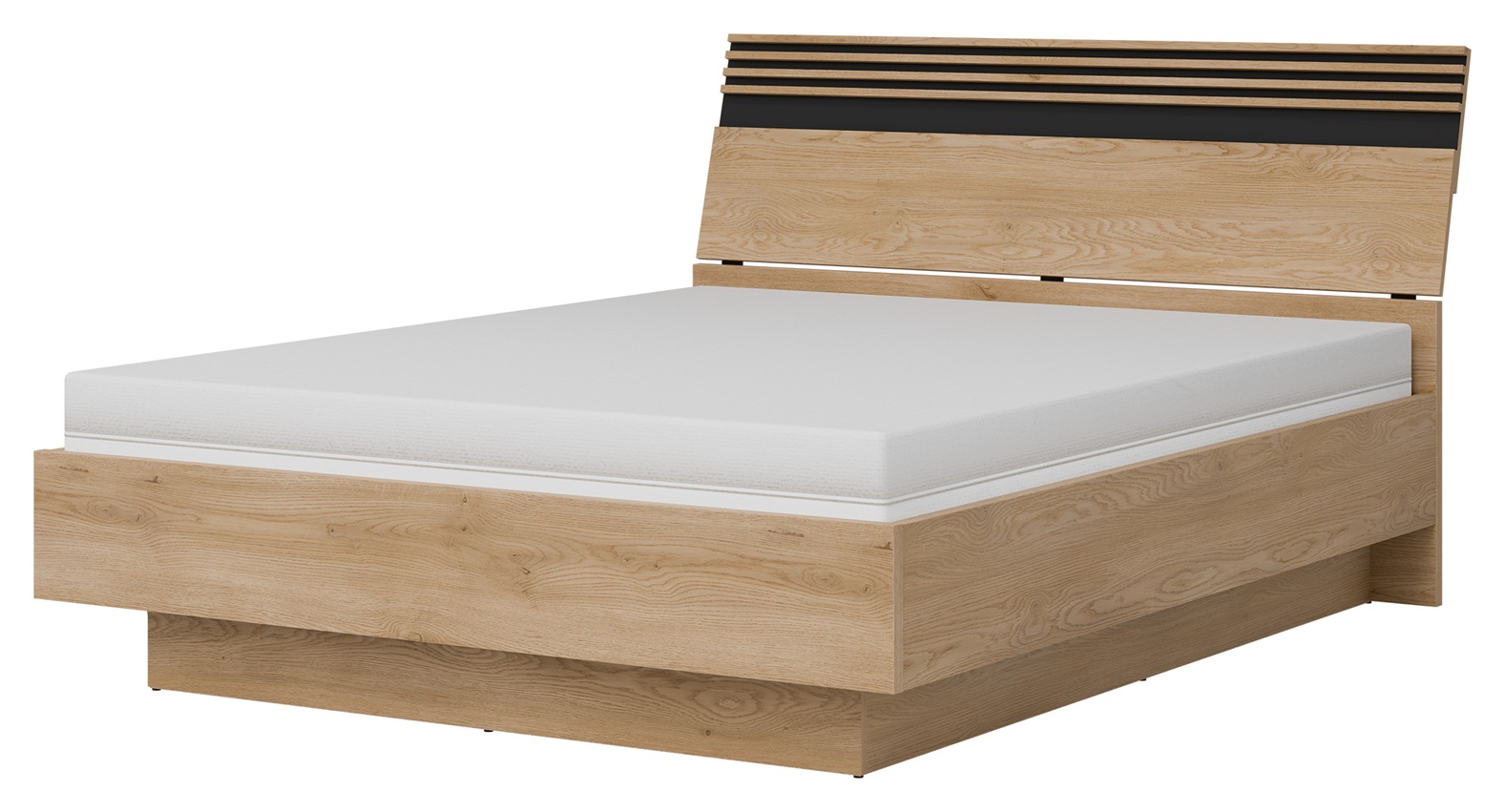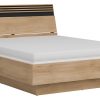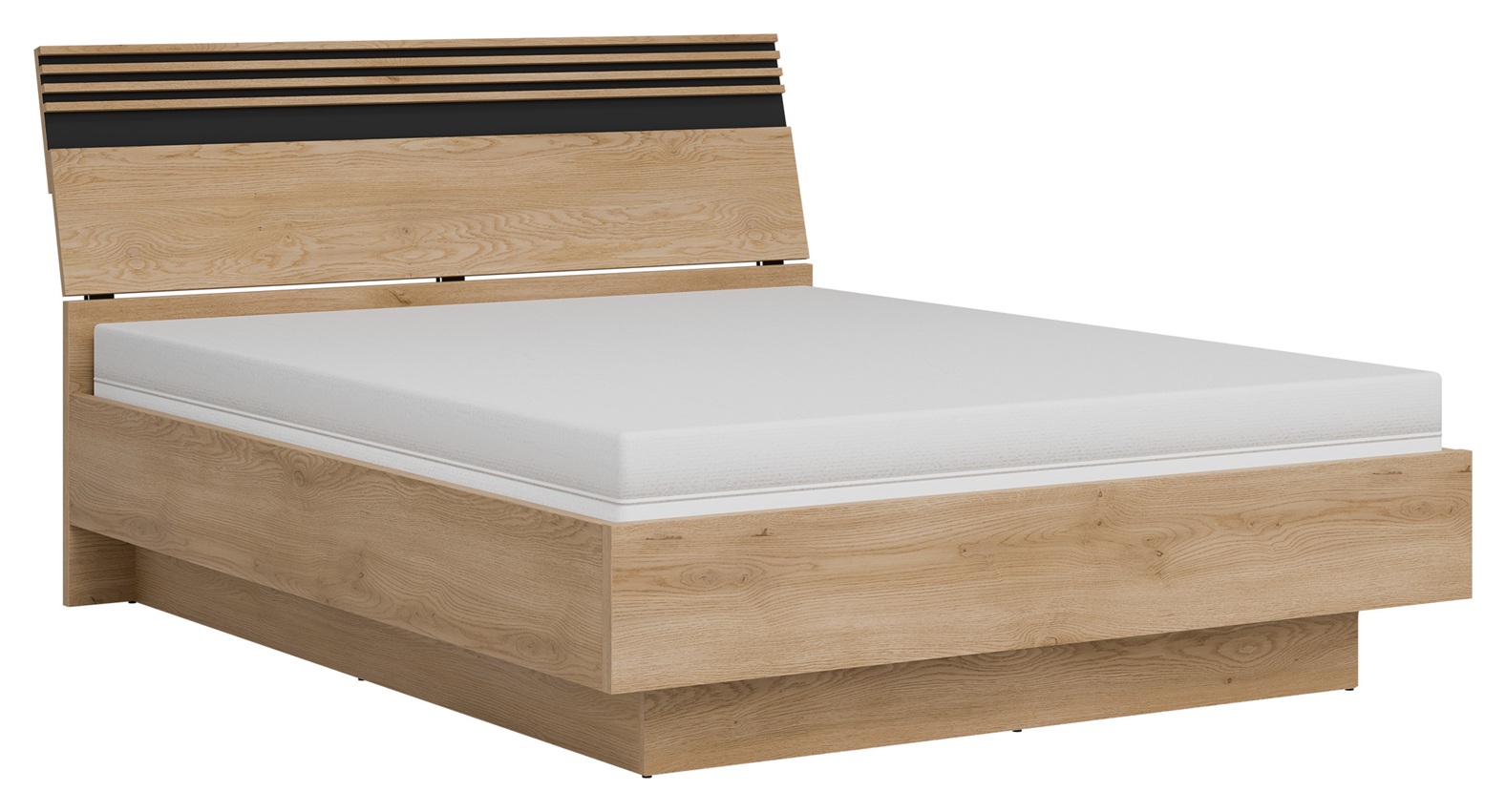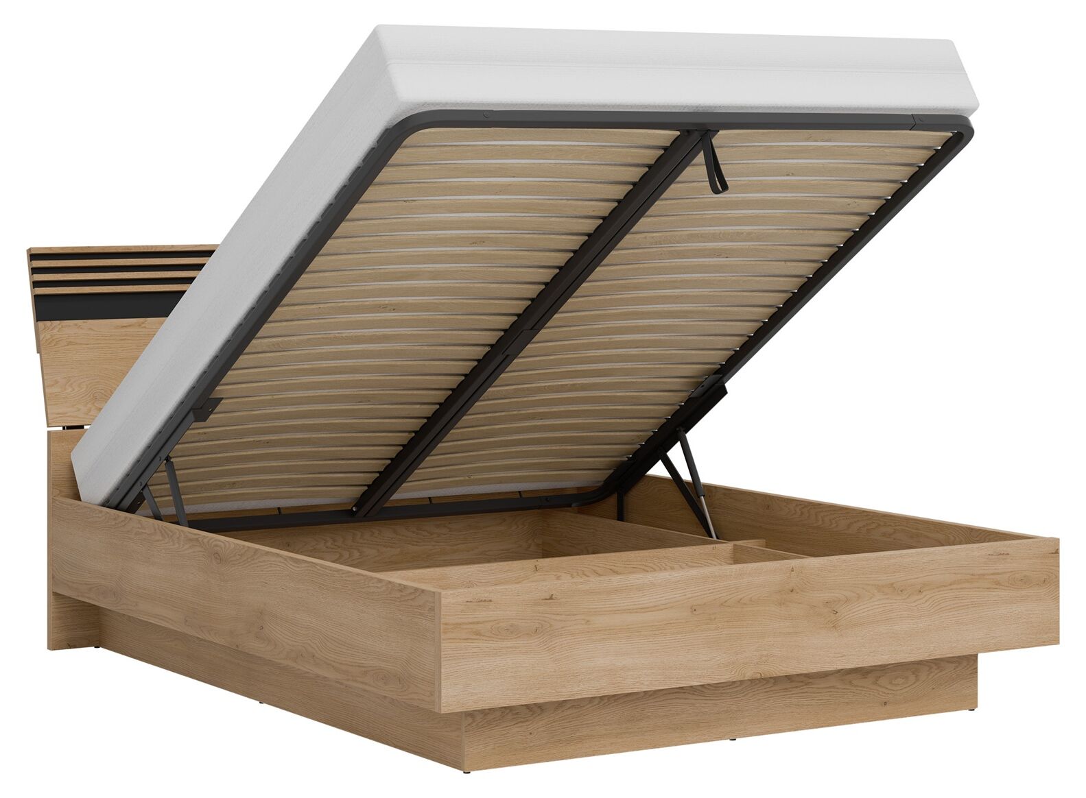Ferro lova 160×200 cm – erdvi ir patogi lova, puikiai tinkanti tiek poroms, tiek vienguliams mėgstantiems daugiau vietos. Konstrukcija sukurta iš kokybiško LMDP ir MDF, o metalinis grotelių rėmas užtikrina stabilumą ir ilgaamžiškumą. Lovos apačioje yra talpi patalynės dėžė su dujiniu pakėlimo mechanizmu, leidžianti patogiai laikyti namų tekstilę. Modernus ąžuolo ir juodos spalvų dizainas suteikia estetikos ir natūralumo jūsų miegamojo interjerui.